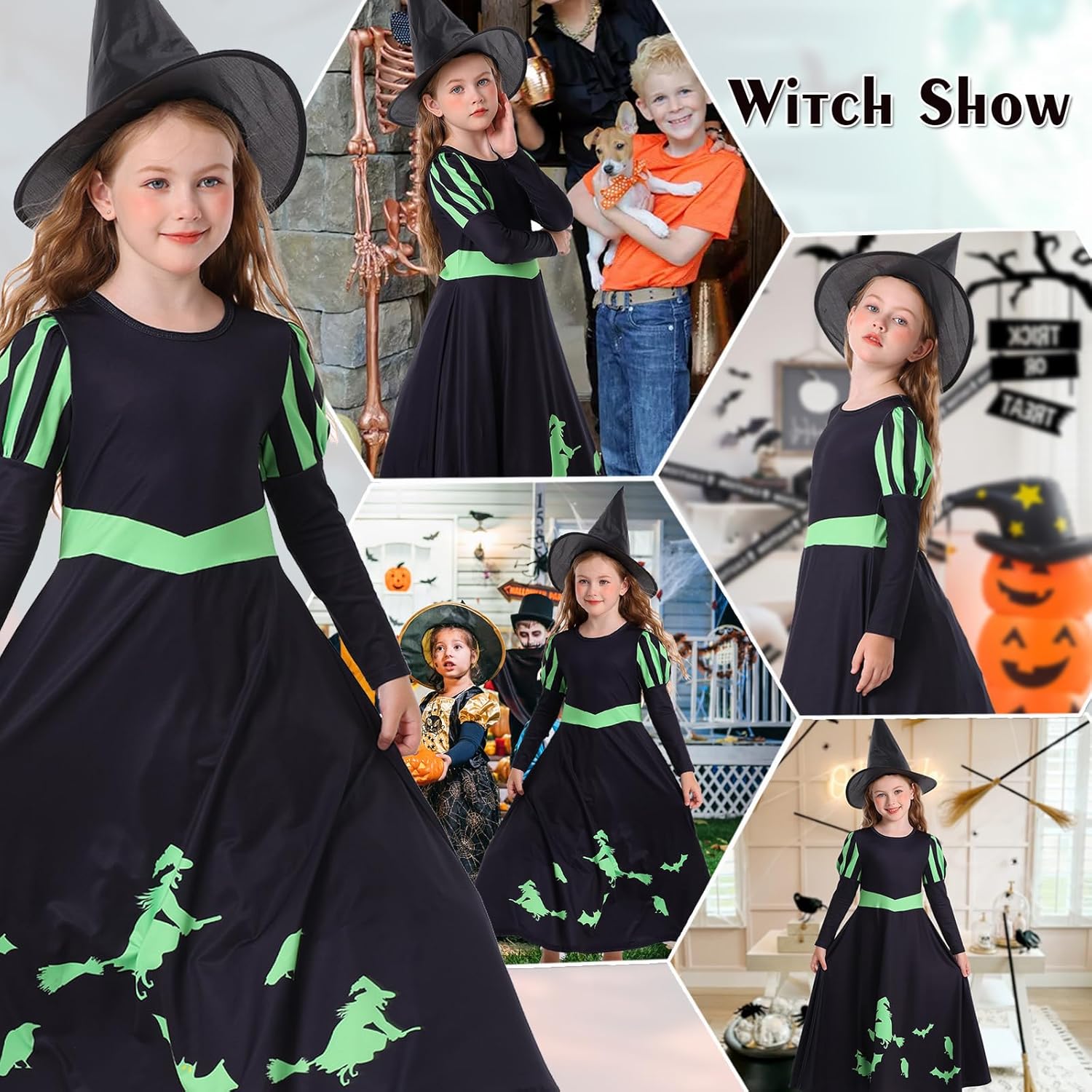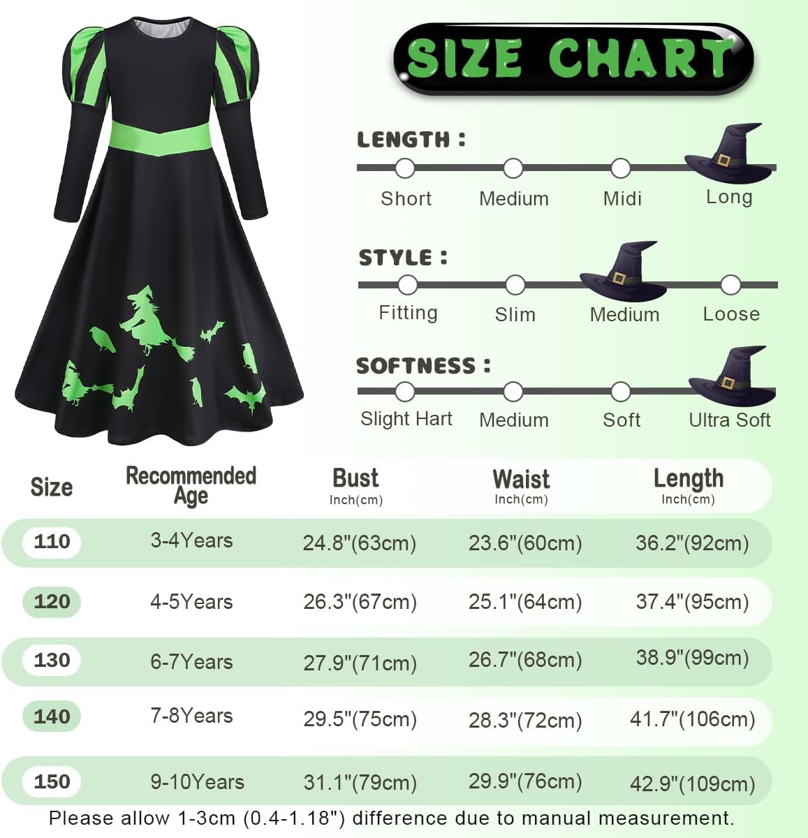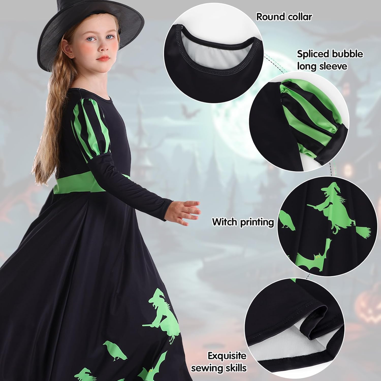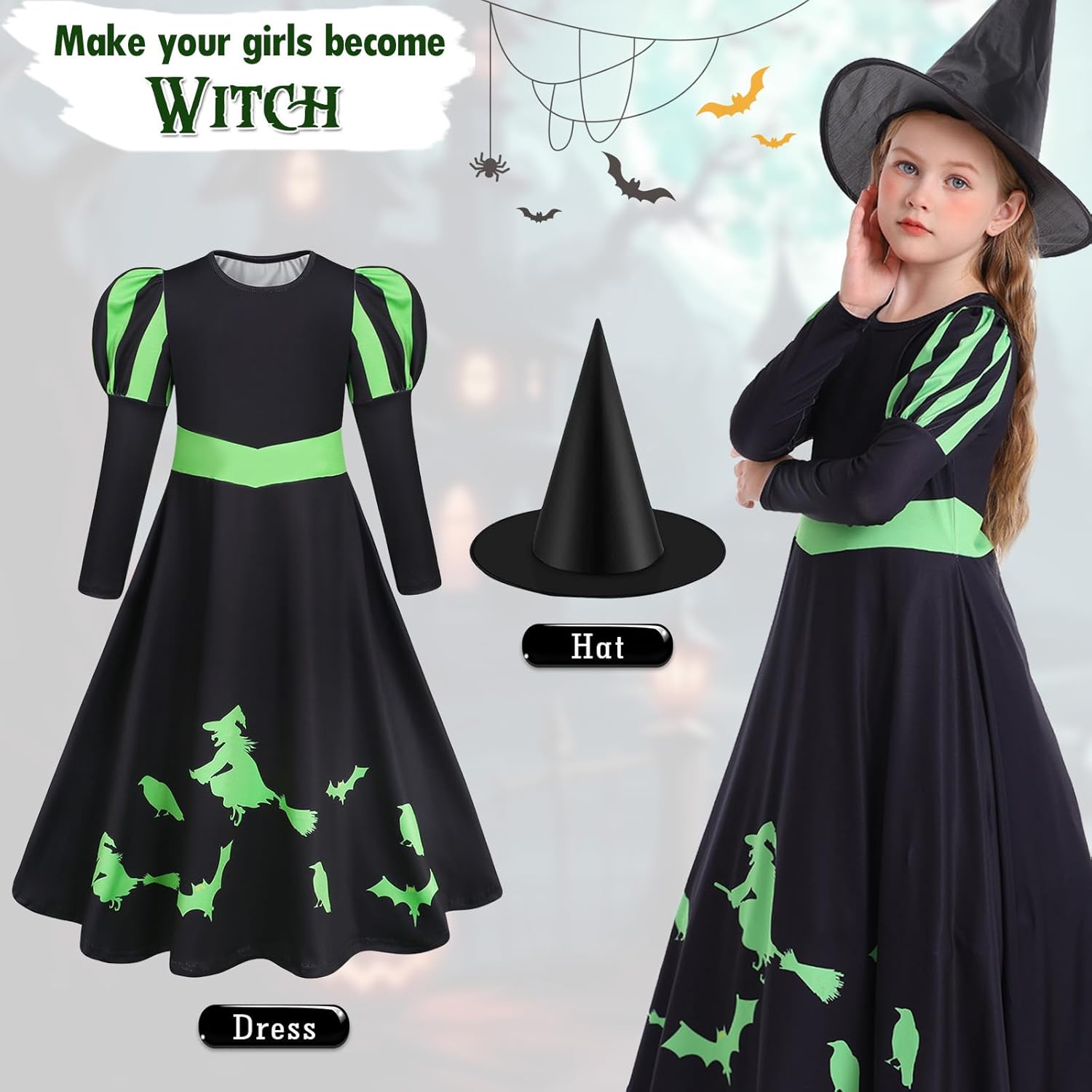 first and foremost the dress is VERY oversized - i know Alphaba has a longer dress but i thought this was ore 9-10 than 7-8 so size down! otherwise a nice black dress with witch print in green. The had is poor quality and pops out of the packaging but suitable for dress up to play the part