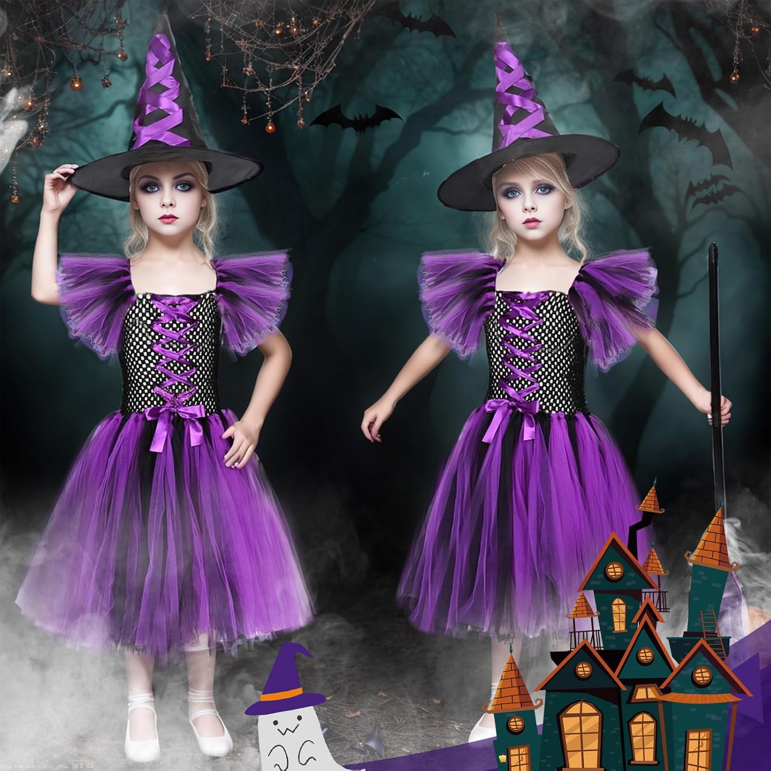 Costume da strega per ragazze, costume da strega per bambini con cappello da strega e scopa da strega, costume cosplay da strega per il carnevale di Halloween