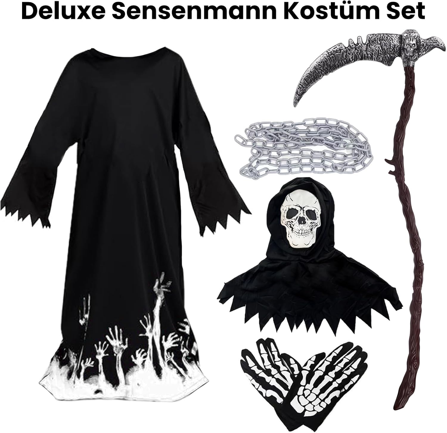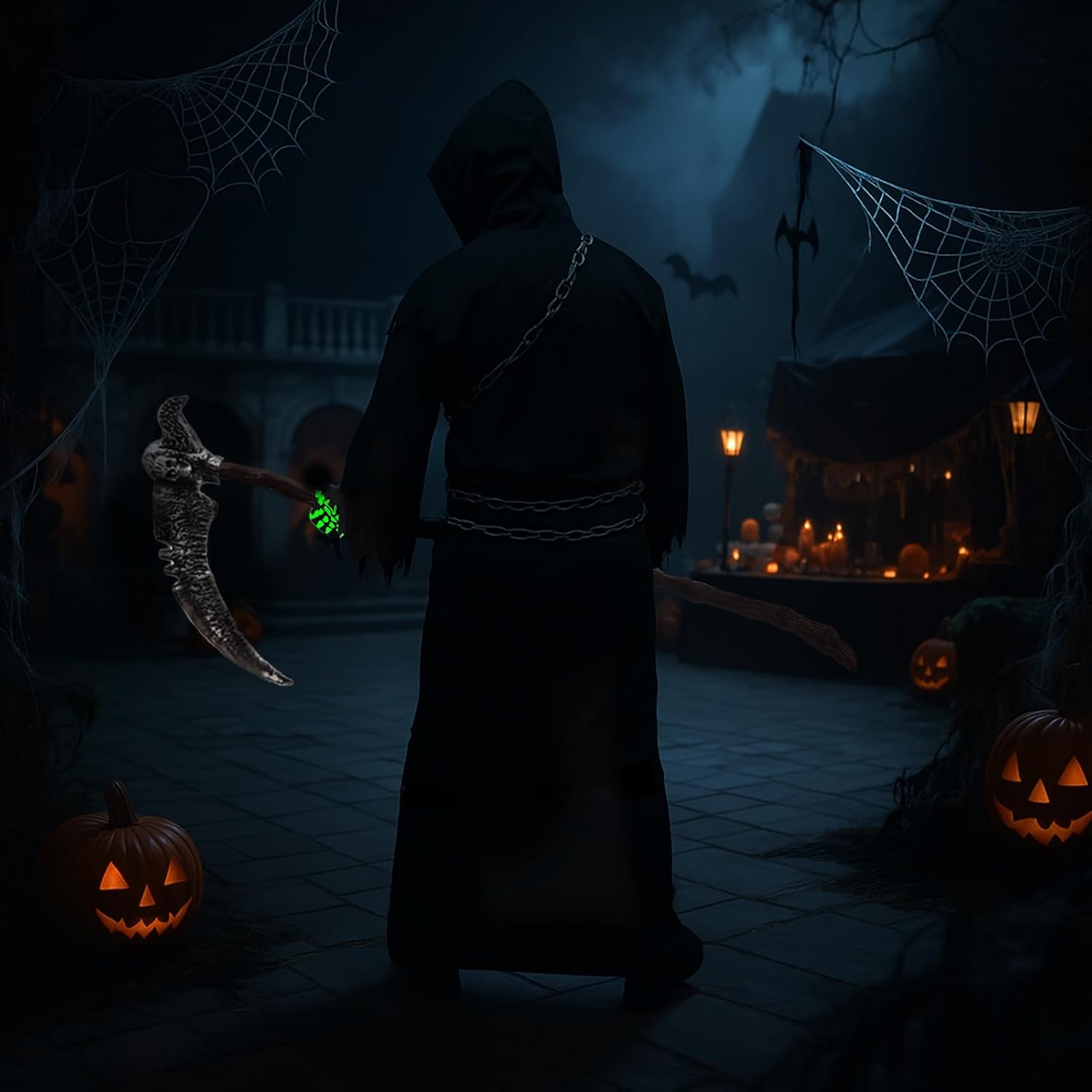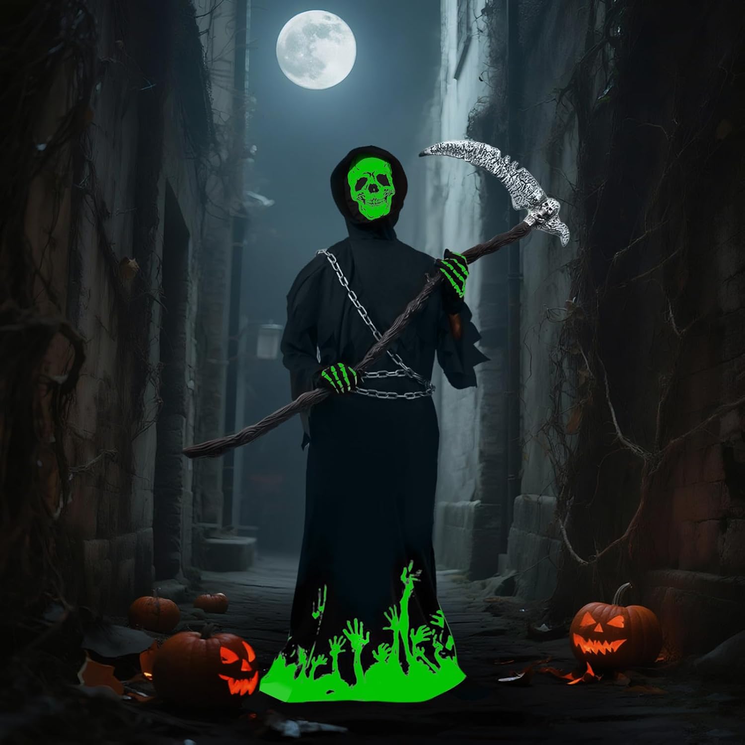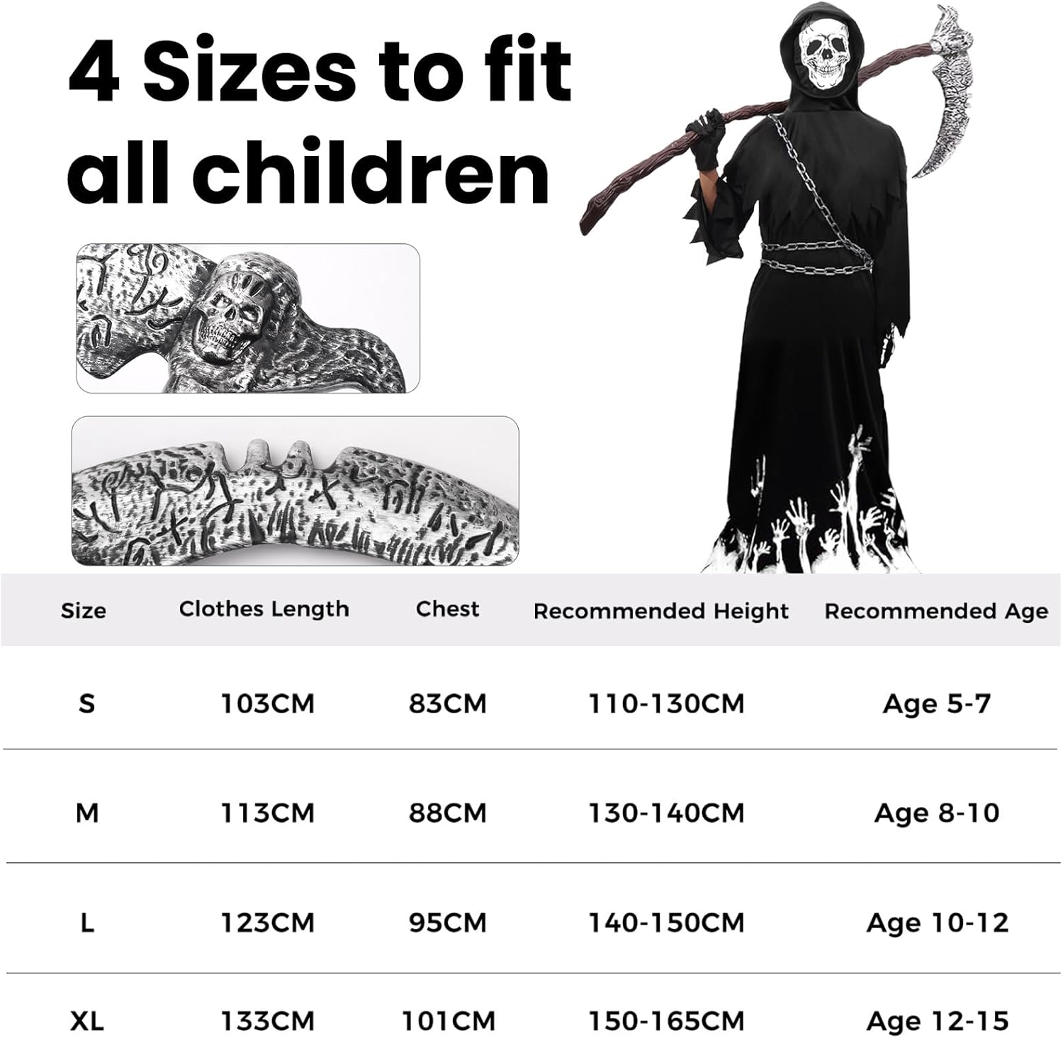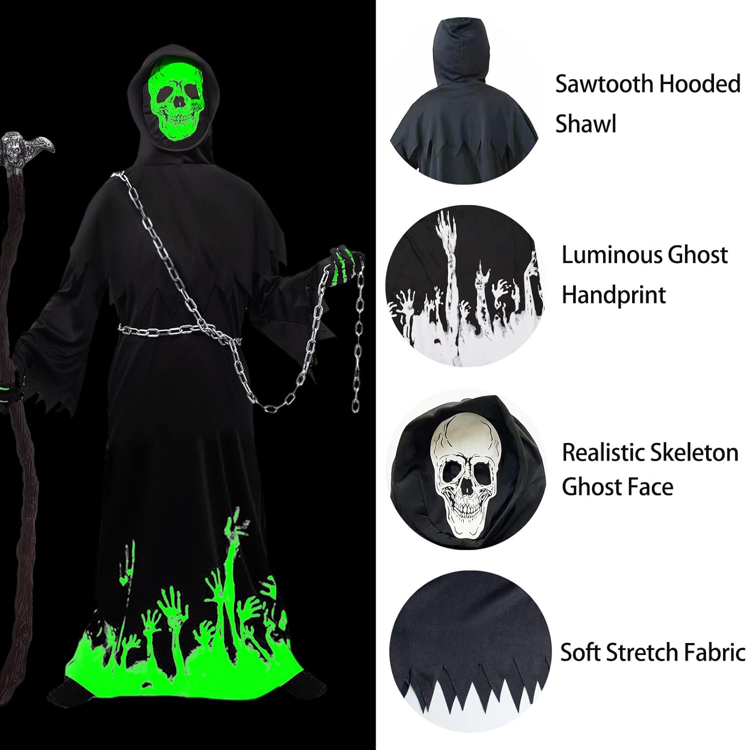 Costume da Tristo Mietitore per bambini con falce e catena in vita, Costume Deluxe che si illumina al buio per Halloween Costume da Tristo Mietitore per ragazzi inquietante Tristo Mietitore per travestimenti di Carnevale di Halloween