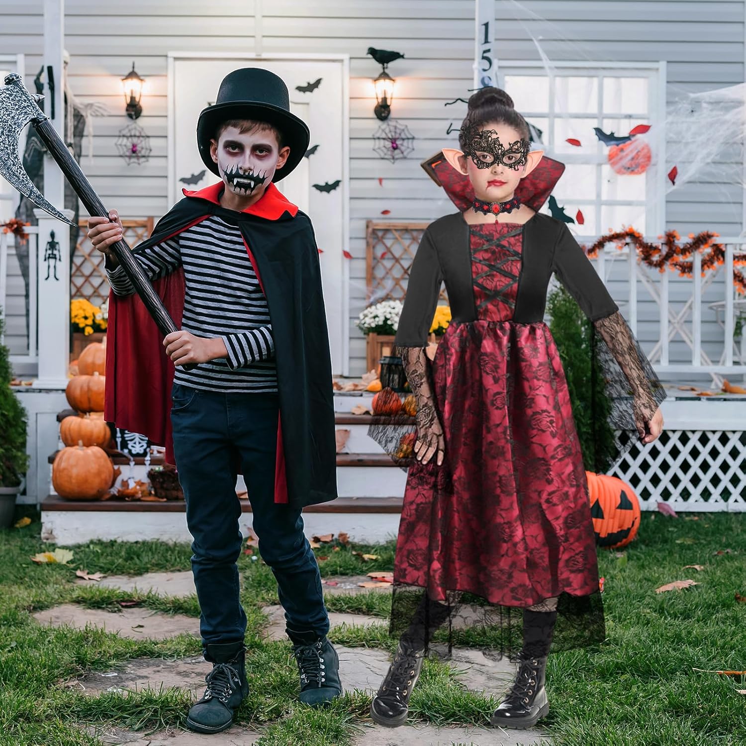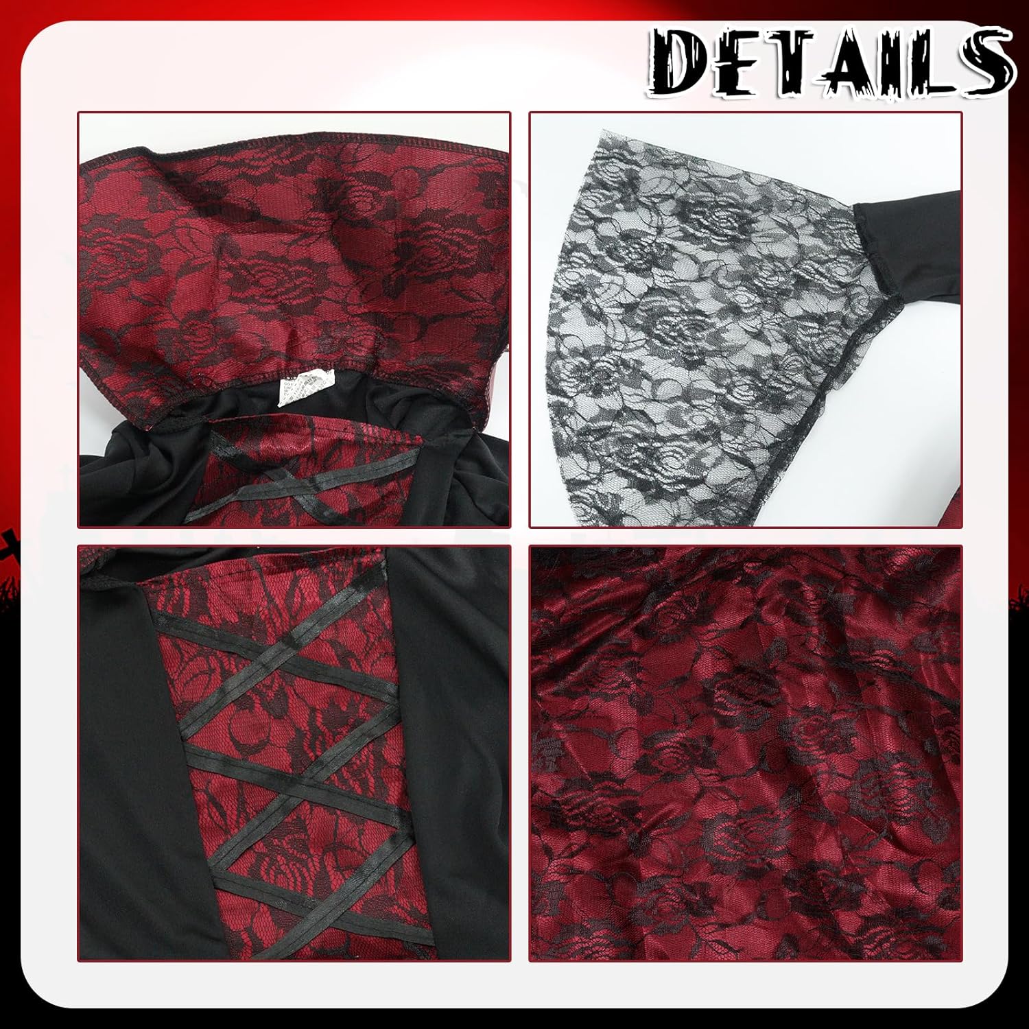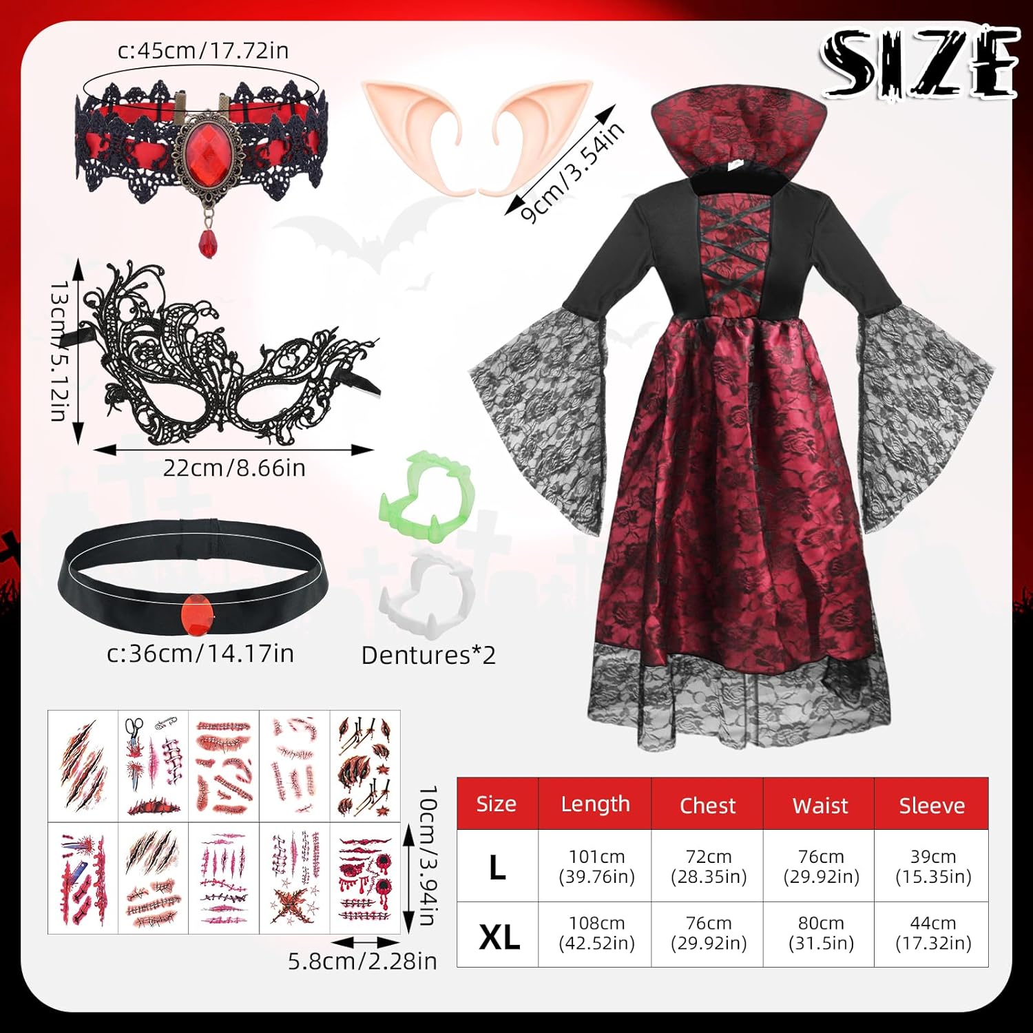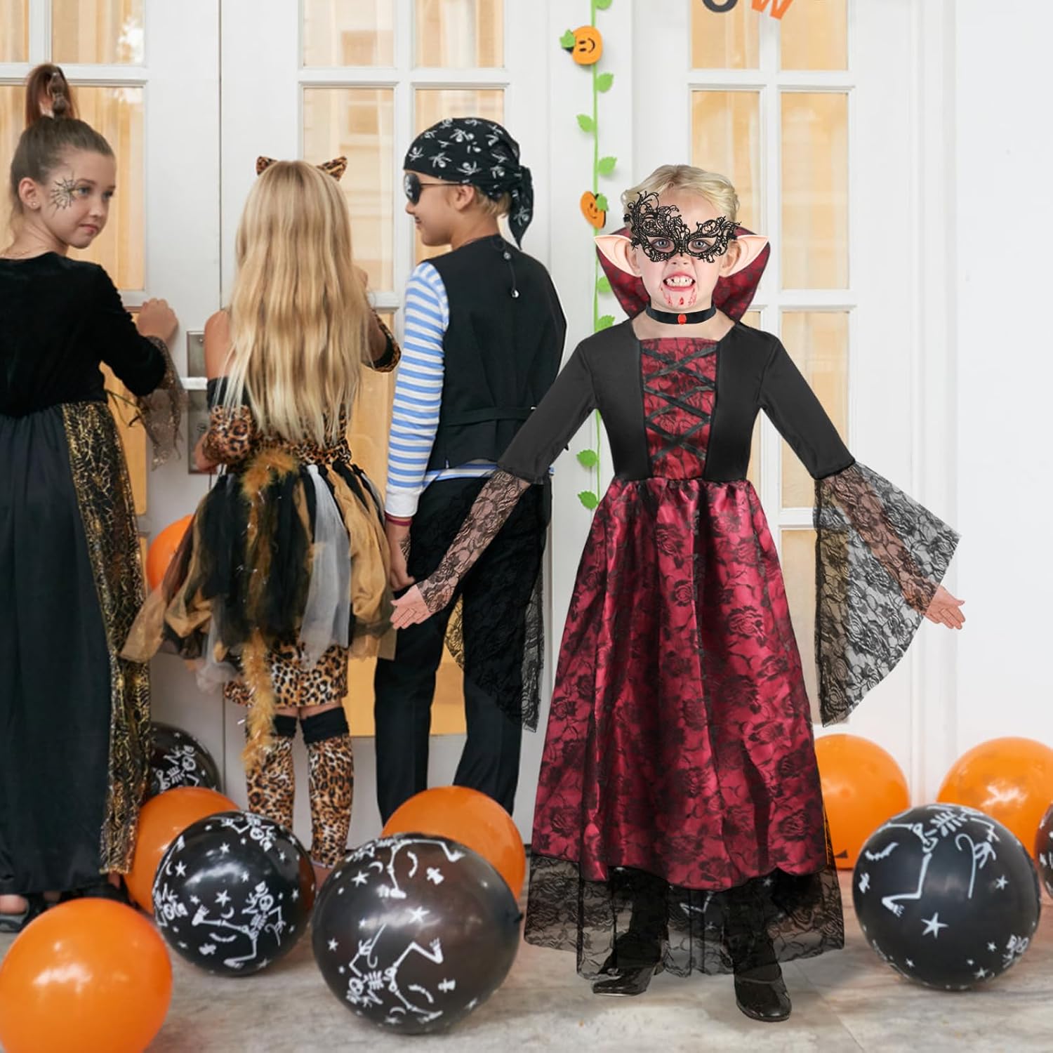 Descrizione prodotto Costume da vampiro da vampiro per bambine, costume da vampiro per bambini, costume gotico con collana, zanne, orecchie da elfo, benda per gli occhi, costume da vampiro vittoriano per Halloween, carnevale, feste cosplay Avviso di sicurezza No