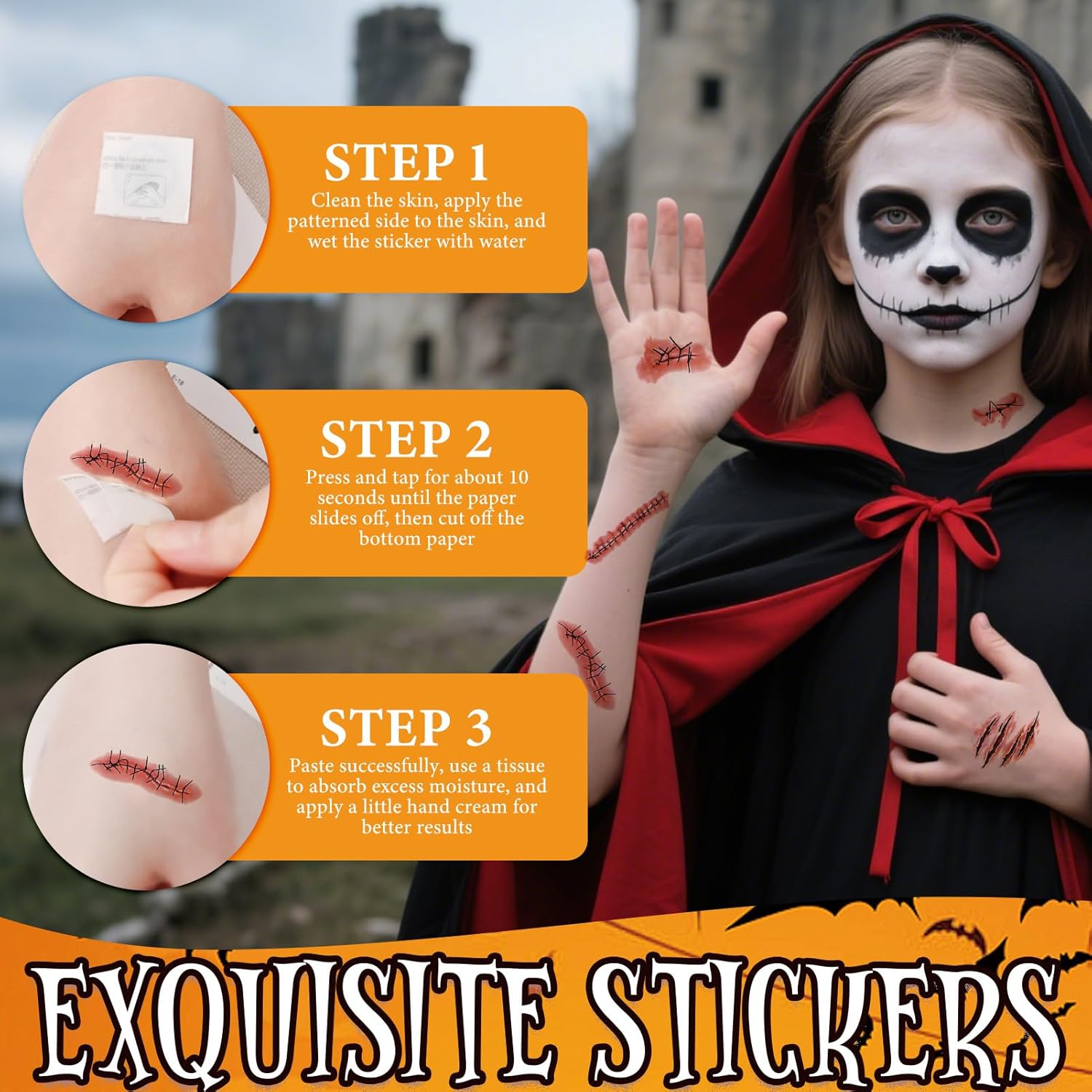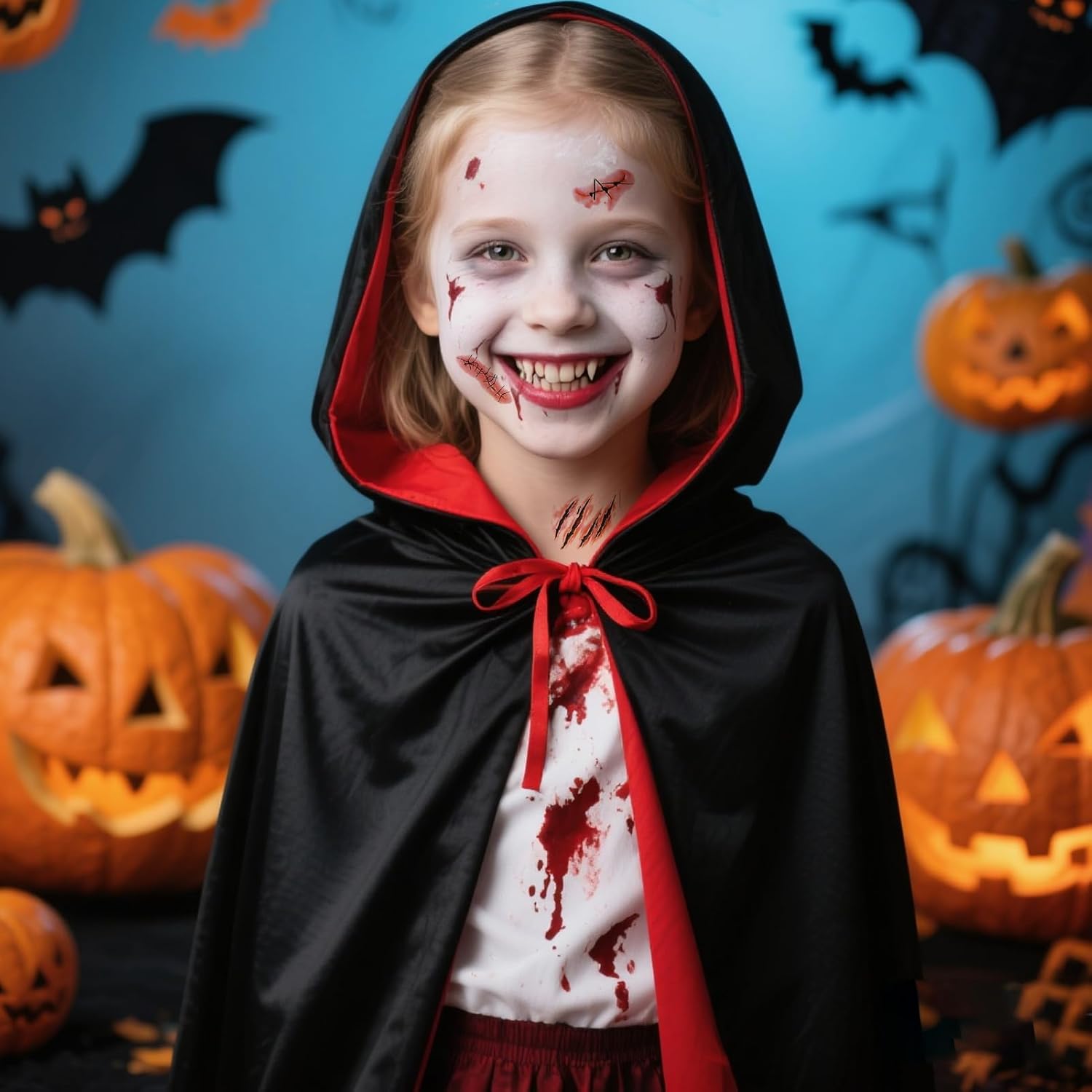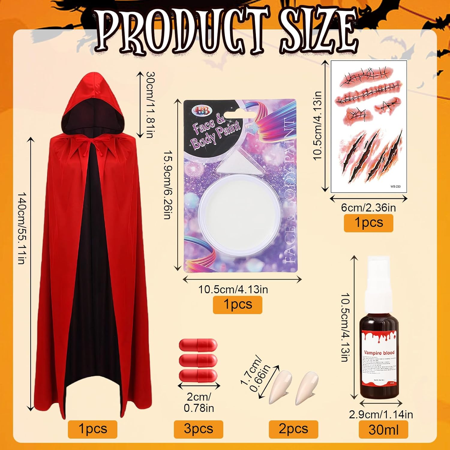 [Set di costumi da vampiro per bambini]: 1 mantello da vampiro, 2 zanne da vampiro (17 mm), 3 capsule di sangue finto, 1 dente finto (5 g), 1 spray di sangue finto (30 ml), 1 adesivo per tatuaggio cicatrice, 1 trucco bianco per il viso (20 g) e 1 spugna. Questo completo set di costumi da vampiro renderà il tuo bambino il centro dell'attenzione a qualsiasi festa [Materiali di alta qualità]: Realizzato in tessuto morbido, traspirante e confortevole. Alla luce del sole e della luce, il mantello assume una lucentezza spettrale color sangue, creando un effetto visivo sorprendente. Un costume perfetto per la festa di Halloween per bambini [Mantello reversibile con cappuccio]: Questo mantello reversibile è disponibile in nero e rosso. È dotato di chiusura con lacci e cappuccio, che conferisce al tuo bambino un aspetto ancora più misterioso. Una varietà di accessori è essenziale per aggiungere un tocco festoso a qualsiasi costume di Halloween [Ampie applicazioni]: Ideale per Halloween, carnevali, cosplay, spettacoli teatrali, balli in maschera, feste a tema vampiri e altro ancora. È anche un regalo di Halloween perfetto per i bambini [Due taglie disponibili]: Il nostro mantello da vampiro è disponibile in due taglie: 120 e 140. A causa della misurazione manuale, potrebbe esserci una deviazione di 1-3 cm. Grazie per la comprensione e il supporto
