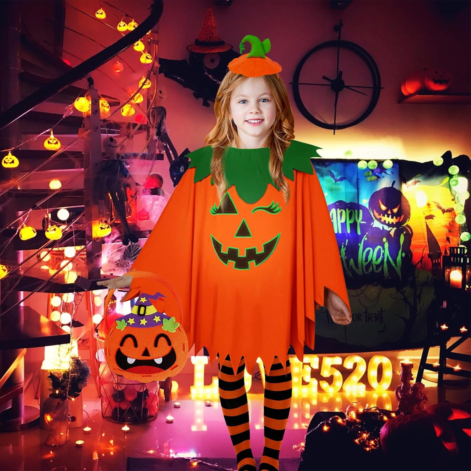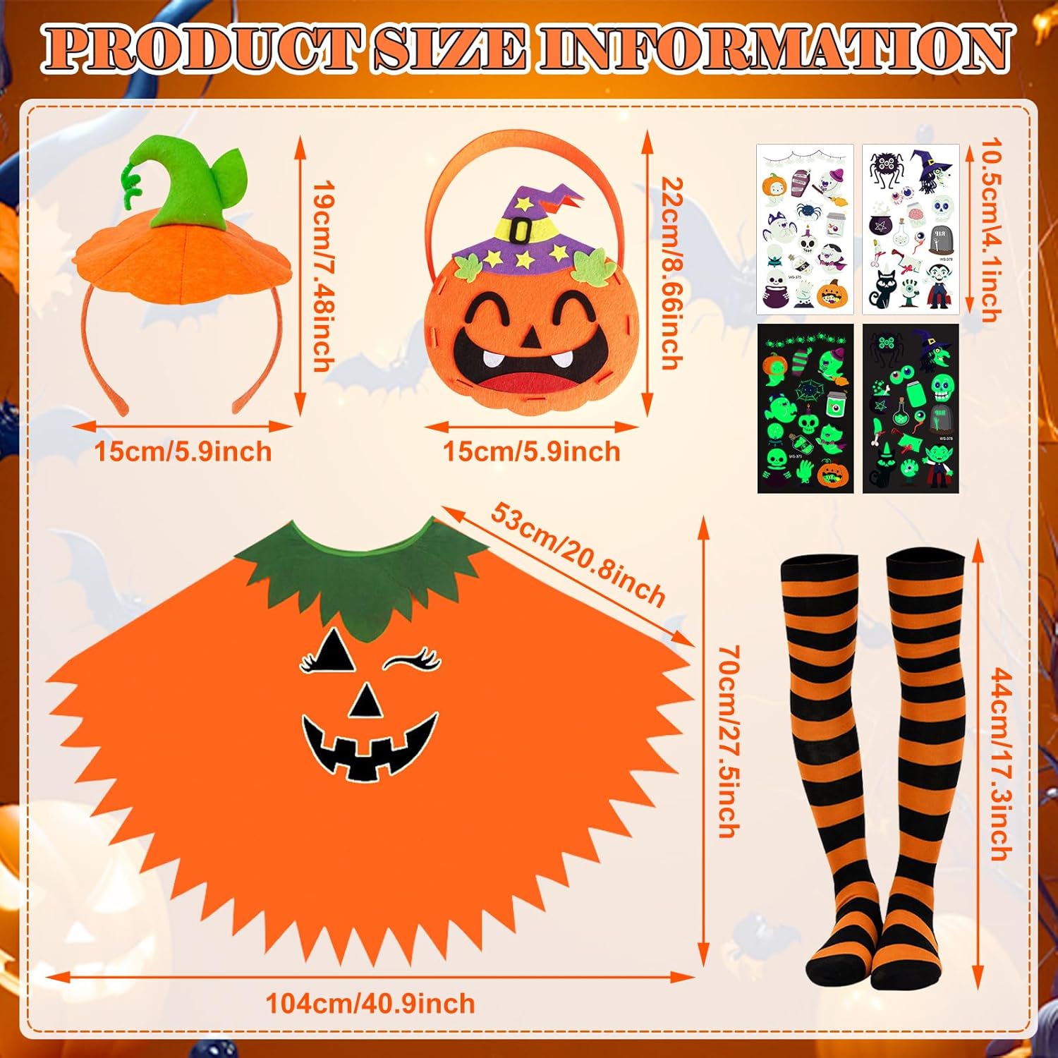 Descrizione prodotto Nome del prodotto: Bambini Zucca Costume Halloween Zucca Mantello Bambini Luminoso Zucca Mantello Istruzioni per l'uso: Per un effetto di illuminazione ottimale: caricare 2-3 ore sotto una forte luce prima dell'uso. Materiale: poliestere. Età consigliata: bambini da 6 a 8 anni. Lunghezza costume: 65 cm Campi di applicazione: giochi di ruolo di Halloween, carnevale, travestimenti, abbigliamento quotidiano, spettacoli, ecc. Contenuto 1 mantello fantasma di zucca. 1 paio di calzini a righe nere e arancioni. 1 cappello a testa di zucca. 2 adesivi luminosi per tatuaggi. 1 sacchetto per caramelle fai da te in feltro (con istruzioni di montaggio). Si prega di notare: Affinché il bambino si senta a suo agio, si prega di fare riferimento alla nostra tabella Avviso di sicurezza no