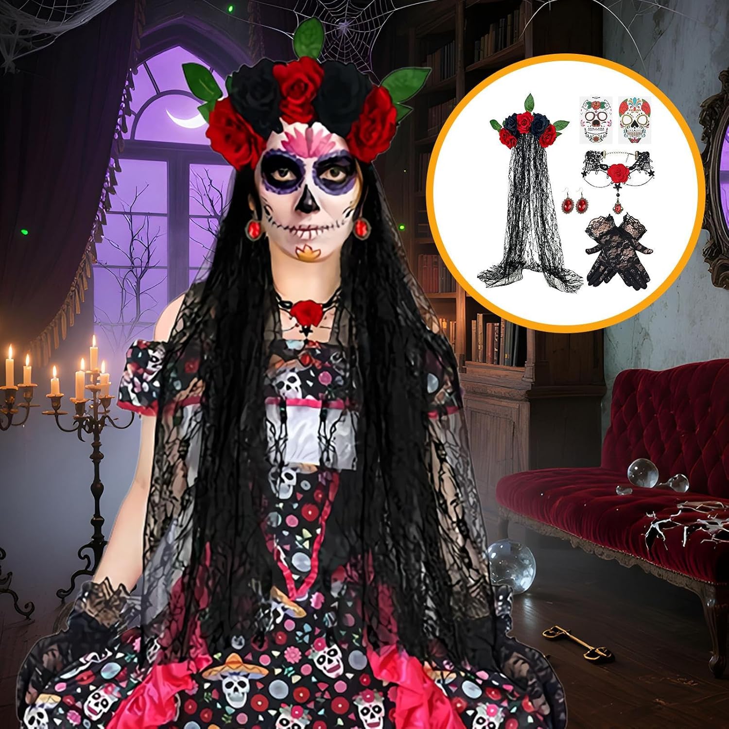 Dai vita al tuo look ispirato al giorno dei morti con questo costume, per donne e adulti che partecipano a Halloween, feste in maschera o a tema. Migliorato con decorazioni accattivanti, serve anche come opzione eccellente per spettacoli teatrali ed esperienze cosplay coinvolgenti. Specifiche tecniche: Materiale: tessuto di pizzo. Dimensioni fascia in pizzo: circa 39 x 100 cm. Peso: circa 260 g. Elenco dei 1 velo con fiori per il giorno dei morti. 1 paio di guanti in pizzo. 1 paio di orecchini. 2 set di adesivi per il viso. 1 collana con rose. Nota: Il colore dell'articolo potrebbe differire leggermente da quello riportato nell'immagine. A causa della misurazione manuale, si prega di consentire una differenza di 1-2 cm nelle dimensioni.