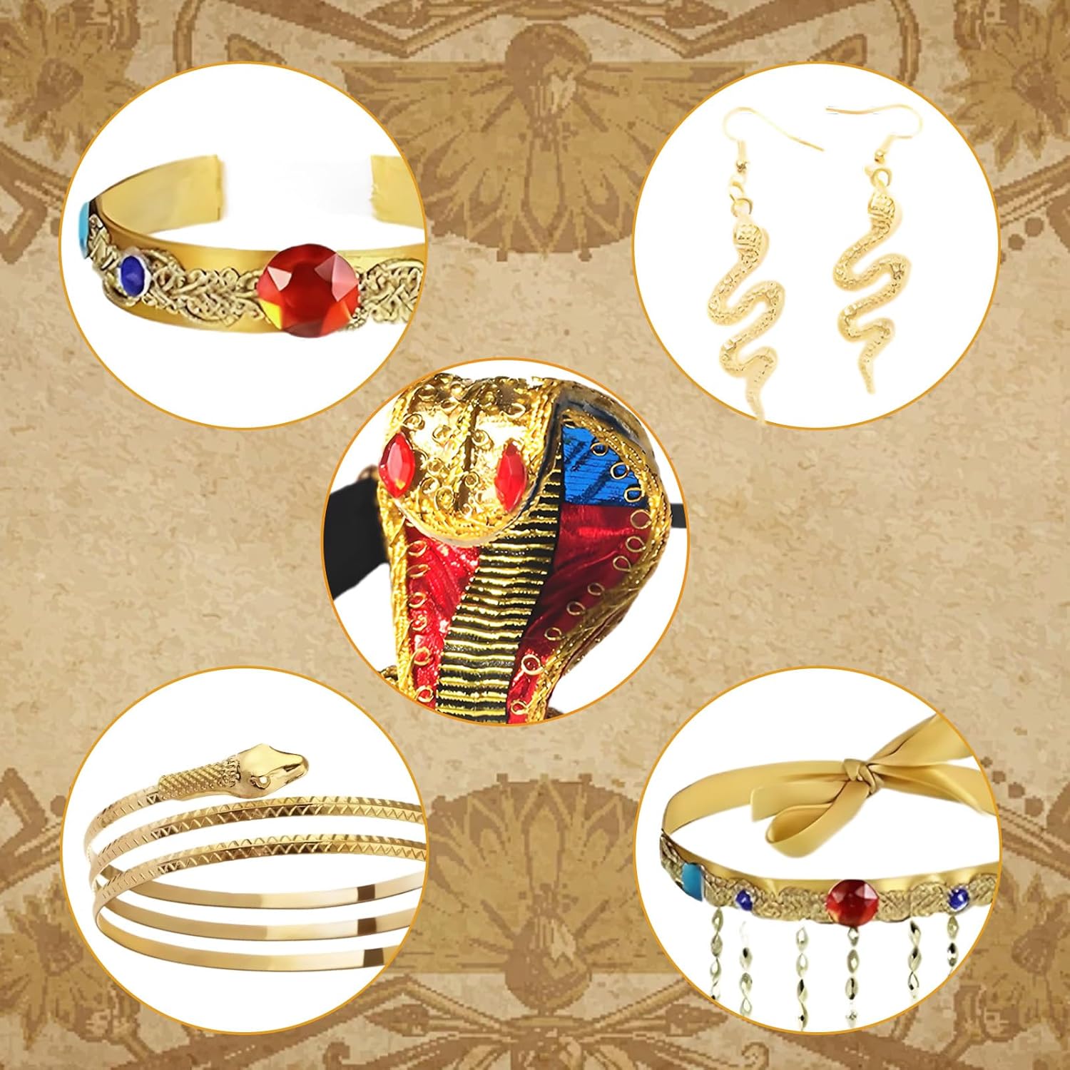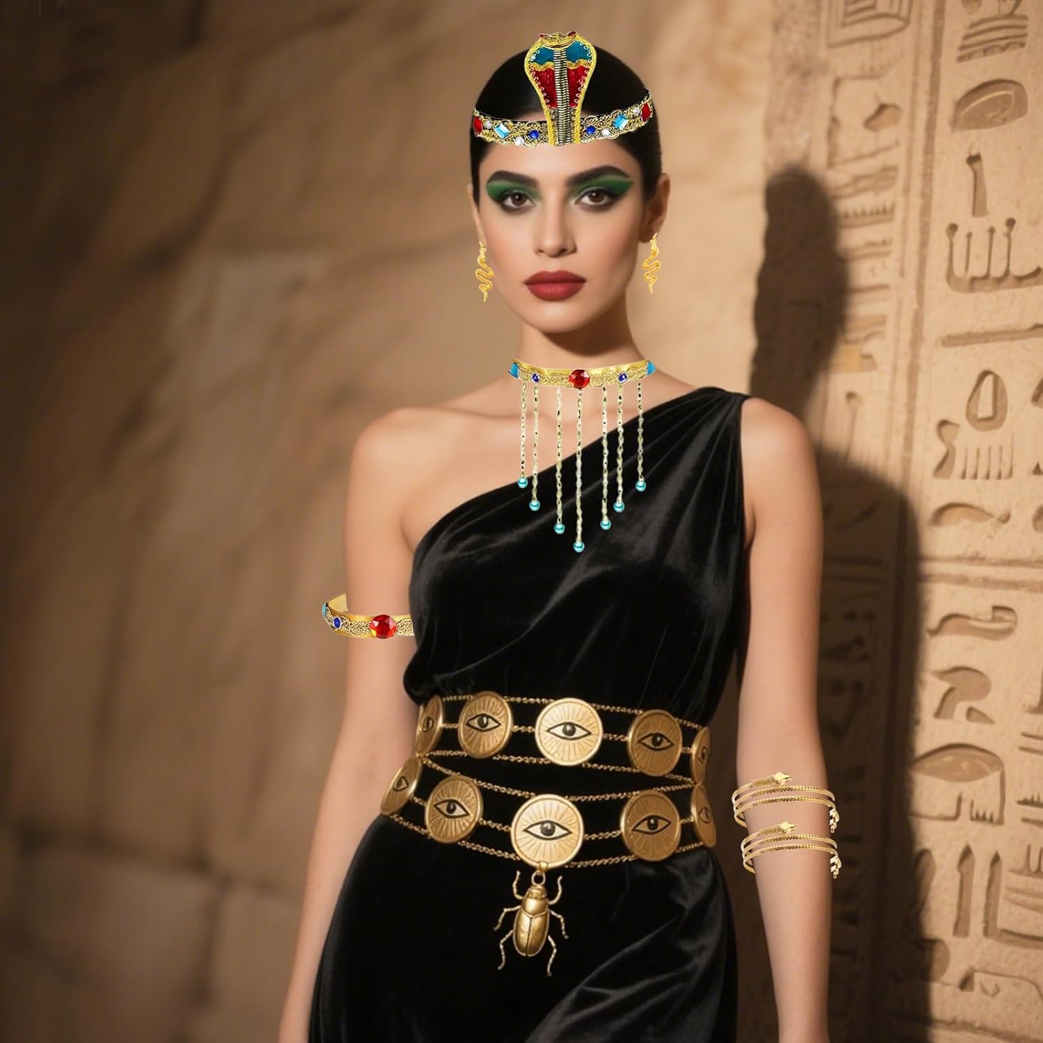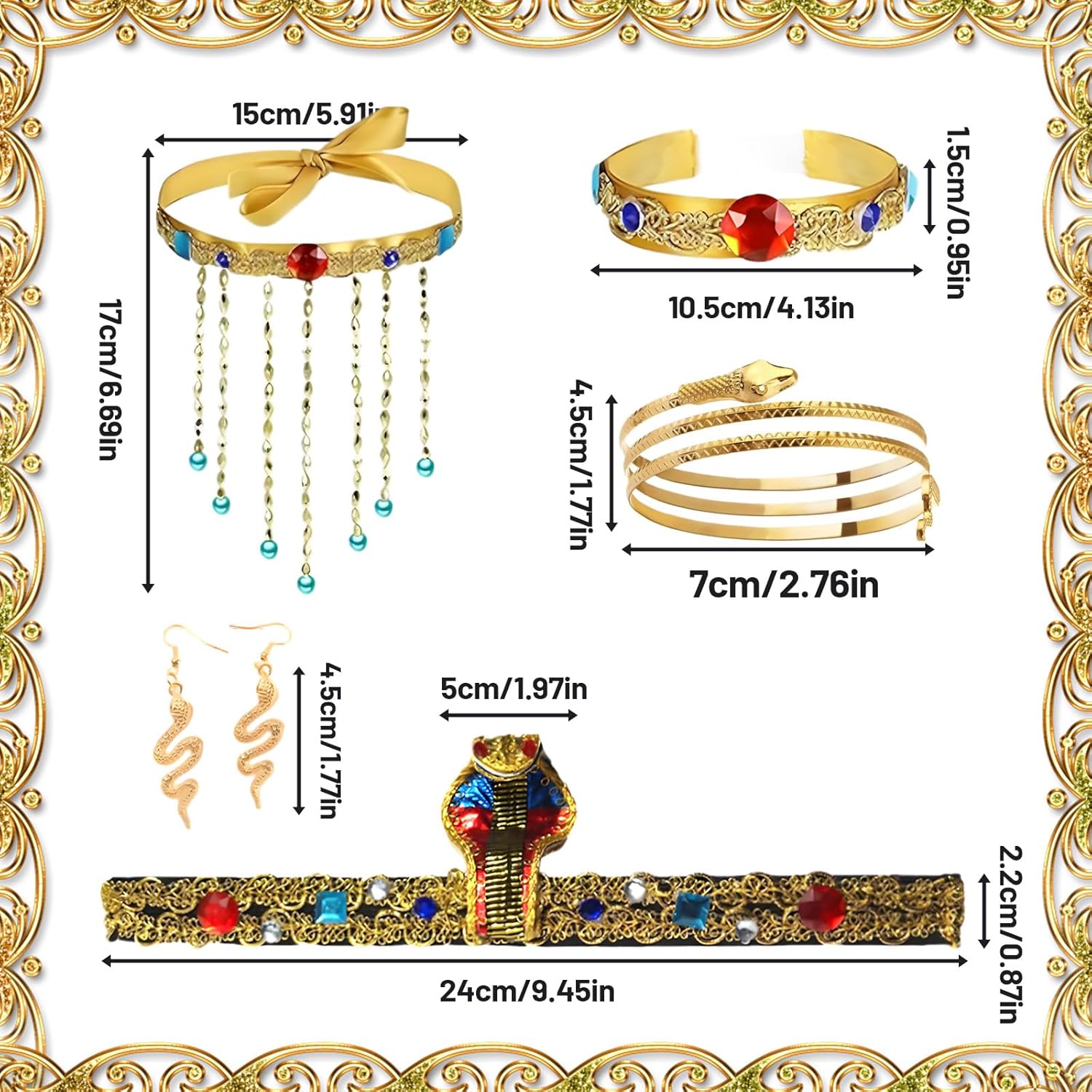 Descrizione prodotto Caratteristiche: 1. Il set è realizzato con materiali di alta qualità, leggero, elastico, comodo da indossare, non appesantisce il corpo. 2. Abbiamo una vasta gamma di set di costumi. Include una fascia per capelli a serpente, polsini a serpente, braccialetto a serpente, braccialetto con pietre preziose e un paio di orecchini. 3. Il set da abito egiziano è molto facile da indossare e indossare, pregevole fattura, non devi preoccuparti che le pietre si sfaldino, puoi facilmente vestirti come preferisci! ; 4. Un cobra dorato a spirale ispirato ai totem mistici egiziani. Decorato con strass scintillanti e colorati, è un pezzo di capelli abbagliante. La vista più avvincente del Nilo è quando giri delicatamente la testa. ; 5. Può essere utilizzato per una varietà di occasioni come feste di Halloween, mostre cosplay, servizi a tema, copertura completa di spettacoli teatrali e altre prestigiose feste ed eventi legati all'Egitto. La confezione include: Set da 7 pezzi per travestimento egiziano. Specifiche tecniche: Materiale: come da immagine. Dimensioni: come da immagine. Attenzione: 1. A causa dei diversi schermi, potrebbero esserci lievi differenze di colore. 2. Si prega di considerare una differenza di 1-2 mm dovuta alla misurazione manuale e confermare la lunghezza prima di ordinare, grazie per la vostra gentile comprensione! 3. Faremo del nostro meglio per fornire prodotti migliori. Vi preghiamo di contattarci liberamente se avete bisogno di assistenza. Avviso di sicurezza Uso sicuro