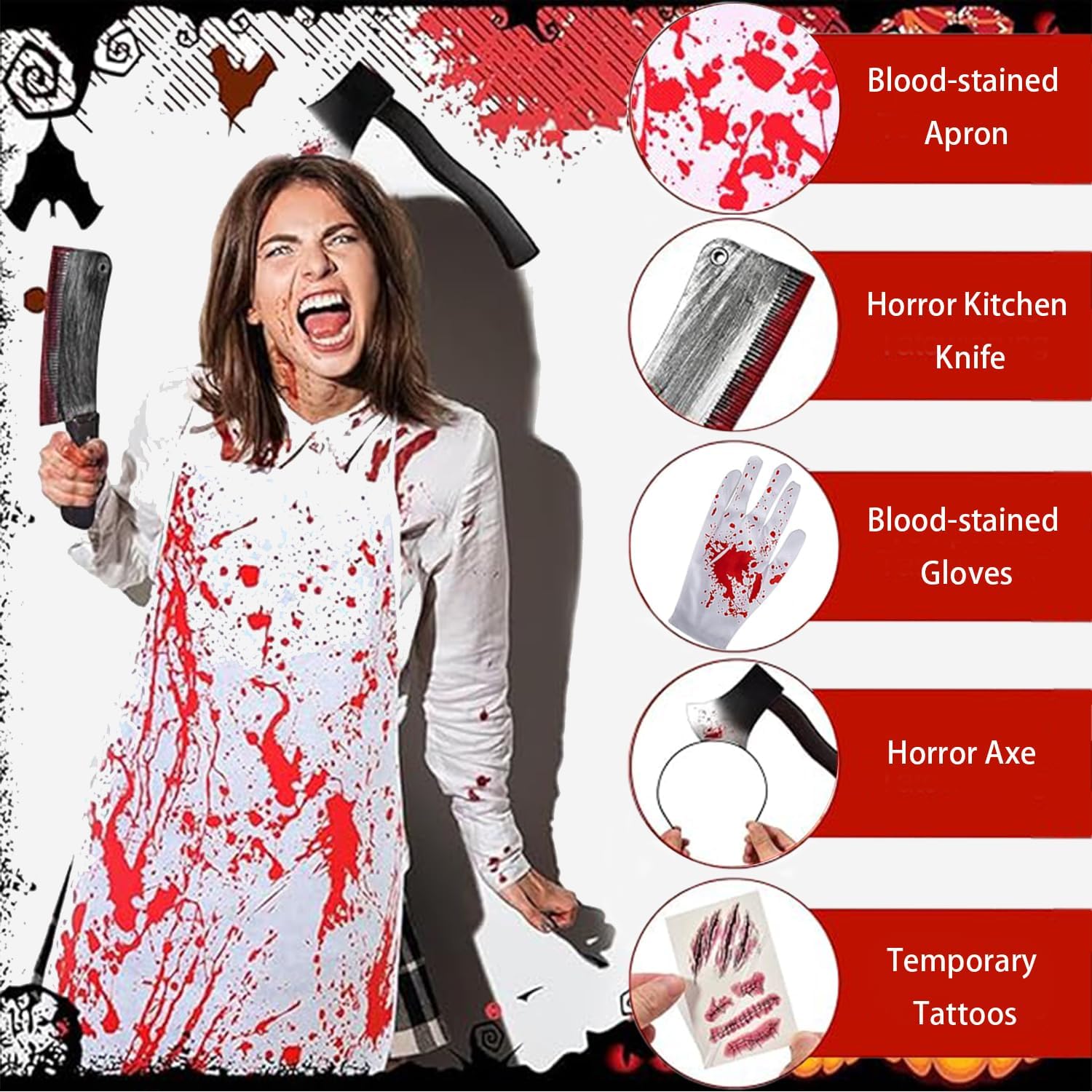 【Set Completo Costume Macellaio Halloween】Include 1x Grembiule Insanguinato, 1x Fascia Testa con Ascia, 1x Coltello Macellaio, 1x Guanti + 10x Adesivi Cicatrici - Il tuo Costume da Macellaio per Halloween completo in un unico kit!