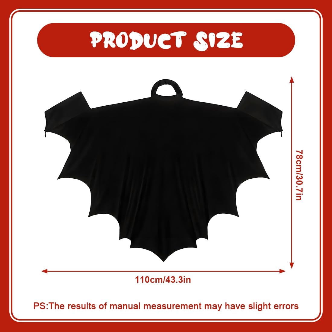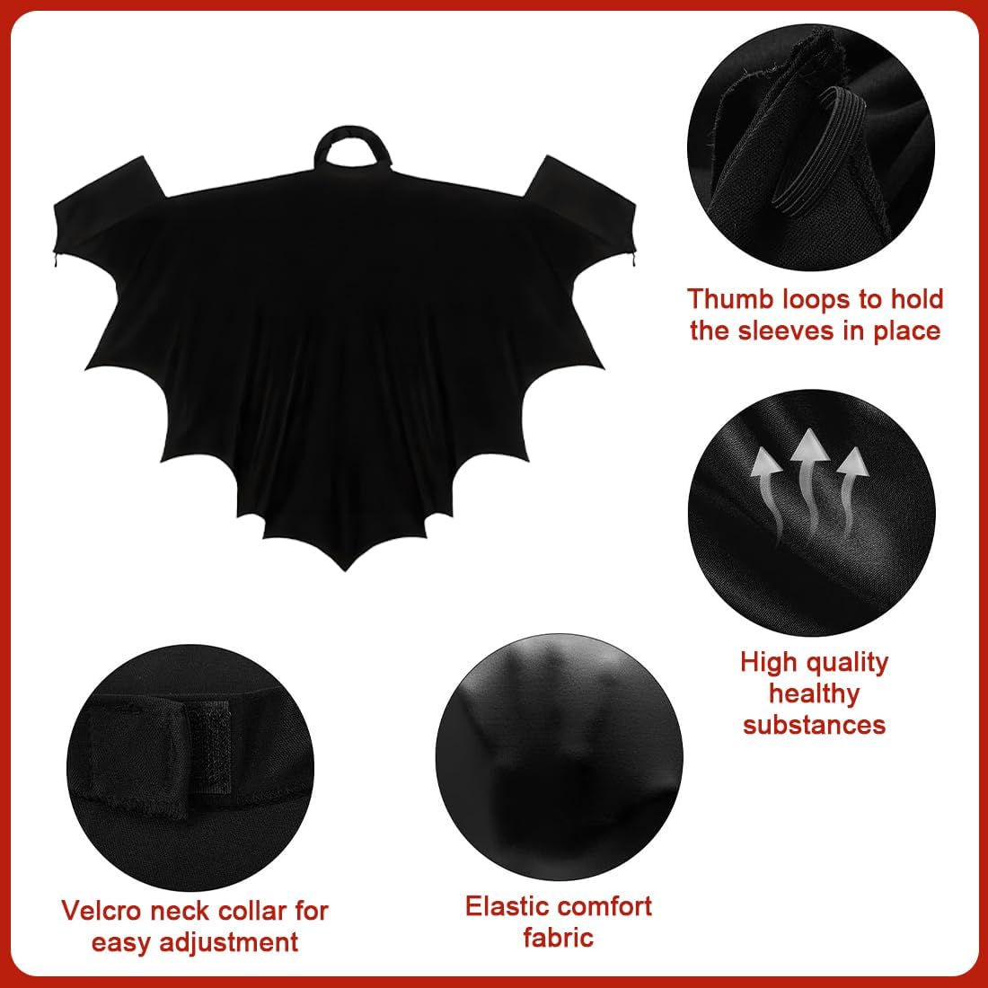 Set perfetto per costumi da pipistrello di Halloween: questo set include un mantello da pipistrello, una maschera e delle orecchie da pipistrello, ideali per feste di Halloween e eventi in maschera per bambini. Alta qualità e vestibilità comoda: il mantello è realizzato in tessuto elasticizzato, confortevole e traspirante. La chiusura in velcro sul colletto consente una facile regolazione. Design realistico da pipistrello: il mantello a forma di ala di pipistrello e gli accessori coordinati creano un look da pipistrello autentico e spettrale. Facile da usare: i passanti per i pollici sulle maniche mantengono le maniche in posizione. Il set è veloce da indossare e da togliere. Versatile: non solo per Halloween, ma adatto anche per carnevale o feste a tema per creare il perfetto accento in costume