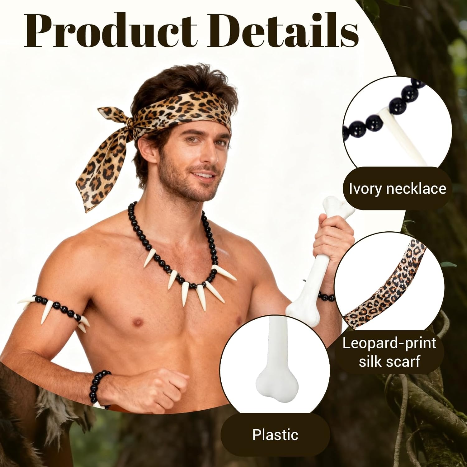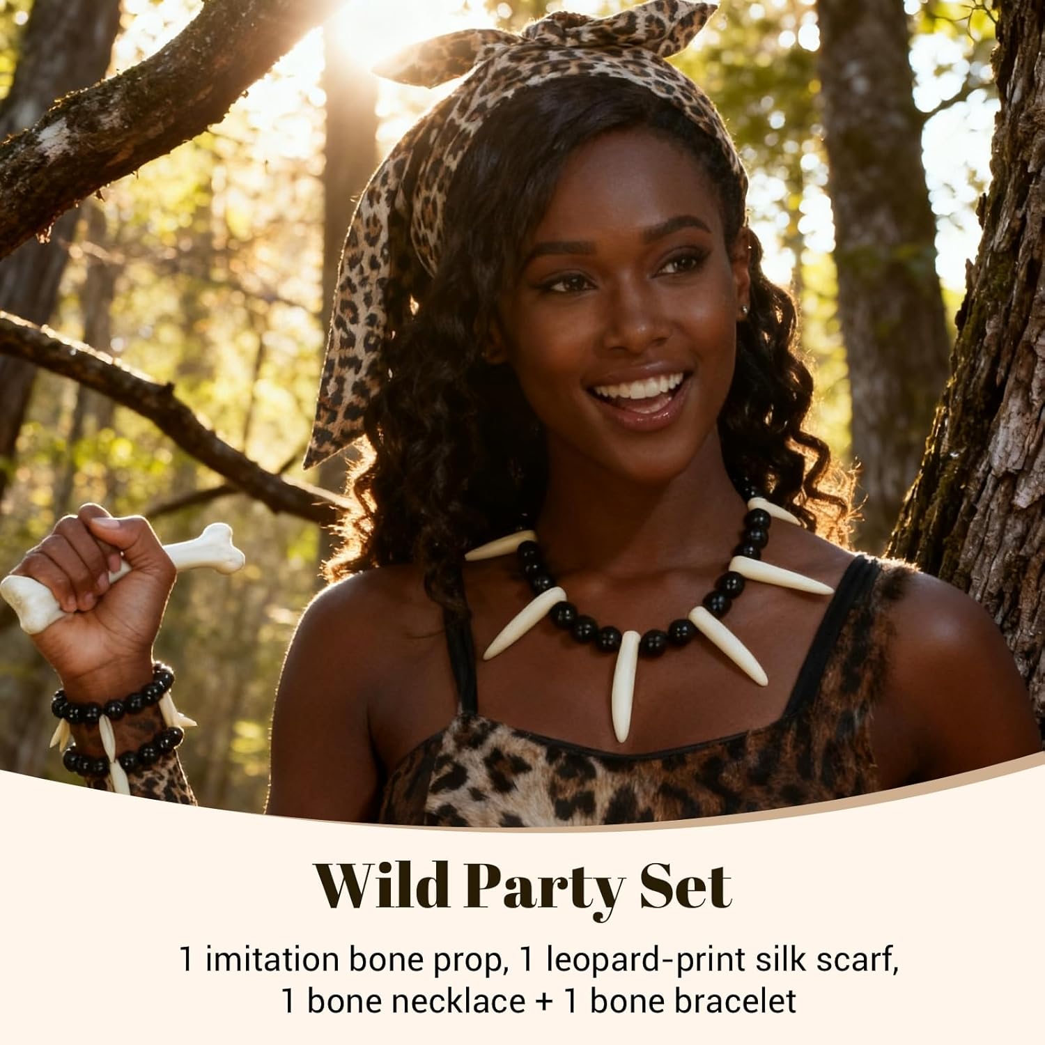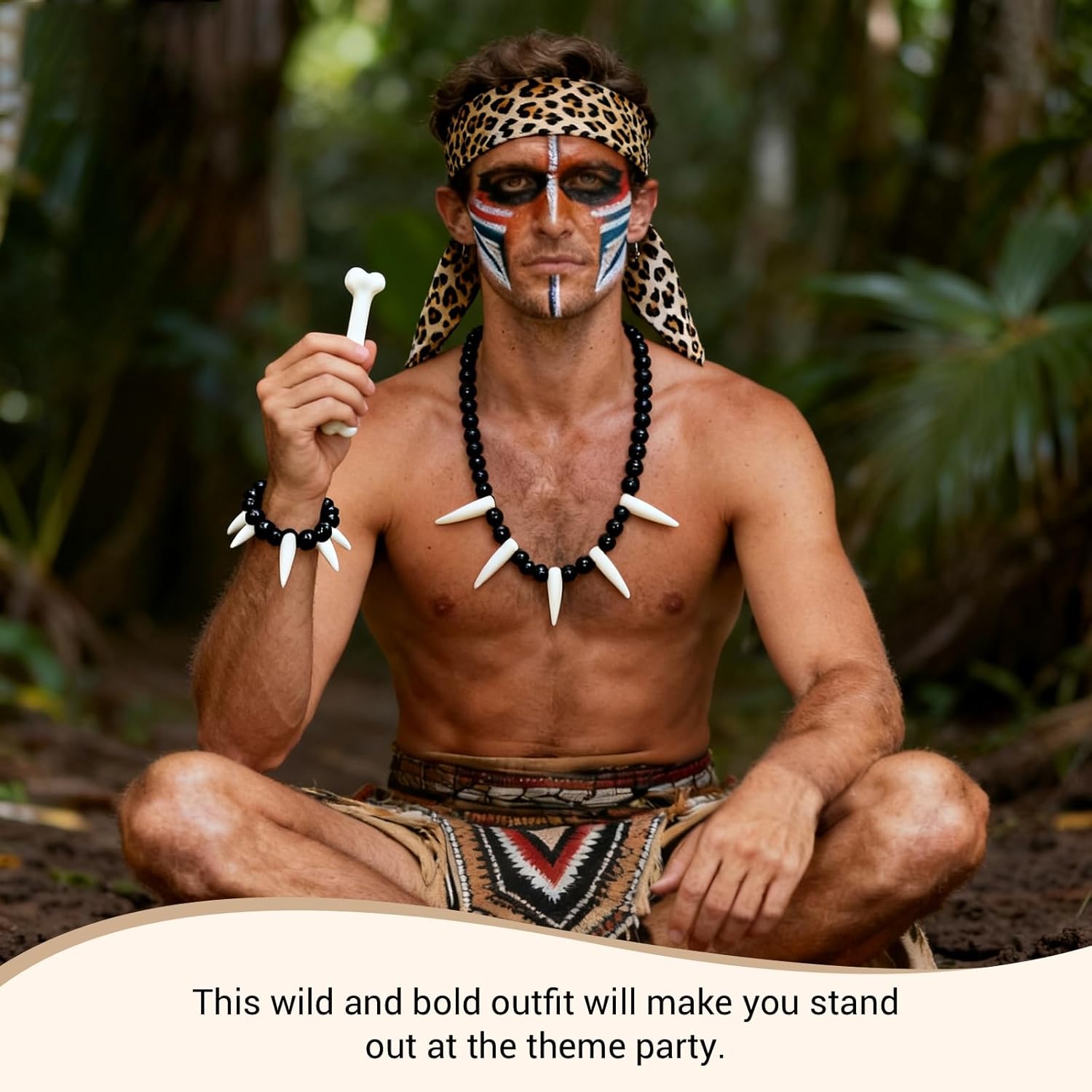 Set completo per trasformarsi all’istante: Questo costume preistorico include 4 elementi ispirati all’età della pietra: un osso finto realistico, una sciarpa con stampa leopardata, una collana e un bracciale decorati con ossa. Il set offre un’esperienza autentica e completa per chi desidera calarsi nei panni di un vero membro di una tribù antica. Ogni pezzo è progettato per aggiungere realismo e originalità, rendendo il travestimento perfetto per qualsiasi occasione a tema tribale o storica Perfetto per ogni fascia d’età: Il costume preistorico è adatto sia per adulti che per bambini, rendendolo ideale per feste in famiglia, eventi scolastici, recite o raduni tematici. Grazie alla sua vestibilità versatile e agli accessori leggeri, è confortevole da indossare per lunghi periodi. Questo set garantisce divertimento e partecipazione per persone di tutte le età, facendo emergere il lato selvaggio e giocoso di ogni partecipante in modo spensierato e coinvolgente. Accessorio multifunzione per tutte le stagioni: La sciarpa leopardata inclusa può essere indossata in diversi modi, come fascia per capelli, bracciale decorativo, cintura, sciarpa classica o accessorio per la borsa. Questo la rende un elemento di grande valore, utilizzabile anche al di fuori dei contesti di festa. Si abbina facilmente a t-shirt, jeans o vestiti casual, diventando un tocco originale per l’abbigliamento quotidiano con un richiamo allo stile tribale. Ideale per cosplay e feste a tema: Il costume tribale è perfetto per interpretare personaggi dell’età della pietra durante feste di carnevale, Halloween, spettacoli teatrali, eventi cosplay e giochi di ruolo. Gli accessori ben curati e l’aspetto accattivante rendono il travestimento immediatamente riconoscibile, contribuendo a creare un’atmosfera immersiva e coinvolgente, ideale per serate divertenti in compagnia. Idea regalo divertente e originale: Questo set di accessori tribali è anche un’ottima idea regalo per amici, colleghi o familiari che amano divertirsi alle feste. Il suo stile bizzarro e la cura dei dettagli lo rendono uno dei gadget più richiesti per animare eventi o per sorprendere con un dono fuori dagli schemi. Un vero e proprio "must" per chi vuole portare un tocco selvaggio in ogni occasione festiva.