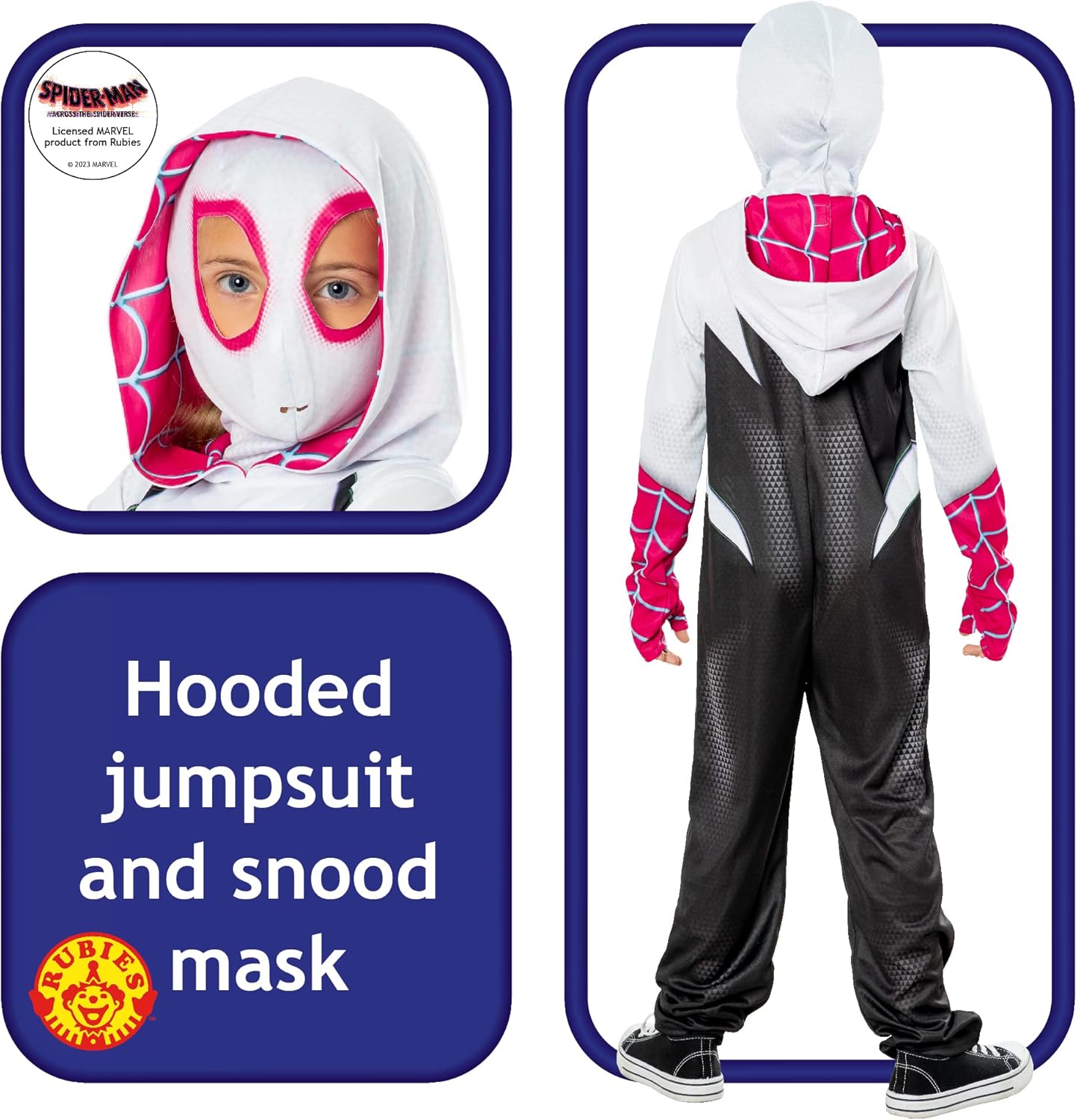 Ma fille a 6 ans et le costume tombe sur elle parfaitement. Il est un peu compliqué à mettre au niveau de la tête mais pas impossible. J'avoue qu'en été, il lui tient chaud au niveau de la capuche. Gros bémol pour le masque où les trous pour respirer ne sont pas en face des narines mais sur la bouche. J'ai dû lui faire 2 trous au ciseau pour qu'elle respire correctement.