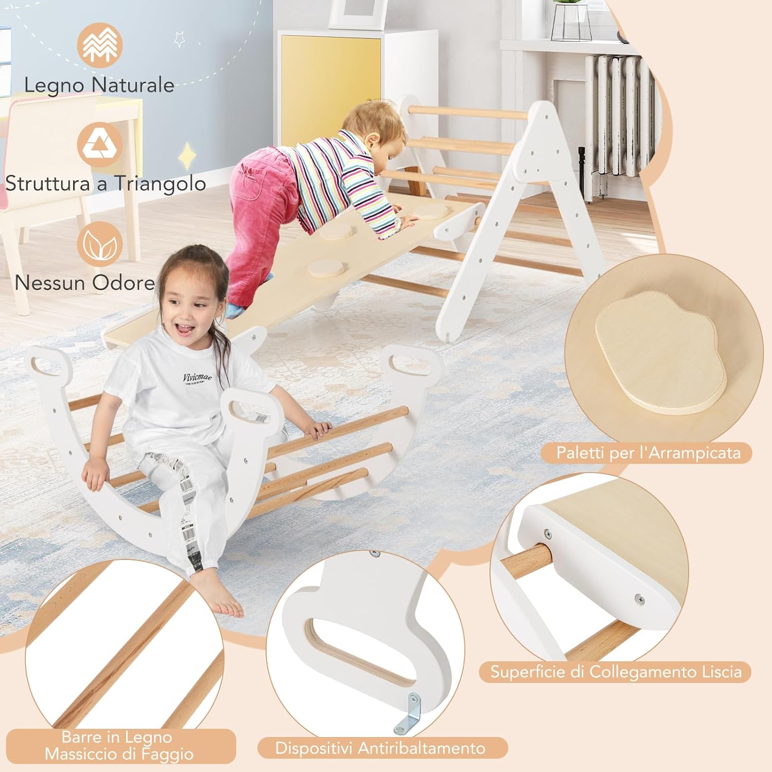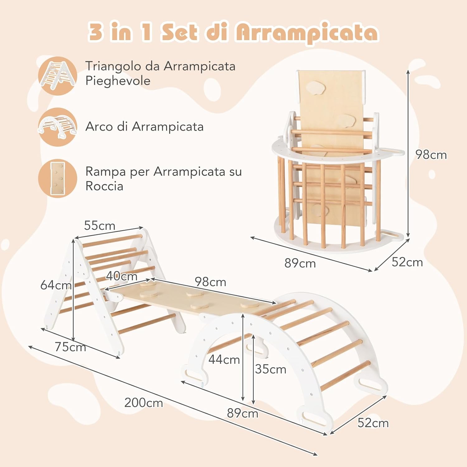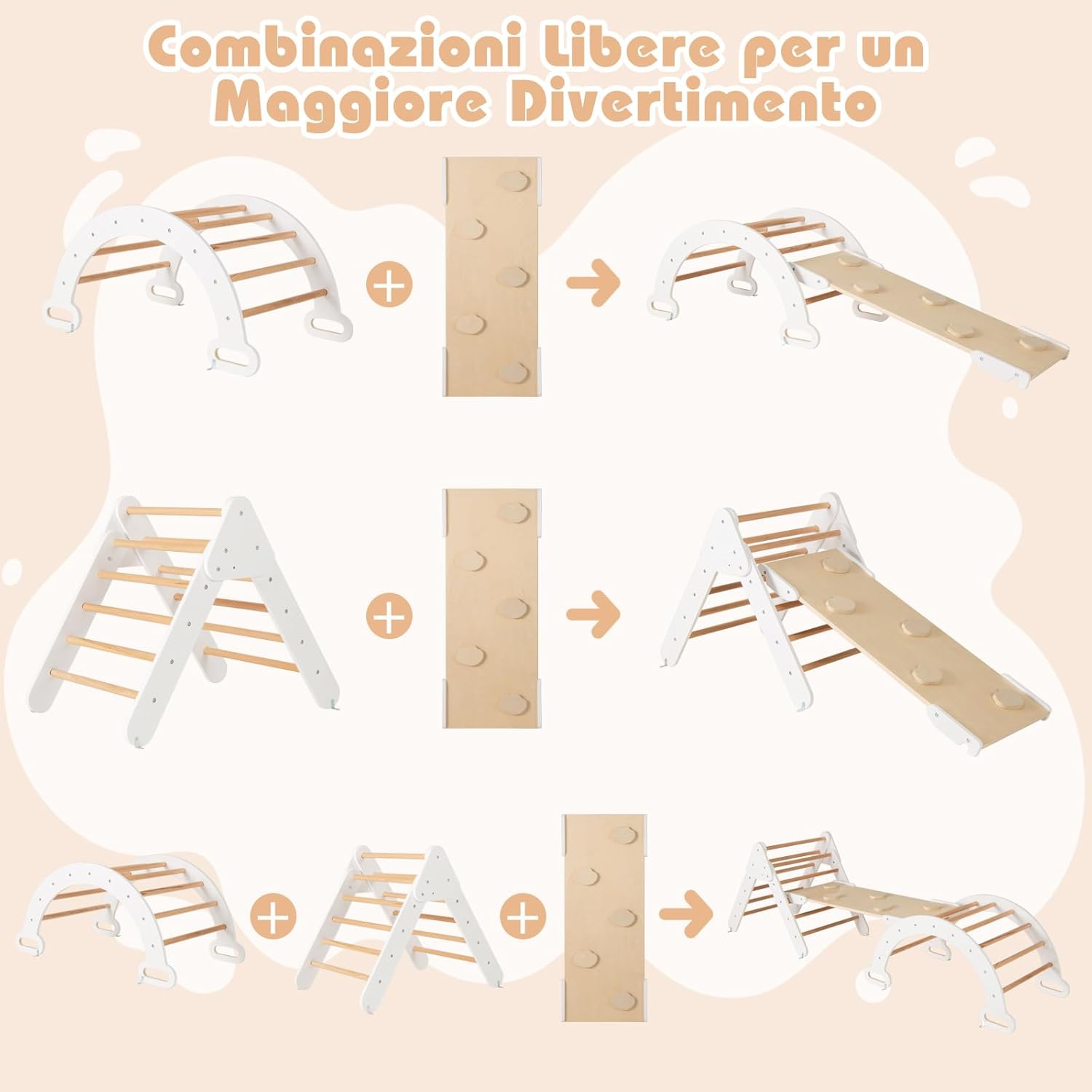 【Diverse Modalità di Combinazione】Questo set di arrampicata Montessori è composto da 1 triangolo di arrampicata, 1 arco di arrampicata e 1 rampa. Tutte queste parti possono essere utilizzate insieme o separatamente a seconda delle preferenze dei bambini. Le diverse combinazioni contribuiscono a un divertimento illimitato. 【Materiale Resistente e Design Sicuro】Realizzata in legno di faggio naturale, resistente e sicuro, la palestra di arrampicata in legno promette una lunga durata. Inoltre, I bordi sono levigati e la superficie è priva di bave. In questo modo, I bambini possono giocare con questo set di arrampicata a triangolo in tutta sicurezza. 【Rampa e Arco di Arrampicata 2 in 1】Combinando la rampa con il triangolo di arrampicata, è possibile offrire ai bambini diverse opzioni di altezza. Inoltre, ruotando l’arco di arrampicata è possibile trasformarlo in un dondolo. 【Costruzione Solida e Affidabile】Il triangolo di arrampicata, l’arco di arrampicata e la rampa sono progettati con strutture stabili, per evitare che I bambini cadano mentre giocano. Inoltre, i solidi connettori ne migliorano la stabilità complessiva. 【Regalo Perfetto per I Bambini】Il set di giochi da arrampicata in legno è un regalo perfetto per I bambini di età superiore a 1 anno. I bambini possono promuovere il loro equilibrio, l'apprendimento, la socialità e altre abilità quando giocano con il set di triangoli per arrampicata in legno.