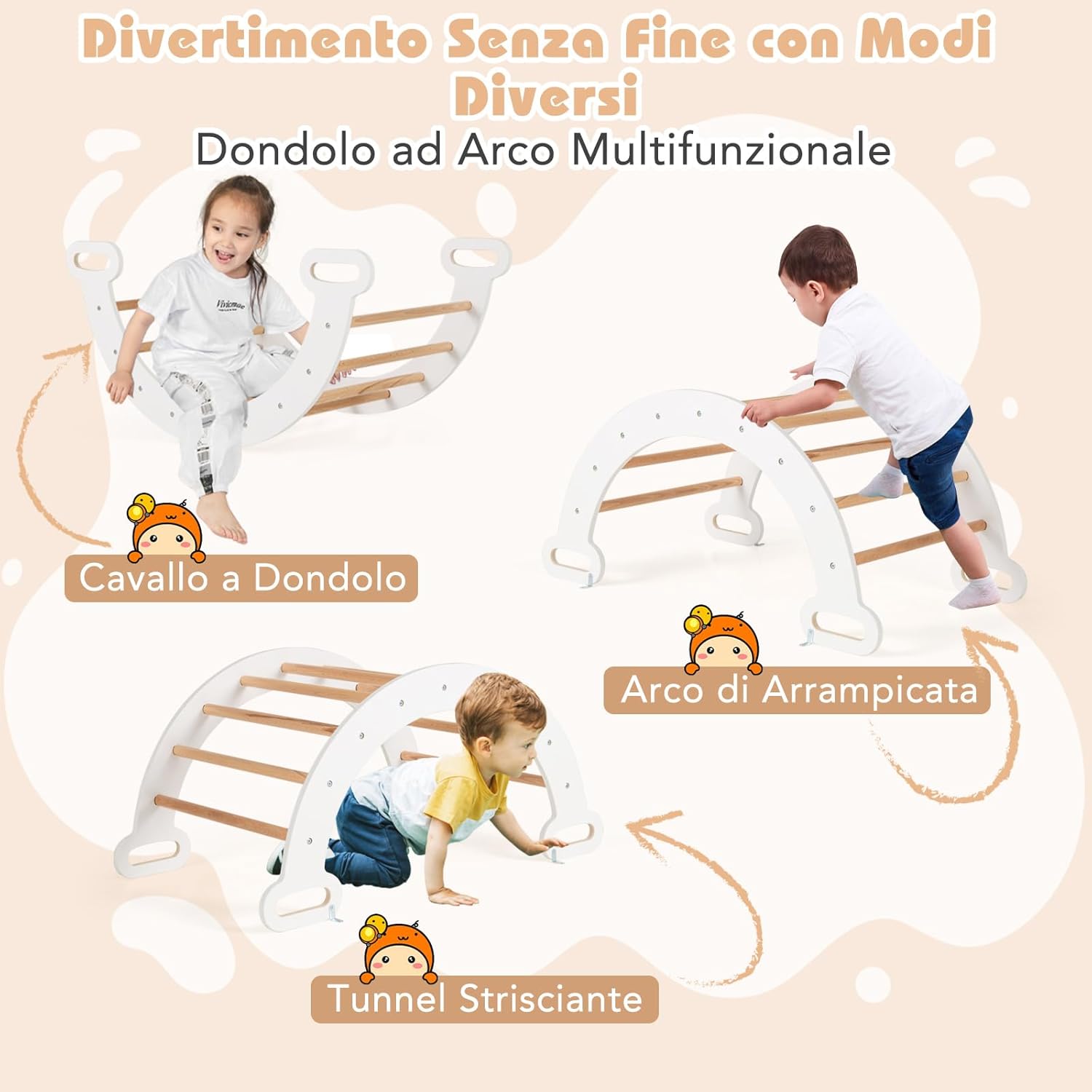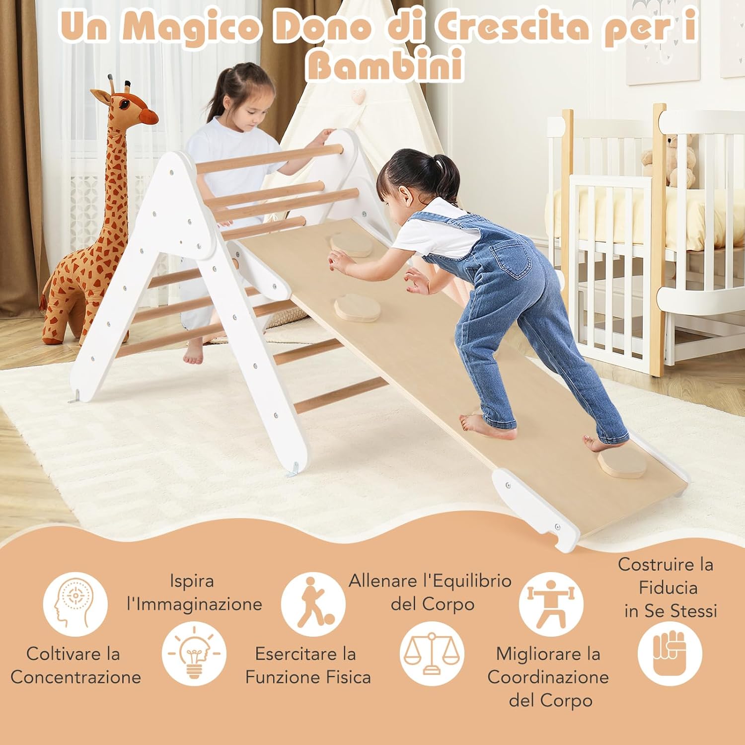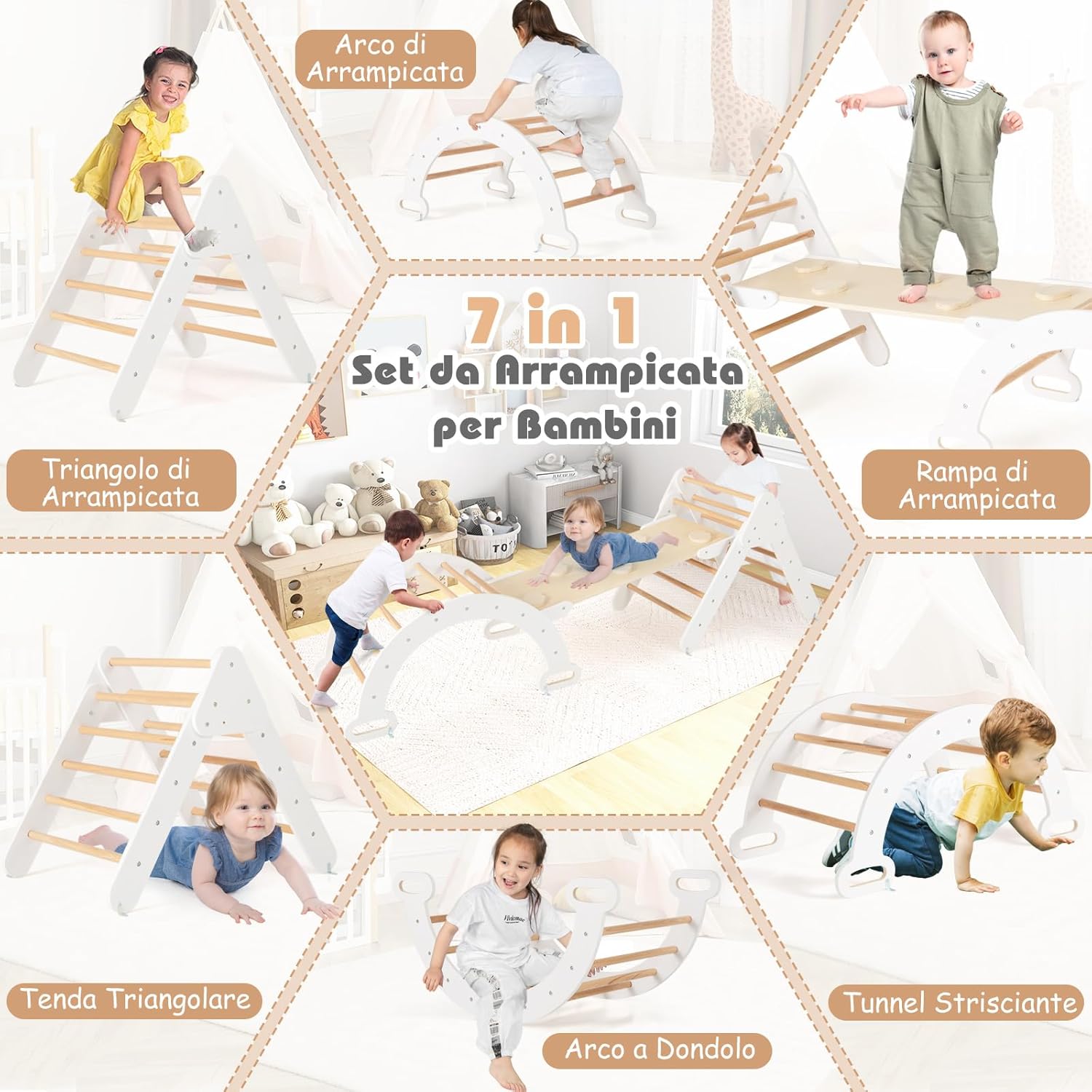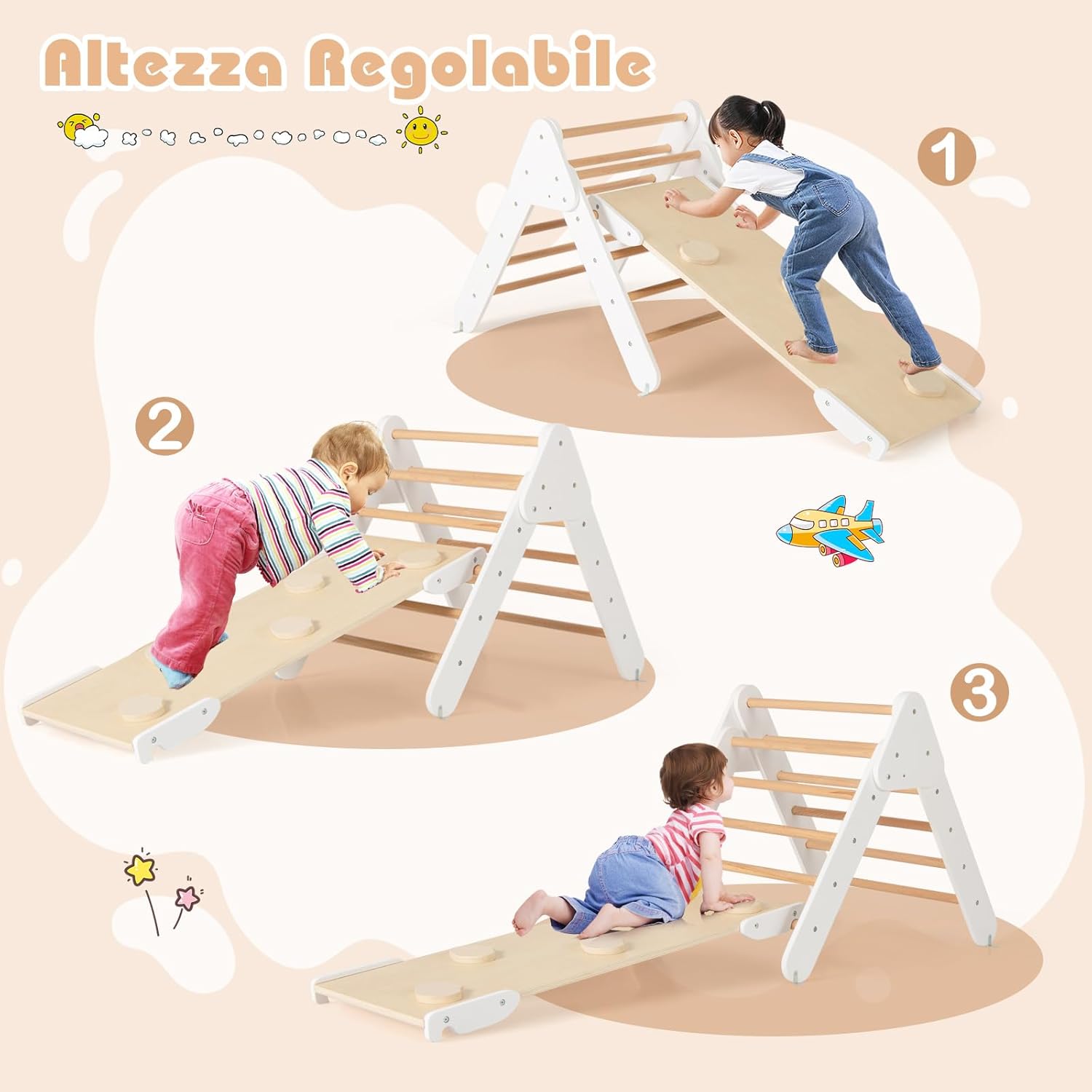 【Diverse Modalità di Combinazione】Questo set di arrampicata Montessori è composto da 1 triangolo di arrampicata, 1 arco di arrampicata e 1 rampa. Tutte queste parti possono essere utilizzate insieme o separatamente a seconda delle preferenze dei bambini. Le diverse combinazioni contribuiscono a un divertimento illimitato. 【Materiale Resistente e Design Sicuro】Realizzata in legno di faggio naturale, resistente e sicuro, la palestra di arrampicata in legno promette una lunga durata. Inoltre, I bordi sono levigati e la superficie è priva di bave. In questo modo, I bambini possono giocare con questo set di arrampicata a triangolo in tutta sicurezza. 【Rampa e Arco di Arrampicata 2 in 1】Combinando la rampa con il triangolo di arrampicata, è possibile offrire ai bambini diverse opzioni di altezza. Inoltre, ruotando l’arco di arrampicata è possibile trasformarlo in un dondolo. 【Costruzione Solida e Affidabile】Il triangolo di arrampicata, l’arco di arrampicata e la rampa sono progettati con strutture stabili, per evitare che I bambini cadano mentre giocano. Inoltre, i solidi connettori ne migliorano la stabilità complessiva. 【Regalo Perfetto per I Bambini】Il set di giochi da arrampicata in legno è un regalo perfetto per I bambini di età superiore a 1 anno. I bambini possono promuovere il loro equilibrio, l'apprendimento, la socialità e altre abilità quando giocano con il set di triangoli per arrampicata in legno.