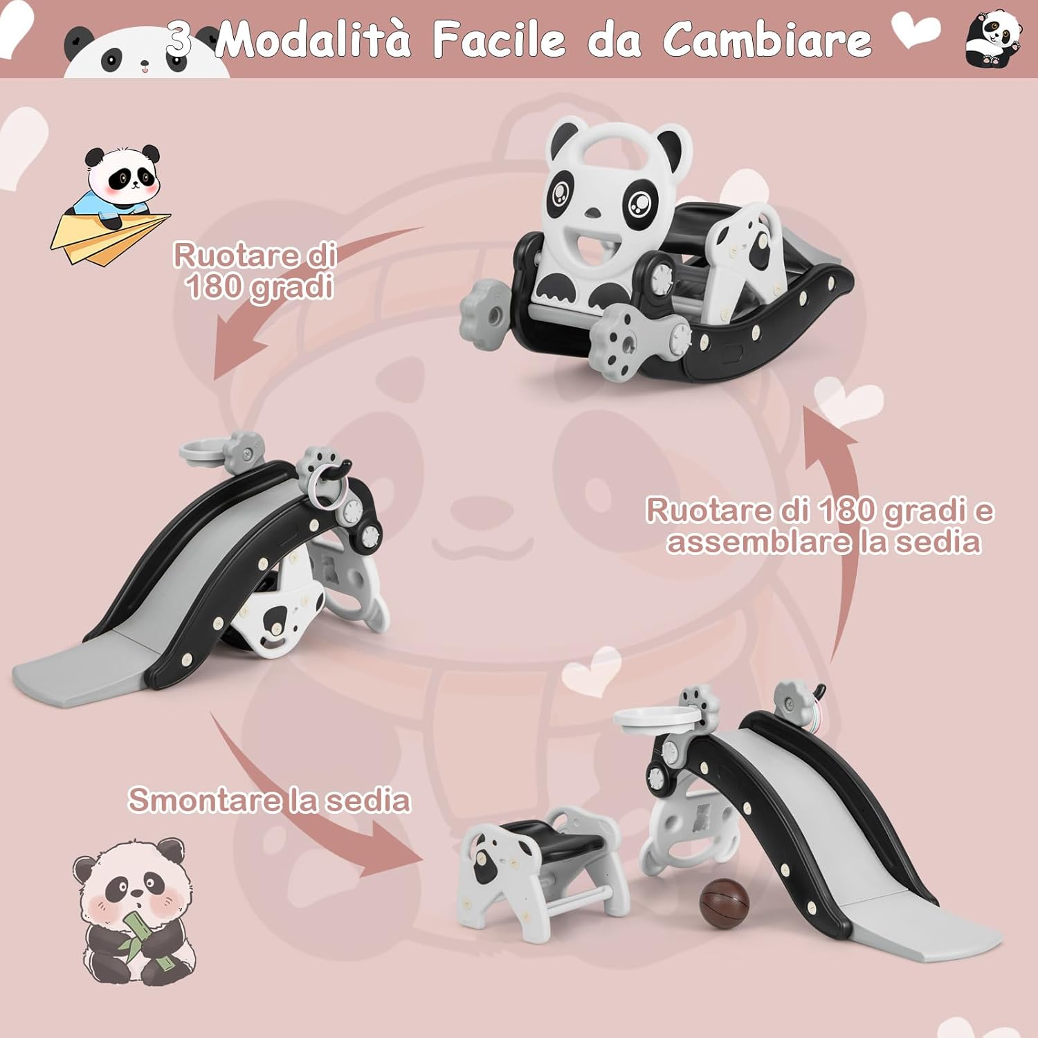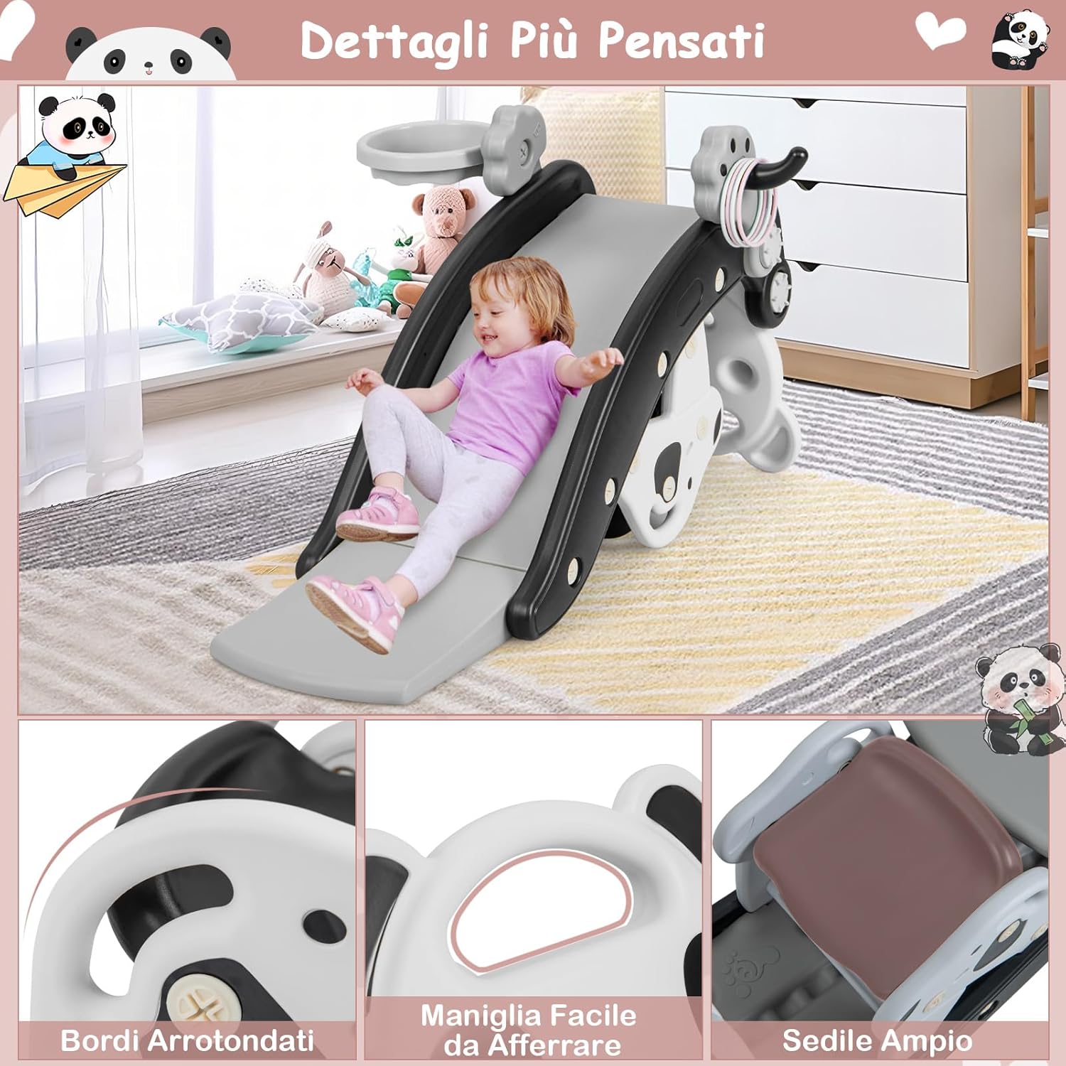 【Design 5-in-1】Questo set di giocattoli per bambini offre un'esperienza versatile con il suo design 5-in-1. Con la possibilità di passare tra le modalità dondolo, lancio, scivolo, lancio e seduta, i tuoi bambini non si stancheranno mai di giocare in modi eccitanti. 【Facile Cambio Modalità】Il set di giocattoli consente un passaggio senza sforzo tra le modalità, rendendo conveniente per i più piccoli passare dalla modalità cavallo a dondolo alla modalità scivolo per bambini. Possono esplorare diverse esperienze di gioco con una semplice operazione. 【Esperienza di Gioco Sicura】Diamo la priorità alla sicurezza nel nostro design. La modalità dondolo presenta un limitatore di angolo, garantendo un movimento di dondolamento sicuro limitato a 38°. Inoltre, l'area di ammortizzazione estesa in modalità scivolo fornisce uno strato aggiuntivo di protezione per il tuo bambino. 【Dettagli Più Premurosi】La struttura triangolare stabile assicura stabilità durante il gioco, mentre i bordi arrotondati e la maniglia facile da afferrare forniscono una presa comoda e sicura per il tuo bambino. Inoltre, gli accessori carini, tra cui un canestro da basket e quattro anelli, aggiungono un elemento extra di divertimento. 【Regalo Ideale per Bambini】Rendi il compleanno del tuo bambino ancora più speciale con il nostro set di giocattoli. Non solo porterà piacere infinito al loro tempo di gioco, ma incoraggerà anche l'attività fisica, fornendo una sana via di sfogo per la loro energia. Questo set di giocattoli è il regalo perfetto per i bambini, garantendo ore di divertimento e intrattenimento.