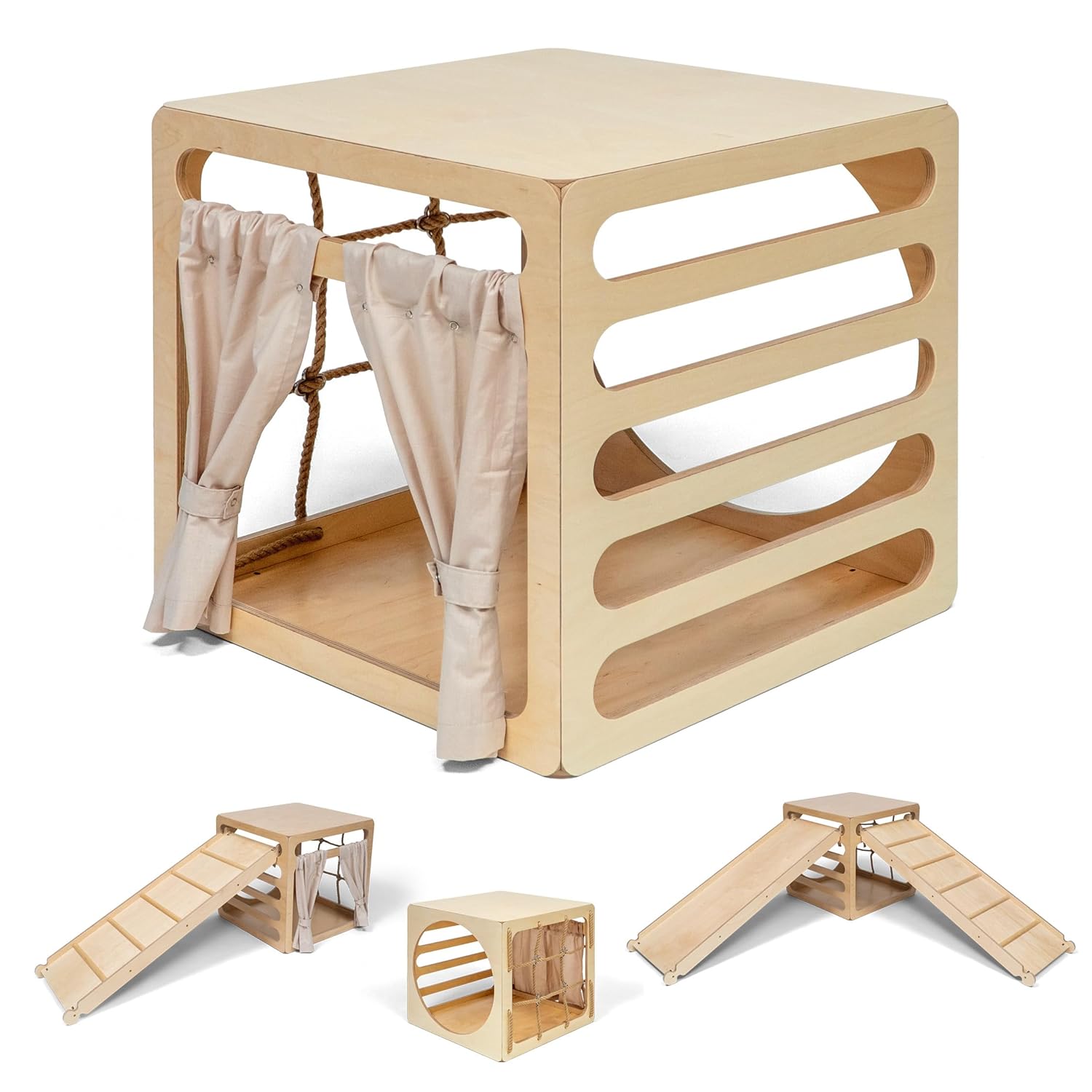 【Divertimento Infinito in Un Solo Set】 Ogni momento di gioco è una nuova avventura emozionante con il set triangolo 8-in-1. I bambini possono usare l'altalena a dondolo, arrampicarsi sulla rampa rocciosa, nascondersi nella tenda triangolare, conquistare il triangolo da arrampicata, mantenersi in equilibrio sul ponte, attraversare il ponte a mezzo cerchio, dondolare sull'arco o gattonare nel tunnel. 【Massima Sicurezza】 Il set Montessori per arrampicata è progettato pensando ai bambini. Le aste in legno di faggio e le gambe anti-ribaltamento rendono l’arrampicata un’avventura sicura. Inoltre, con corrimano e maniglie laterali per un supporto extra, ogni salita è senza preoccupazioni e divertente. 【Gioco Interattivo】 Ogni momento con la palestra giungla interno è un’avventura deliziosa. I bambini possono esplorare un labirinto Montessori, sfidare la mente con un gioco di abbinamento forme e giocare con 2 macchinine. 【Facile da Piegare e Riporre】 Dite addio al disordine! Il set da arrampicata ha un triangolo pieghevole che si chiude facilmente. A fine gioco, basta piegarlo e riporlo in un angolo. La soluzione perfetta per risparmiare spazio. 【Gioco Coinvolgente dai Bambini】 Il set triangolo per bambini è un successo garantito! Usato come set completo o a moduli singoli, offre infinite possibilità di gioco. Aiuta a stimolare l’immaginazione, sviluppare la coordinazione, accendere la curiosità e migliorare l’equilibrio durante le avventure quotidiane interno.
