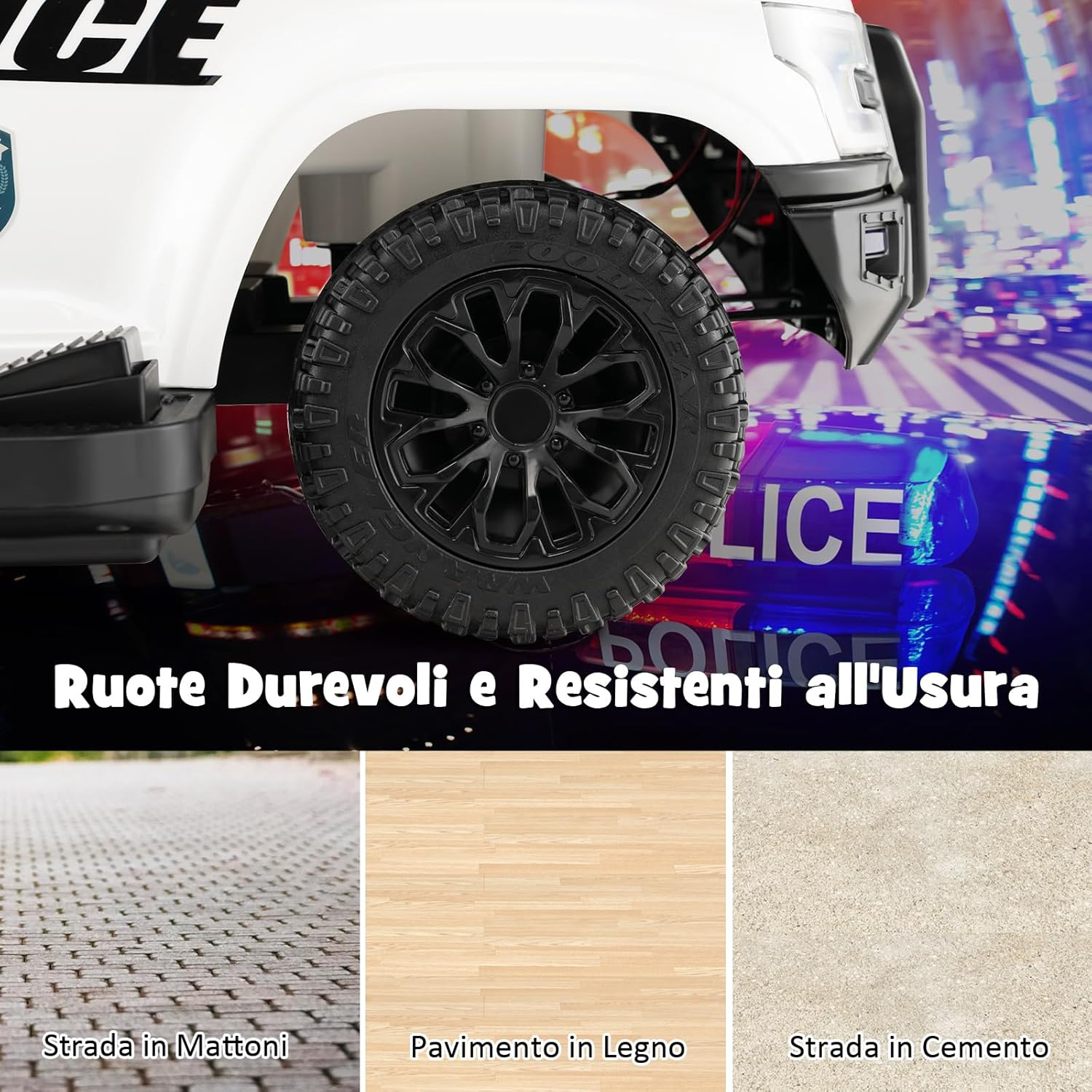 【Auto della Polizia Super Divertente】Progettata con adesivi delicati della polizia, luci di avvertimento lampeggianti e megafono, questa auto della polizia fa sentire i bambini come un vero poliziotto. Inoltre, i bambini possono premere il pulsante rosso del megafono per amplificare i loro suoni attraverso il megafono, aggiungendo ulteriore divertimento. 【Pannello di Controllo e Memoria Nascosta】Il lettore multimediale offre ai bambini una maggiore gioia di guida. La porta USB supplementare e l'interfaccia TF consentono di collegarlo a dispositivi esterni per ascoltare più musica. Inoltre, il portaoggetti sotto il sedile consente ai bambini di riporre giocattoli, snack e altri piccoli oggetti. 【Design Sicuro e Confortevole】Questo cavalcabile per bambini è dotato di un dispositivo antiribaltamento inferiore e di uno schienale sicuro per evitare che i bambini si sporgano all'indietro e garantire la loro sicurezza. Inoltre, il comodo sedile e l'ampio poggiapiedi consentono ai bambini di guidare comodamente. 【Esperienza di Guida Realistica】Grazie alla batteria ricaricabile da 6V e al forte motore incorporato, la nostra auto della polizia giocattolo può raggiungere una velocità sicura di 3 km/h. D'altra parte, grazie alle ruote durevoli e resistenti all'usura, il nostro giocattolo è adatto a diverse condizioni stradali, come il pavimento in legno, la strada di cemento, la strada di mattoni e altro ancora. 【Regalo Perfetto per i Vostri Bambini】La nostra auto della polizia è un regalo ideale per i bambini di età compresa tra i 18 e i 60 mesi. Il sedile può sostenere un peso fino a 25kg. I bambini non solo possono acquisire felicità, ma possono anche esercitare la loro capacità di equilibrio, le abilità motorie e la coordinazione occhio-mano durante il processo di gioco.