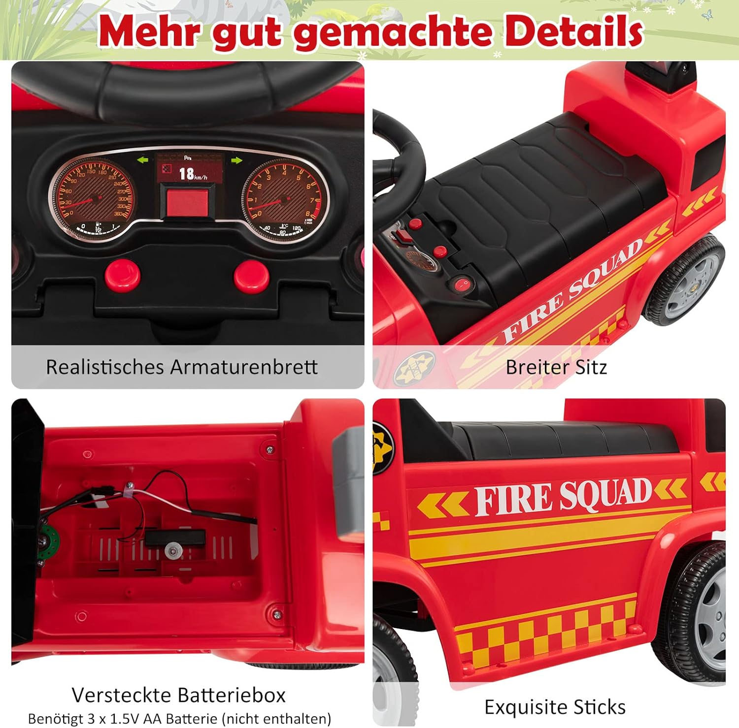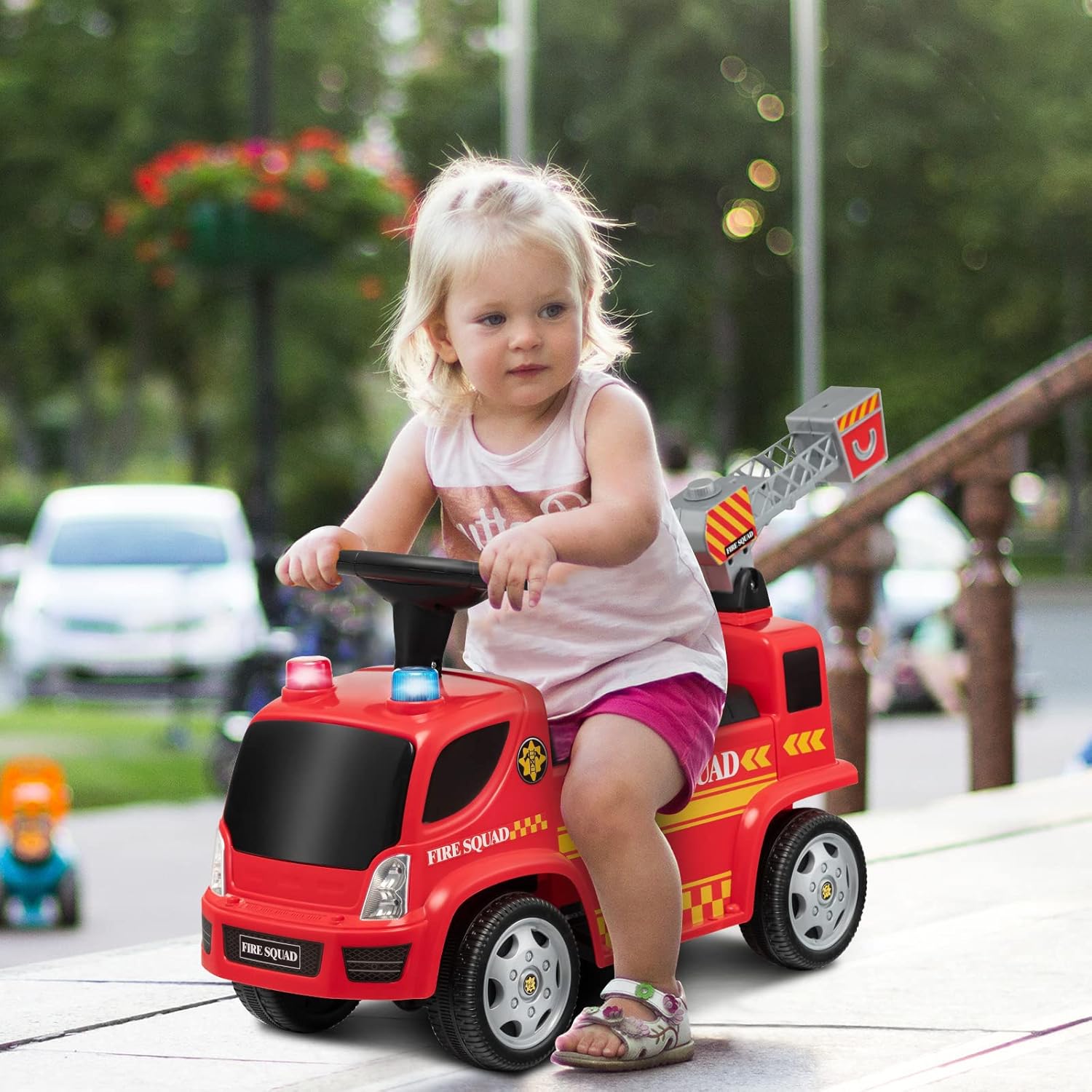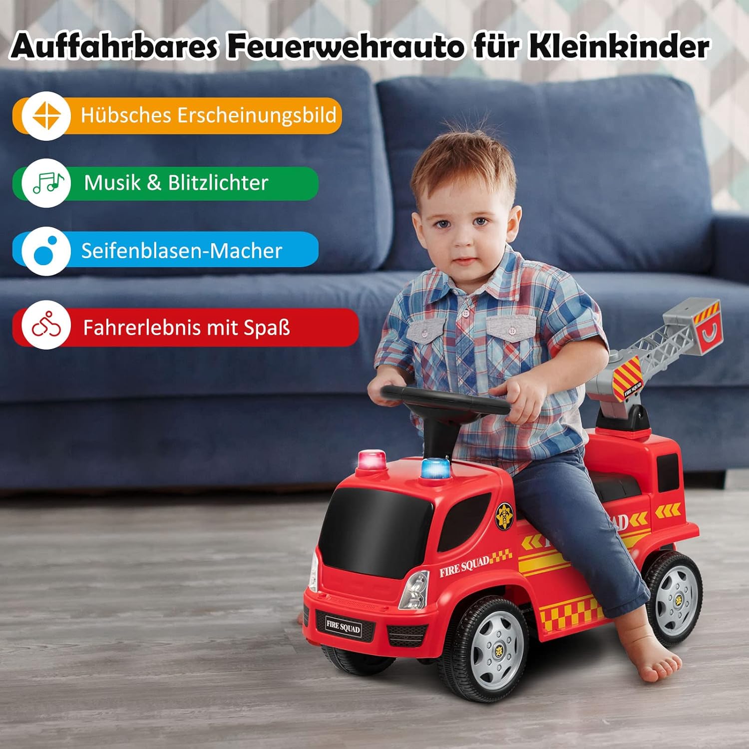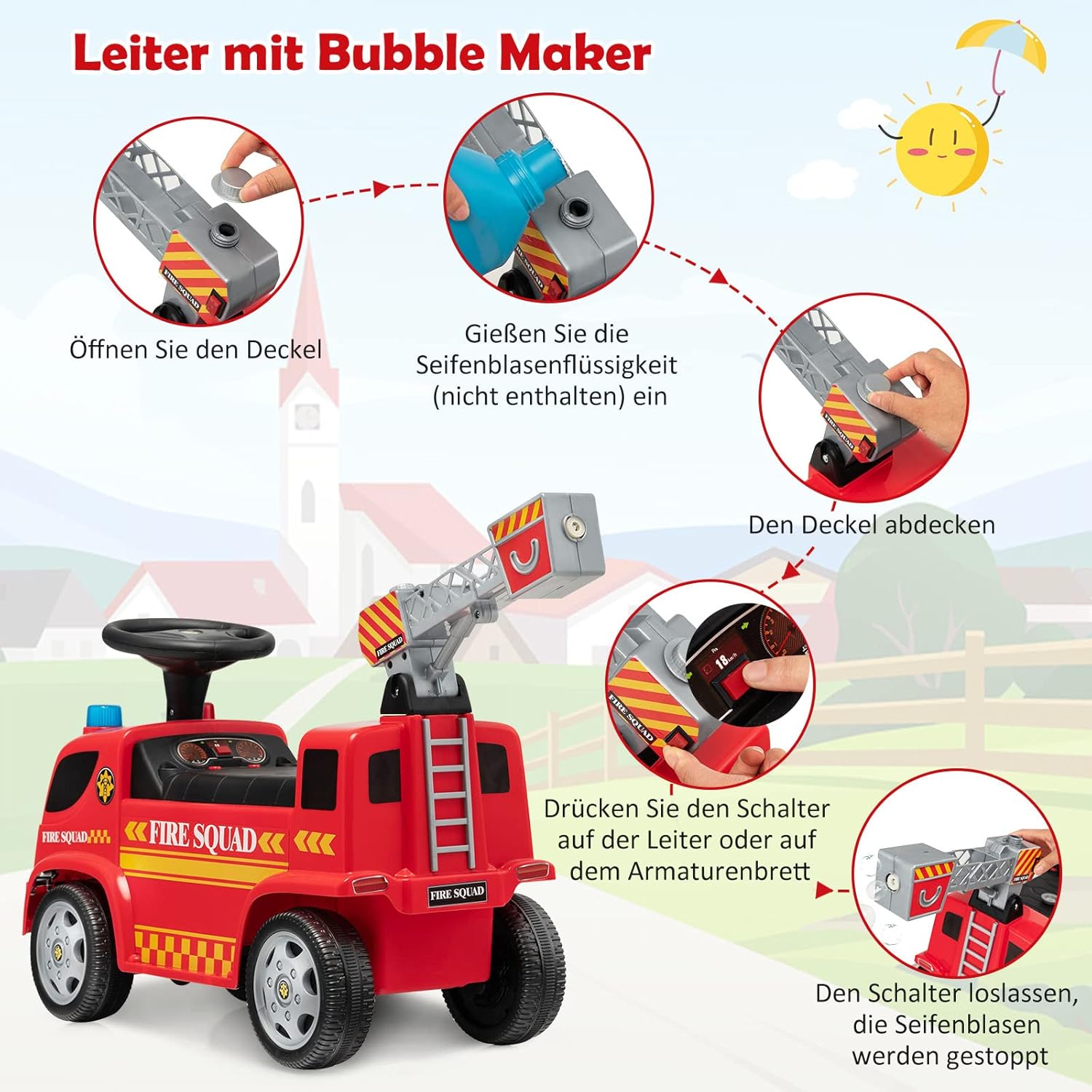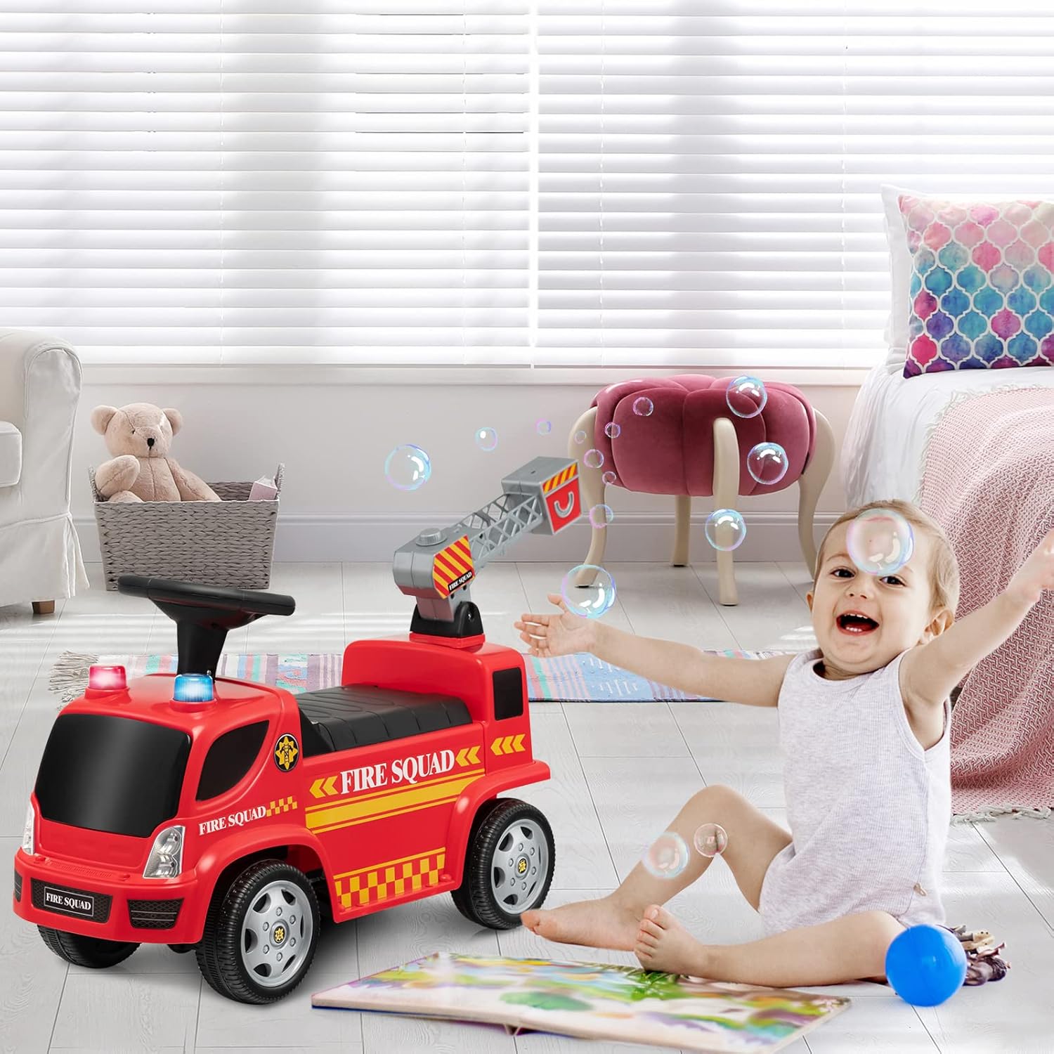 【Scala con pistola a bolle】 Questo camion dei pompieri mobile combina scala e pistola a bolle, offrendo più divertimento ai bambini. Basta versare il liquido per bolle (non incluso) e premere l'interruttore sulla scala o sul cruscotto e la scala soffierà bolle colorate. 【Suoni e fari interessanti】 Per un maggiore divertimento di guida, questo camion dei pompieri scorrevole è dotato di effetti sonori e fari. Quando i bambini premono il pulsante sotto il cruscotto, possono sentire i suoni e la musica della sirena reale. Le luci rosse e blu lampeggiano contemporaneamente. 【Materiale durevole e struttura stabile】 Realizzata in materiale PP di alta qualità, l'auto per bambini è abbastanza stabile. Le 4 ruote robuste forniscono inoltre ulteriore stabilità, rendendo questa macchina per bambini stabile su varie superfici piane. 【Ottimo regalo per i bambini】 Questa macchinina ha l'aspetto realistico di un'autopompa antincendio ed è un regalo ideale per i bambini dai 18 ai 36 mesi. Facendo scorrere le gambe in avanti, i bambini non solo possono godersi il divertimento della guida, ma anche allenare i muscoli delle gambe. 【Assemblaggio Senza Sforzo】La confezione include un manuale di istruzioni dettagliato per aiutarti a montare rapidamente tutte le parti, risparmiando tempo ed energia. Inoltre, il suo peso leggero ti consente di portarlo facilmente ovunque.