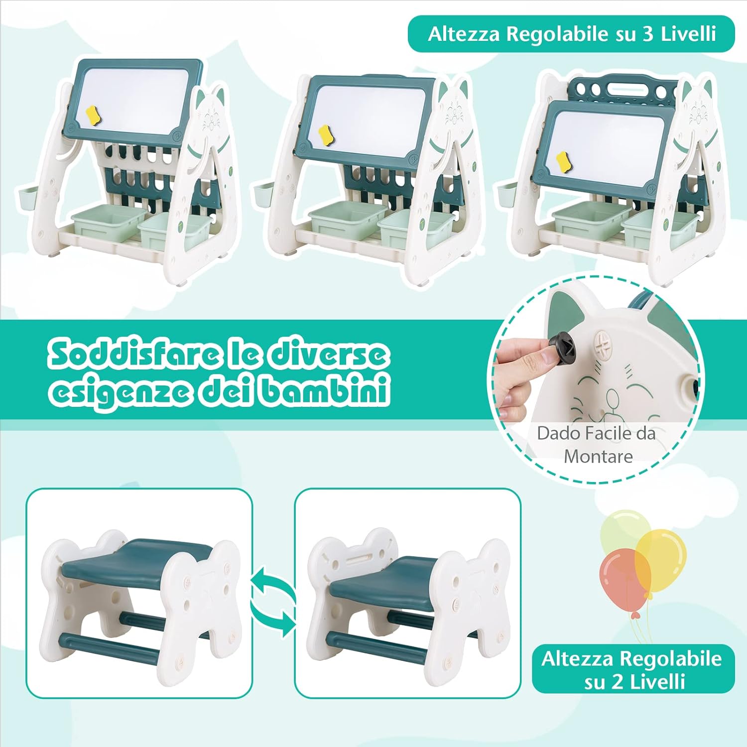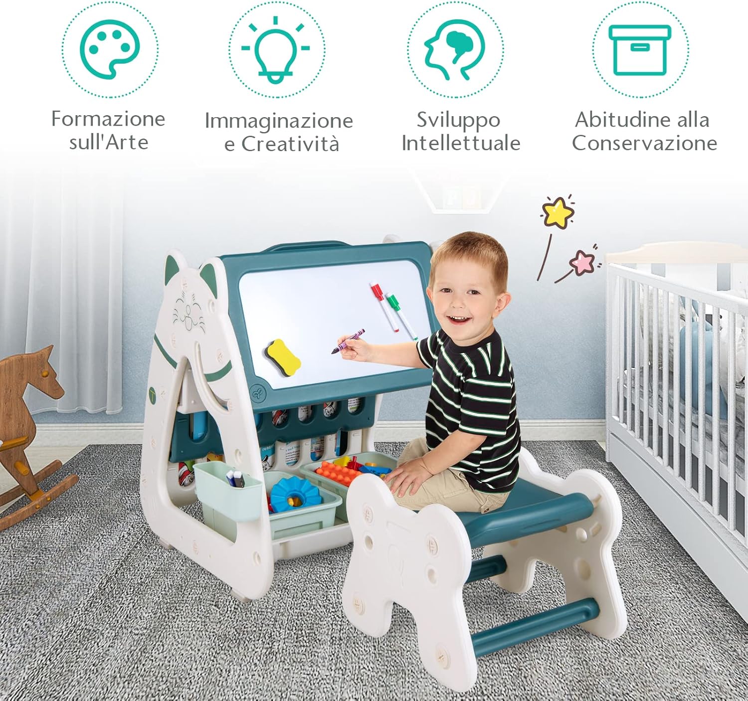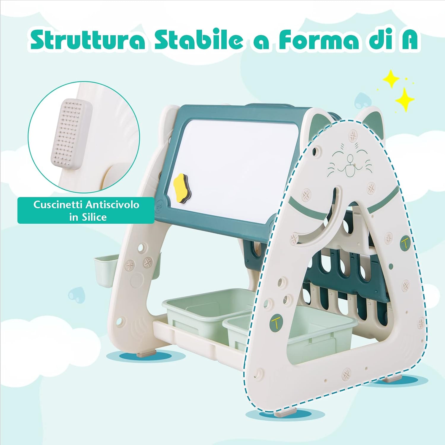 【Cavalletto artistico per bambini 3 in 1】Il cavalletto artistico multifunzionale è dotato di un porta-libri su un lato e di una lavagna cancellabile su due lati con scrivania sull’altro lato. Crea un centro di apprendimento e di gioco completo per i bambini. 【Sgabello regolabile in altezza】Il cavalletto artistico per bambini è abbinato a uno sgabello ergonomico che offre un comfort eccezionale ai piccoli artisti durante le lunghe ore di gioco. Inoltre, le due opzioni di altezza del sedile (19/ 24cm) consentono di tenere il passo con i bambini che crescono rapidamente. 【Materiale sicuro e struttura stabile】Realizzato in materiale PE premium e inodore, questo set di cavalletto. L’angolo arrotondato e il bordo liscio proteggono efficacemente i bambini dai graffi. La struttura ad A e i 4 feltrini antiscivolo in silice assicurano una grande stabilità. 【Ampio spazio di archiviazione】Sotto il cavalletto sono presenti 2 ampi contenitori e un portapenne sul lato, che consentono di tenere a portata di mano gli oggetti d’arte, i giocattoli e altre necessità dei bambini. 【Ottimo regalo per i vostri piccoli】Dotato di 4 pennarelli colorati e 1 gomma magnetica, il cavalletto artistico multifunzionale a doppia faccia è un regalo perfetto per bambini da 1 a 5 anni in occasione del compleanno, del Natale, ecc.
