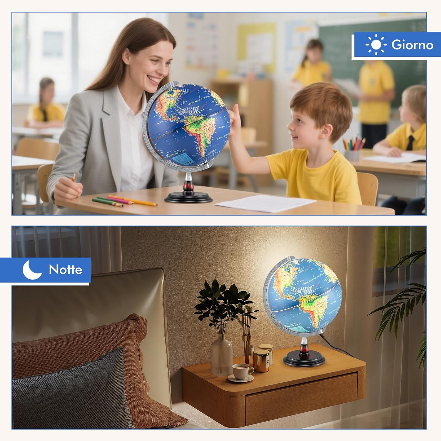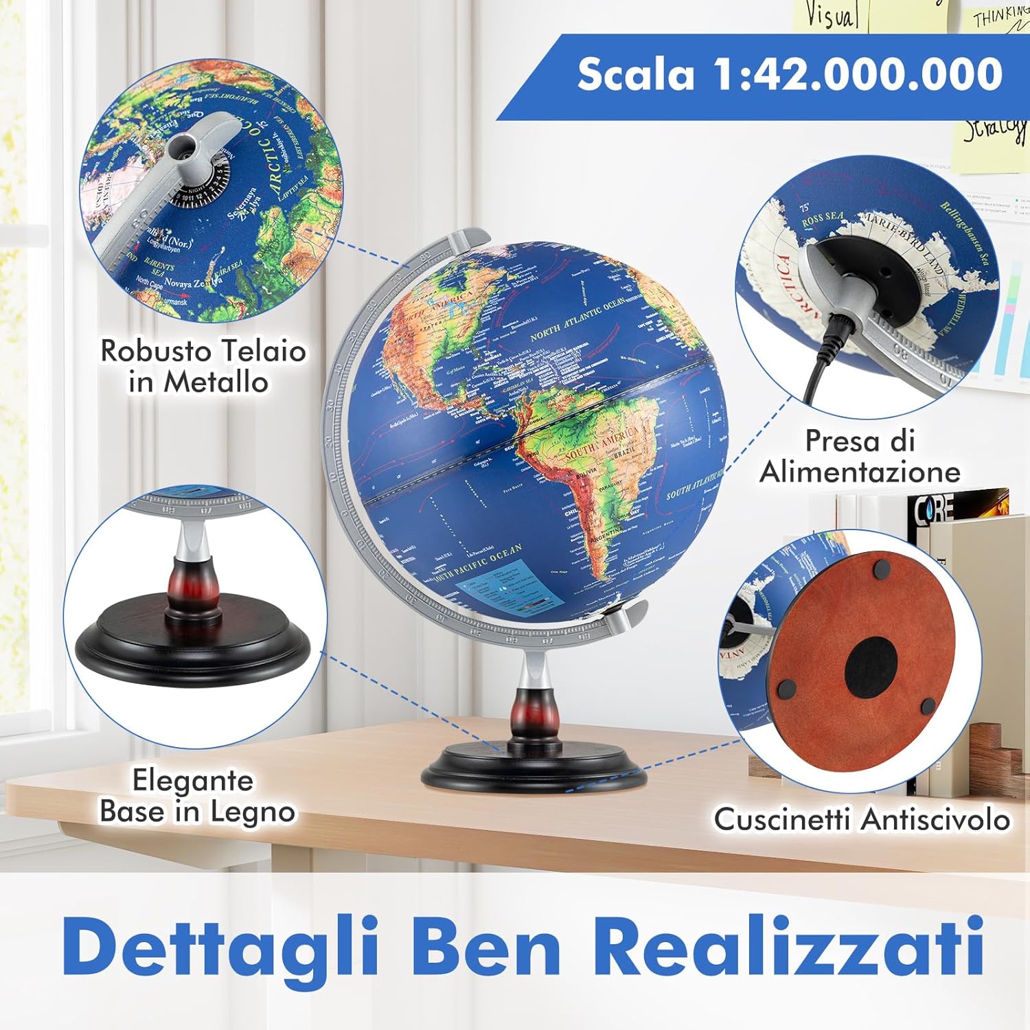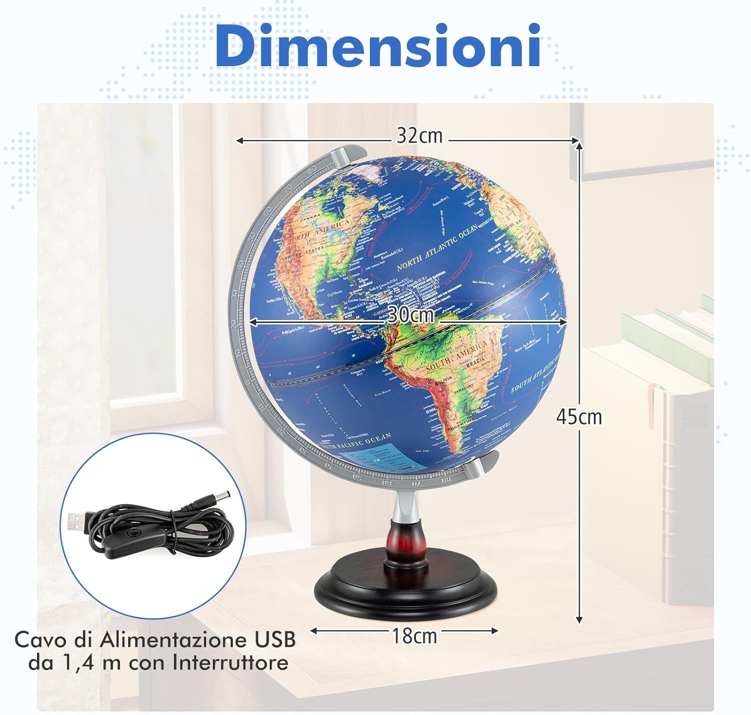 【Decorazione Multifunzionale】Questo globo illuminato svolge molteplici funzioni: è uno strumento di apprendimento dettagliato, un elemento decorativo attraente, una luce notturna rilassante o un regalo caldo e accogliente. Il suo design versatile si adatta a diversi ambienti, come casa, scuole, uffici e altro. 【Dettagli Chiari e Vibranti】Il globo presenta una resa ad alta definizione di continenti, oceani, isole, fiumi, laghi, paesi, capitali, principali città e confini politici. La sua superficie in rilievo offre un'esperienza tattile, facilitando il riconoscimento delle caratteristiche geografiche. 【Esplora il Mondo da Ogni Angolazione】Puoi ruotare il globo di 360° con movimento fluido per esplorare facilmente la geografia globale. Questa caratteristica, unita ai dettagli in rilievo e al quadrante superiore, lo rende uno strumento educativo superiore per tutte le età. 【Costruzione Robusta】Realizzato con una solida struttura metallica con indicazioni di altitudine dettagliate, questo globo terrestre è non solo durevole ma anche informativo, offrendo un ulteriore livello di approfondimento geografico, ideale sia per l’educazione che per la decorazione. 【Dettagli Ben Curati】La base elegante in legno è dotata di piedini antiscivolo, combinando eleganza estetica e funzionalità pratica. La presa di alimentazione si trova sotto il globo e la confezione include un cavo USB da 1,4 m con interruttore.