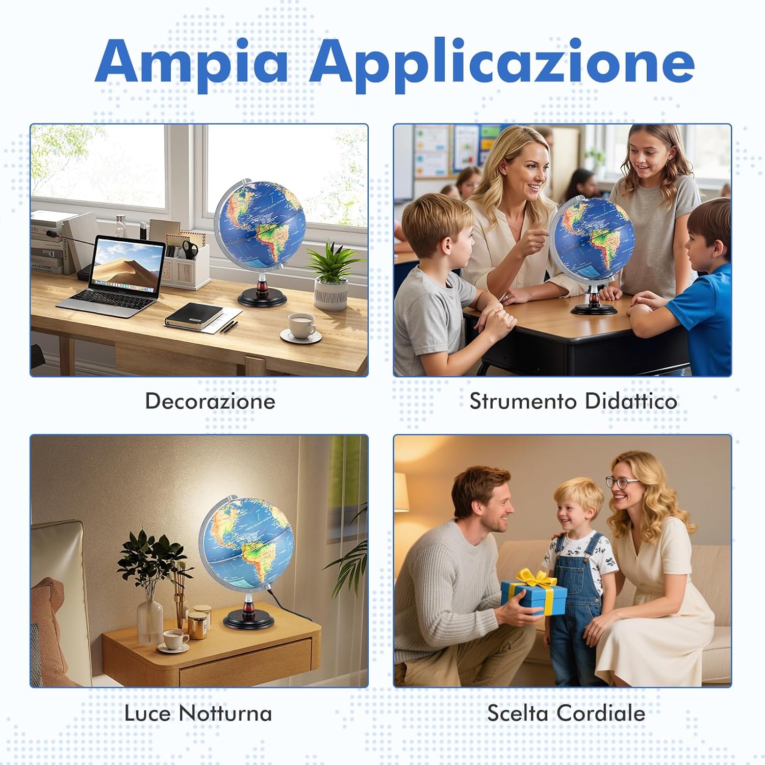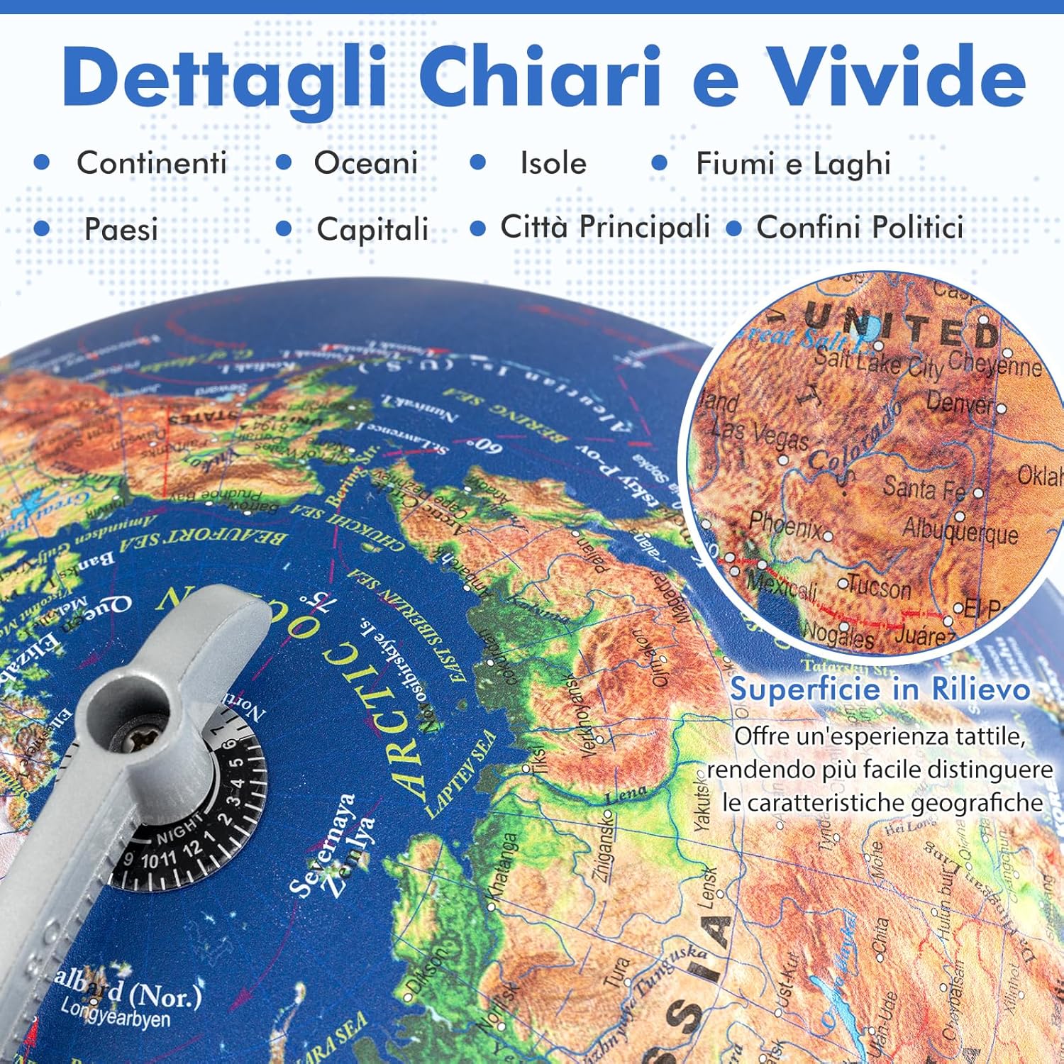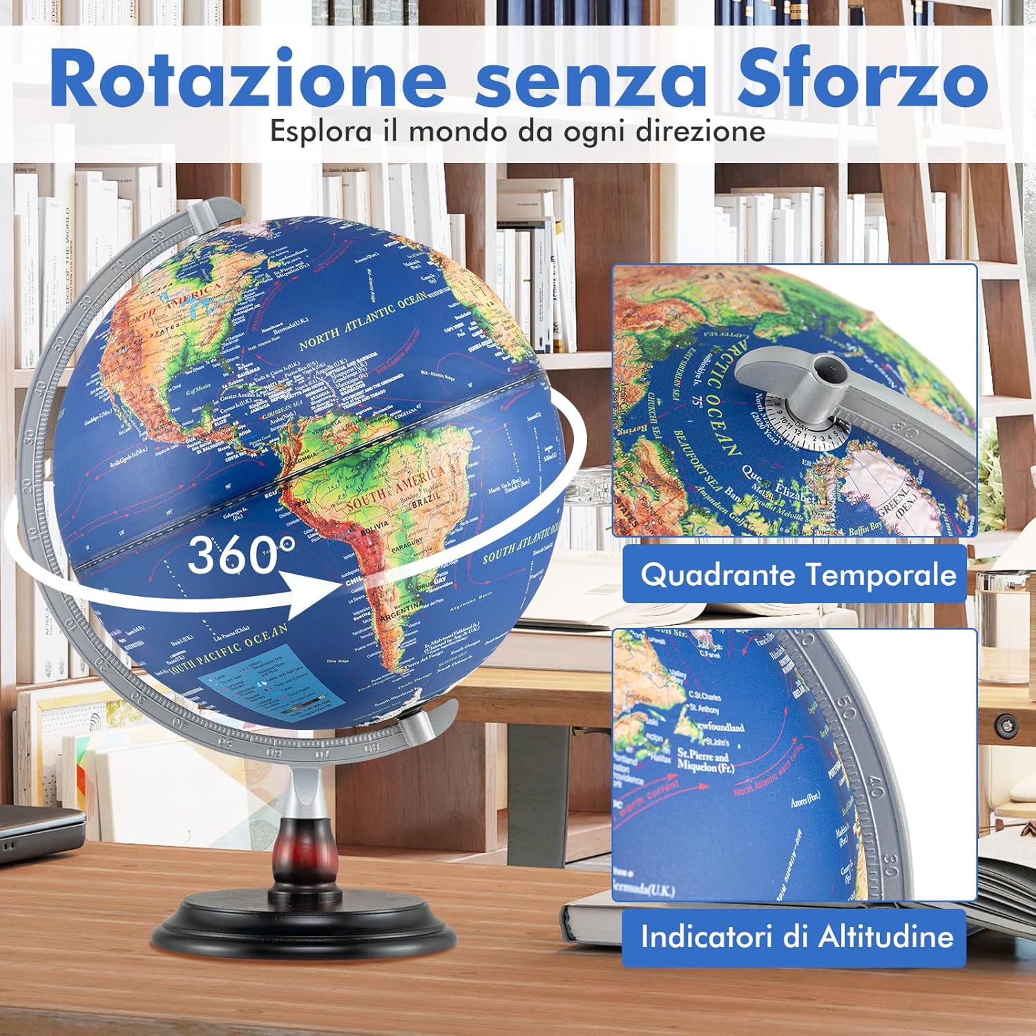 【Decorazione Multifunzionale】Questo globo illuminato svolge molteplici funzioni: è uno strumento di apprendimento dettagliato, un elemento decorativo attraente, una luce notturna rilassante o un regalo caldo e accogliente. Il suo design versatile si adatta a diversi ambienti, come casa, scuole, uffici e altro. 【Dettagli Chiari e Vibranti】Il globo presenta una resa ad alta definizione di continenti, oceani, isole, fiumi, laghi, paesi, capitali, principali città e confini politici. La sua superficie in rilievo offre un'esperienza tattile, facilitando il riconoscimento delle caratteristiche geografiche. 【Esplora il Mondo da Ogni Angolazione】Puoi ruotare il globo di 360° con movimento fluido per esplorare facilmente la geografia globale. Questa caratteristica, unita ai dettagli in rilievo e al quadrante superiore, lo rende uno strumento educativo superiore per tutte le età. 【Costruzione Robusta】Realizzato con una solida struttura metallica con indicazioni di altitudine dettagliate, questo globo terrestre è non solo durevole ma anche informativo, offrendo un ulteriore livello di approfondimento geografico, ideale sia per l’educazione che per la decorazione. 【Dettagli Ben Curati】La base elegante in legno è dotata di piedini antiscivolo, combinando eleganza estetica e funzionalità pratica. La presa di alimentazione si trova sotto il globo e la confezione include un cavo USB da 1,4 m con interruttore.
