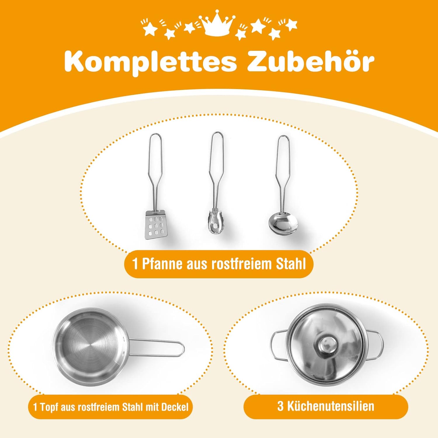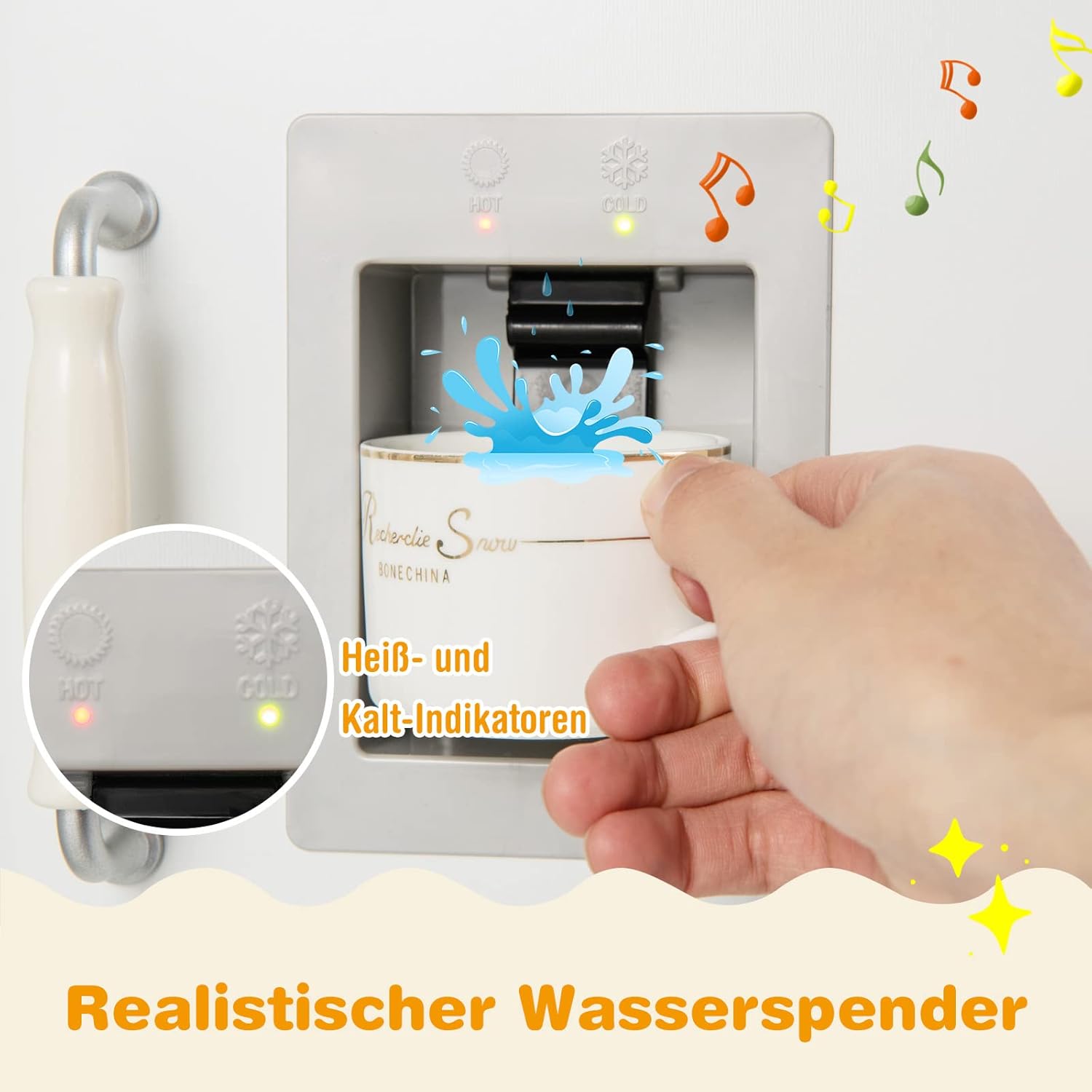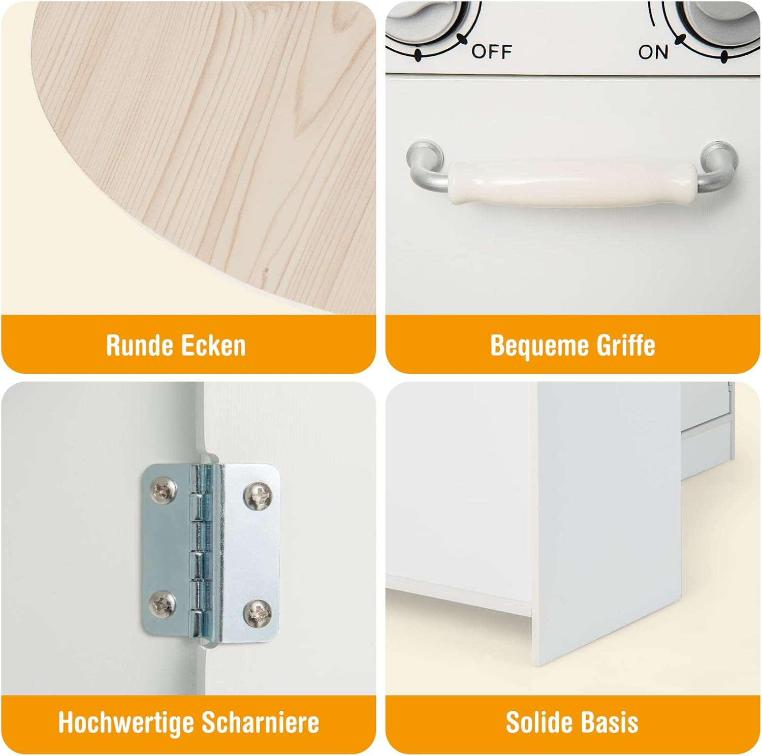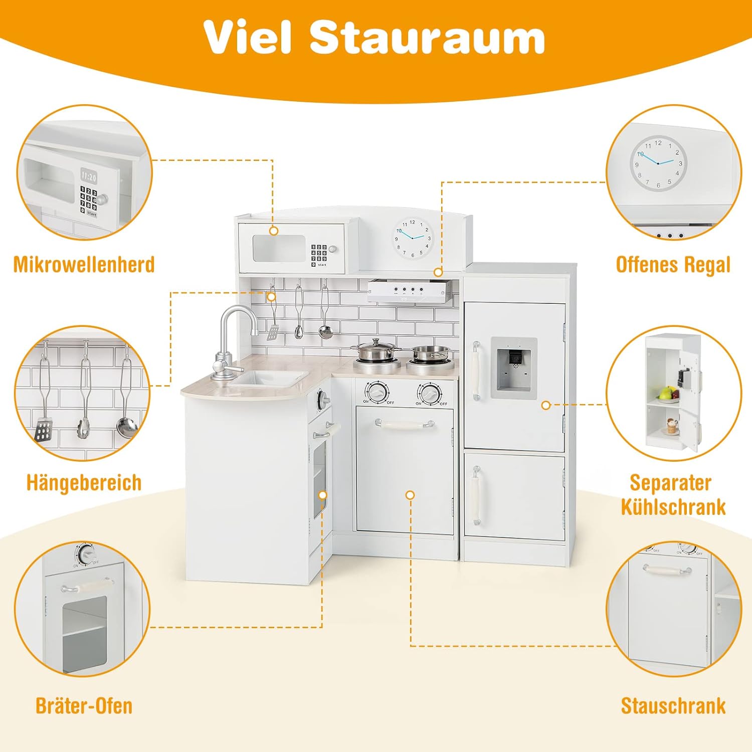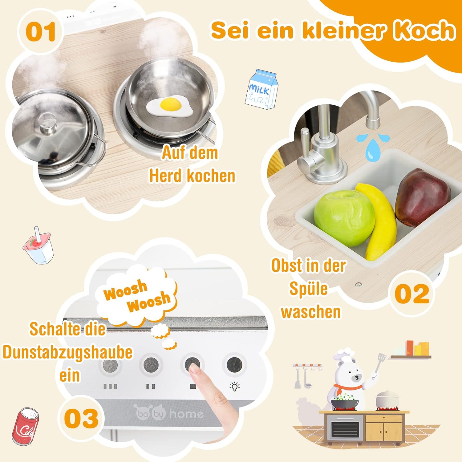 🍳【Funzioni di cottura realistiche】Questa cucina giocattolo in legno offre ai bambini una vera esperienza culinaria. Quando si posiziona la tazza sotto il distributore d'acqua, vengono visualizzati gli indicatori di caldo e freddo. I più piccoli possono anche lavare le verdure nel lavandino, accendere la cappa aspirante e cucinare sui fornelli. 🍳【Design a forma di L e frigorifero separato】Con il suo esclusivo design a forma di L, questo set da gioco da cucina per bambini si adatta perfettamente a qualsiasi angolo della tua casa e non occupa troppo spazio. Inoltre, il frigorifero separato può essere facilmente rimosso quando non viene utilizzato per risparmiare più spazio. 🍳【Accessori estesi】Il nostro set da gioco da cucina contiene 1 padella in acciaio inossidabile, 1 pentola in acciaio inossidabile con coperchio e 3 utensili da cucina. Quando non vengono utilizzati, tutti gli accessori possono essere riposti nell'armadio portaoggetti. 🍳 【Costruzione durevole e stabile】 I pannelli MDF di alta qualità lo rendono durevole e abbastanza resistente per un uso a lungo termine. L'ampia base lo mantiene stabile a terra. Inoltre, il materiale a misura di bambino non danneggia la salute dei bambini. I bordi senza sbavature e gli angoli arrotondati proteggono la pelle delicata dei bambini dai graffi. 🍳 【Giocattoli educativi per bambini piccoli】 Con colori classici e altezza adatta ai bambini, questo set da gioco da cucina è la scelta ideale per far giocare i bambini in soggiorno, nella stanza dei bambini o nella sala giochi. Giocando al gioco di cucina, i bambini non solo possono imparare di più sulle abilità culinarie, ma anche allenare il loro pensiero logico e le loro capacità motorie.