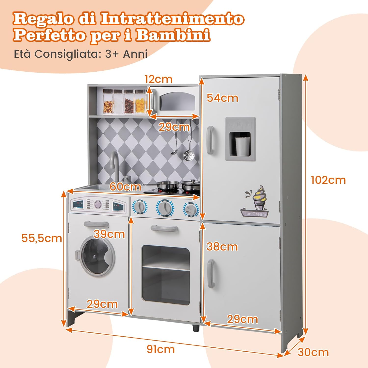 【Esperienza di Gioco Immersiva】Questa cucina giocattolo per bambini è dotata di un lavandino con rubinetto, una lavatrice, un forno, un microonde, una macchina del ghiaccio e un piano cottura. Inoltre, include una pentola, una padella, una tazza, 2 cubetti di ghiaccio e 3 utensili da cucina per arricchire il gioco di fantasia. 【Effetti Sonori e Luminosi Realistici】Questa cucina per bambini in legno si illumina e produce suoni di cucina realistici, facendo sentire i bambini dei veri chef mentre esplorano la cucina. Inoltre, quando si gira la manopola si sente un clic. 【Ottima Stabilità e Sicurezza】La cucina per bambini è realizzata in MDF di alta qualità e soddisfa elevati standard di qualità e sicurezza. Inoltre, l'aggiunta di una gamba di supporto extra al centro della base garantisce un'area di gioco robusta e sicura. 【Ampio Spazio di Stoccaggio】La cucina giocattolo è dotata di 5 armadietti chiusi, 1 scomparto aperto e 3 ganci appesi, che possono servire come armadietti extra per libri, giocattoli e generi alimentari. 【Regalo perfetto per i bambini】Questa cucina legno per bambini è più di un semplice giocattolo, può ispirare l'immaginazione dei bambini, sviluppare la coordinazione occhio-mano, esercitare le capacità di apprendimento e coltivare le abilità sociali, rendendolo un regalo perfetto per bambini dai 3+ anni !