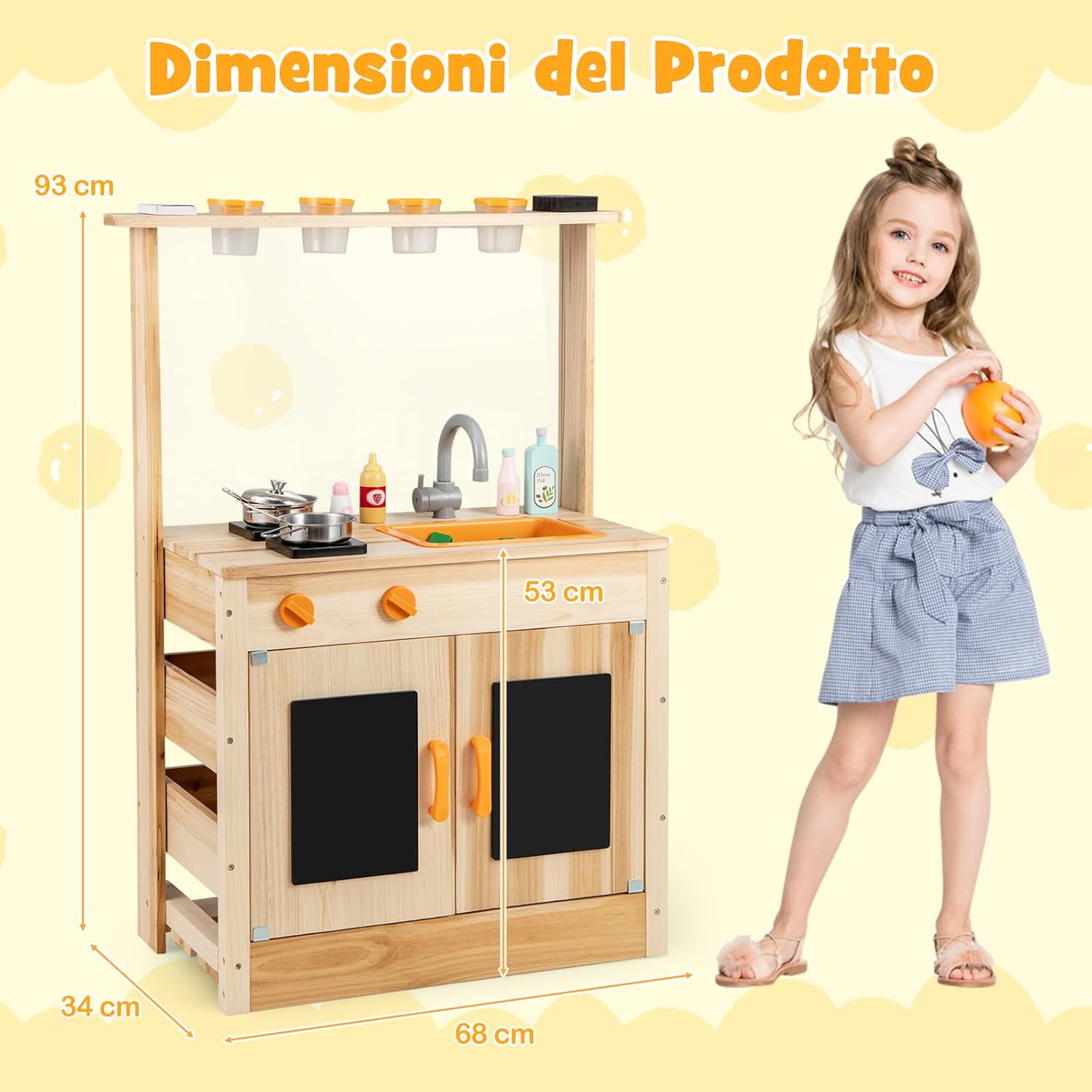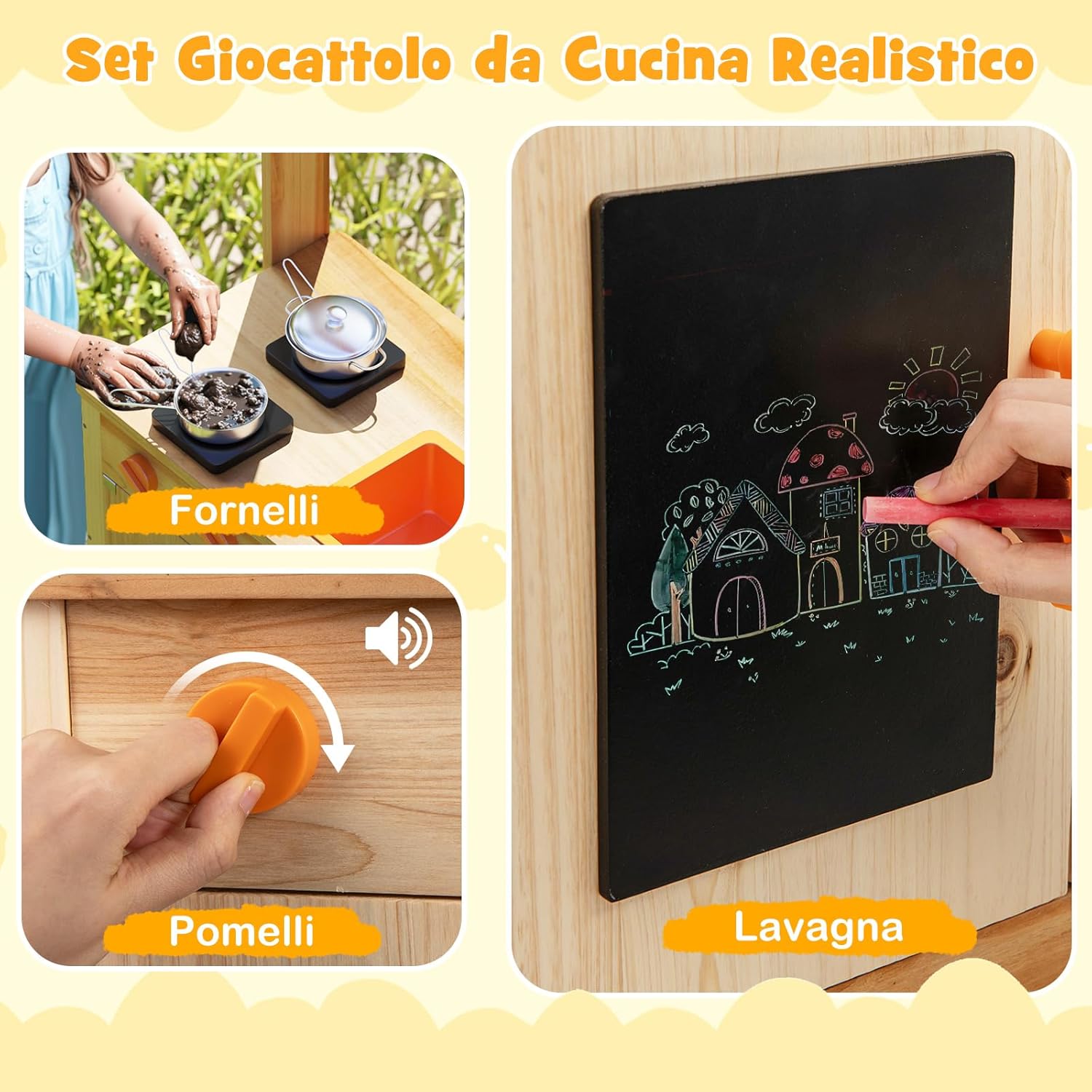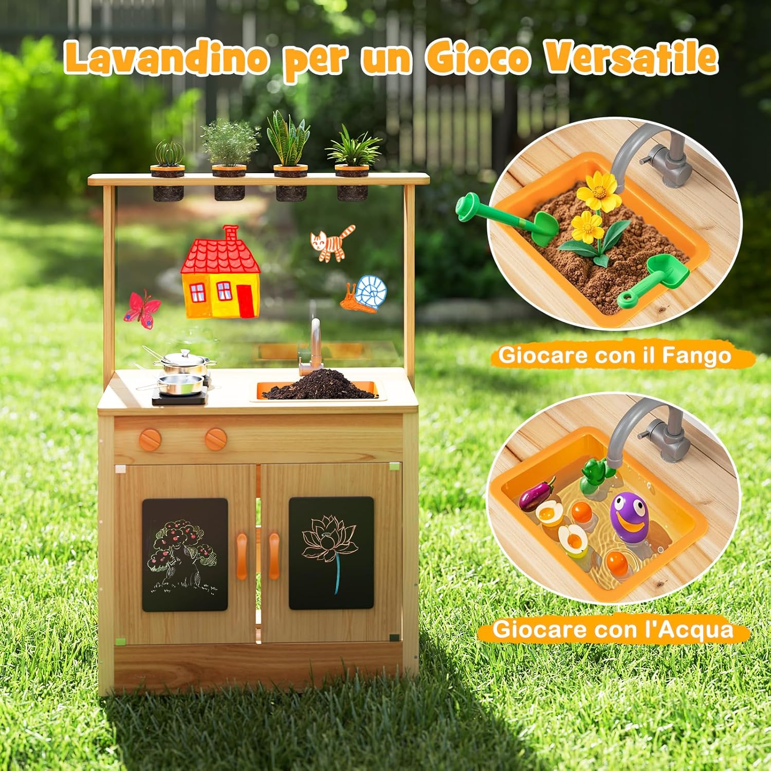 【Ben Realizzata per Affidabilità】Realizzata in robusto legno di abete, questa cucina da giardino per bambini è progettata per resistere ai giochi intensi dei bambini. Presenta una superficie senza schegge e bordi arrotondati per garantire un ambiente di gioco sicuro e affidabile. 【Divertiti con il Giardinaggio】Il set da cucina in legno all'aperto è dotato di 4 vasi da giardinaggio che offrono un'opportunità pratica per i bambini di piantare, coltivare e osservare la crescita delle piante. Questo approccio interattivo non solo intrattiene, ma educa, favorendo un legame con la natura. 【Cucina da Gioco Realistica】Con utensili, pentola e padella, i piccoli chef possono cimentarsi nella cucina da esterno immaginaria sui fornelli. C'è anche un lavandino per un gioco versatile, dove i bambini possono giocare con acqua o terra. Inoltre, le lavagne sono fornite con scatola di gessetti e gomma per migliorare l'espressione creativa. 【Facile Installazione e Stoccaggio】Questo set da cucina per bambini si monta rapidamente con poco sforzo, risparmiando tempo ed energia ai genitori. Il capiente armadietto per lo stoccaggio promuove l'ordine, rendendolo un'aggiunta ideale per le aree di gioco all'aperto, incoraggiando l'organizzazione fin dalla giovane età. 【Regalo Fantastico per i Bambini】Questo set da cucina in legno è un regalo eccezionale per bambini 3+ anni e rispetta elevati standard di sicurezza e affidabilità. È perfetto per compleanni, festività o altre occasioni speciali, diventando un'aggiunta accogliente nell'area giochi dei bambini e stimolando creatività e abilità sociali.