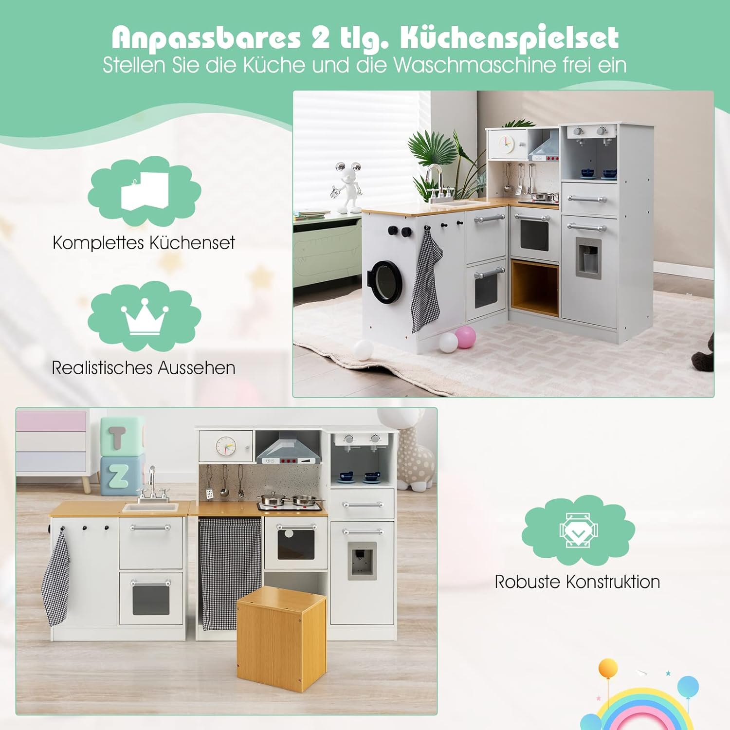 【Set da gioco in 2 pezzi】 A differenza dei normali set da gioco per bambini sul mercato, il nostro set di giocattoli in 2 pezzi contiene due parti, cucina e lavastoviglie, che possono essere disposte liberamente in base alla disposizione della stanza e alle preferenze dei bambini. Nel frattempo, la spaziosa area giochi permette al tuo piccolo di invitare più amici a divertirsi insieme. 【Progettato per stabilità e sicurezza】L'MDF ben selezionato e inodore crea un ambiente di gioco stabile e duraturo per i bambini. E la superficie è lucida, liscia e arrotondata per un gioco sicuro. 【Esperienza culinaria realistica】 I bambini possono godersi ore di divertimento con una varietà di utensili da cucina realistici, un'autentica caffettiera e un distributore d'acqua. E anche la cappa aspirante e il fornello riproducono l'esperienza reale con suoni vivaci e luci brillanti. Richiede 6 batterie AAA (non incluse). 【Varie opzioni di stoccaggio e pratico sgabello】 Oltre all'interessante attrezzatura da cucina, il set da gioco offre anche spazio sufficiente per riporre gli oggetti. Dopo il gioco, puoi riporre accessori e altri giocattoli nei cassetti e negli armadietti estraibili. Inoltre, lo sgabello non solo offre una comoda seduta per i bambini, ma può essere utilizzato anche come contenitore. 【Regalo perfetto per i bambini】 Questo set da gioco da cucina in 2 pezzi combina funzioni divertenti ed educative in uno, offre ai bambini uno spazio di gioco da sogno e li aiuta a sviluppare abilità pratiche, immaginazione, abilità sociali e altro ancora. Pertanto, è una scelta regalo perfetta per ragazzi e ragazze in occasione di compleanni, Natale e altre feste.