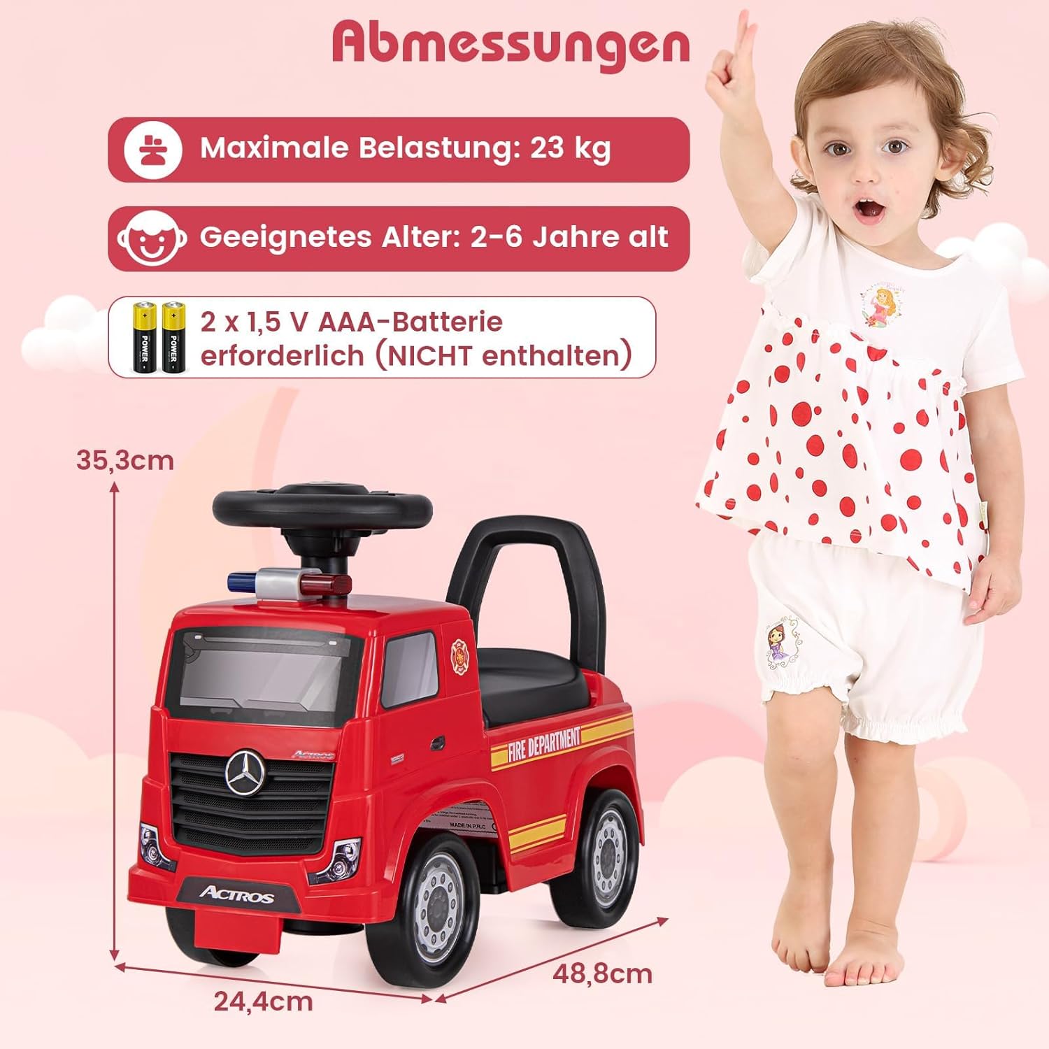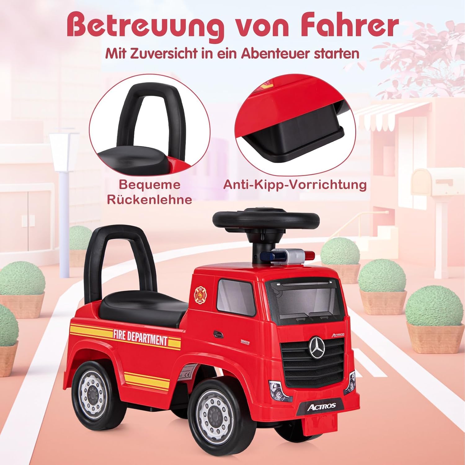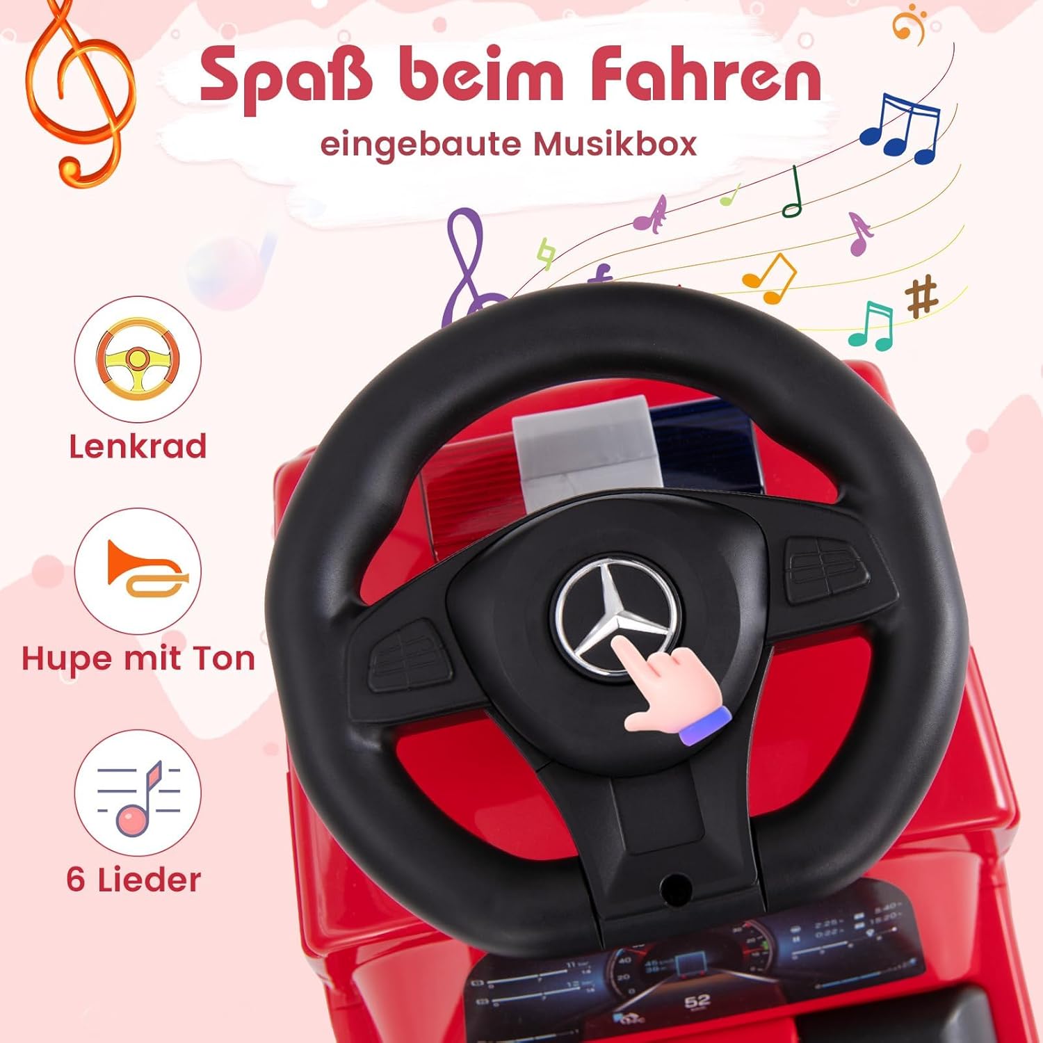【Autentico design Mercedes-Benz】 Concesso in licenza da Mercedes-Benz, il camion a spinta garantisce un'esperienza autentica e di prima classe per il tuo bambino. Lo stile dell'autopompa con un cruscotto vivace e una spia di allarme aggiunge divertimento alla guida. 【Divertimento in doppia modalità】 L'auto da corsa è dotata di un sedile adatto ai bambini e di uno schienale di supporto che funge anche da maniglia di spinta, con la possibilità di essere fatta scorrere e spinta. Permette ai bambini di godersi passeggiate fluide all'interno e all'esterno. 【Volante musicale】Stimola i sensi uditivi di tuo figlio con un volante che funge anche da carillon, suonando 6 deliziose canzoni e suonando il clacson mentre vanno all'avventura. Richiede 2 batterie AAA da 1,5 V (non incluse). 【Portaoggetti sotto il sedile】 Il comodo vano portaoggetti sotto il sedile è perfetto per riporre giocattoli o tesori, rendendo questa macchina a spinta non solo un giocattolo ma anche un compagno di giochi portatile. 【Guida fluida con dispositivo antiribaltamento】 L'auto a spinta è dotata di ruote di alta qualità in grado di gestire diversi tipi di terreno. E per garantire la sicurezza di guida, questo cavalcabile è dotato di un meccanismo antiribaltamento integrato per prevenire incidenti e garantire tranquillità ai genitori.