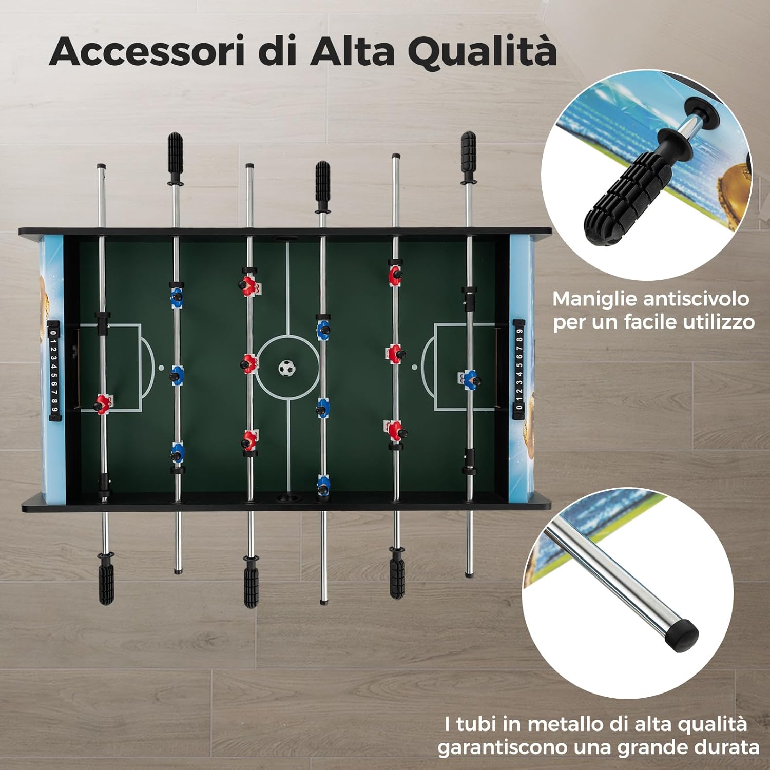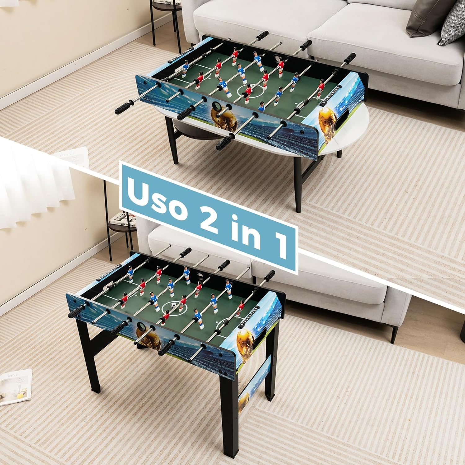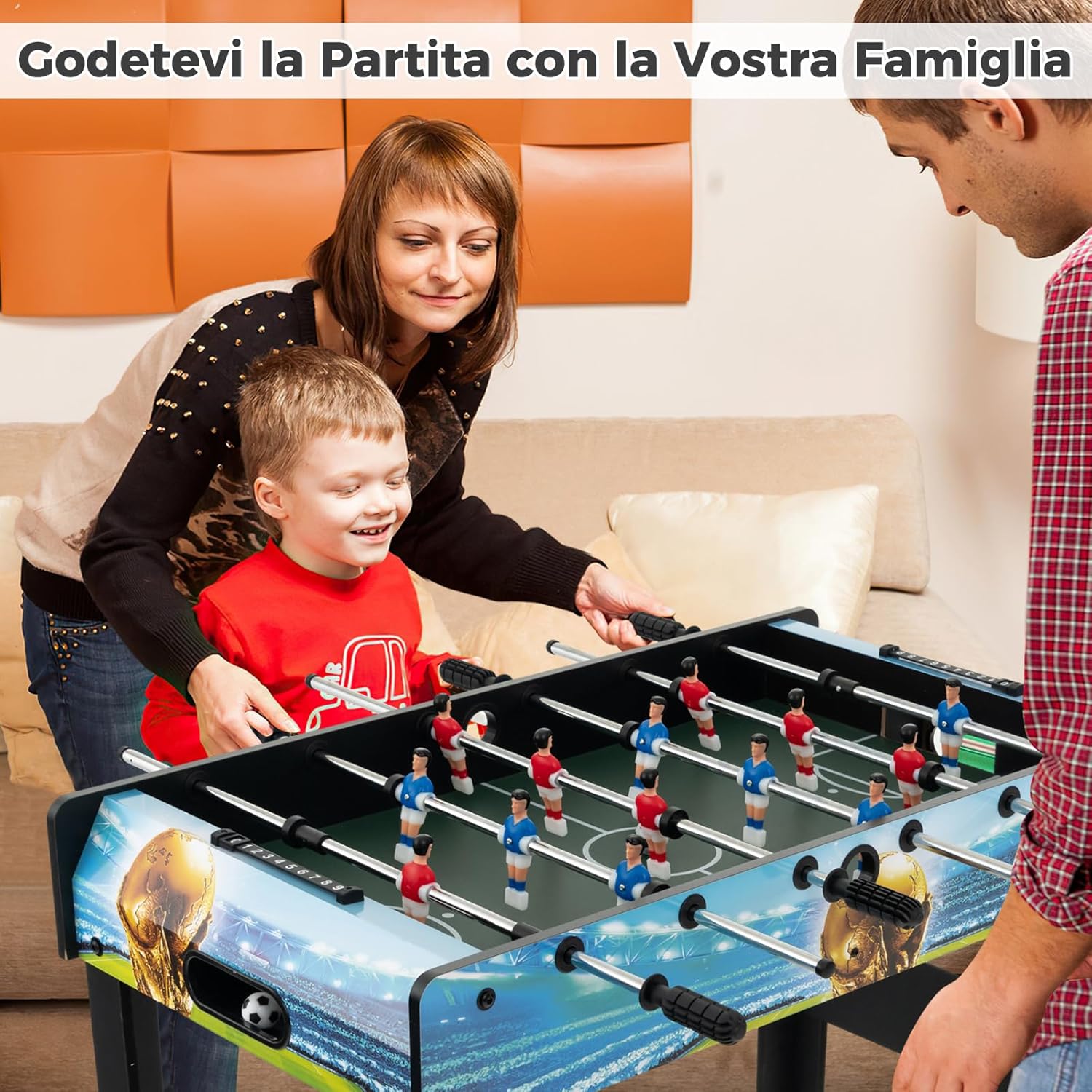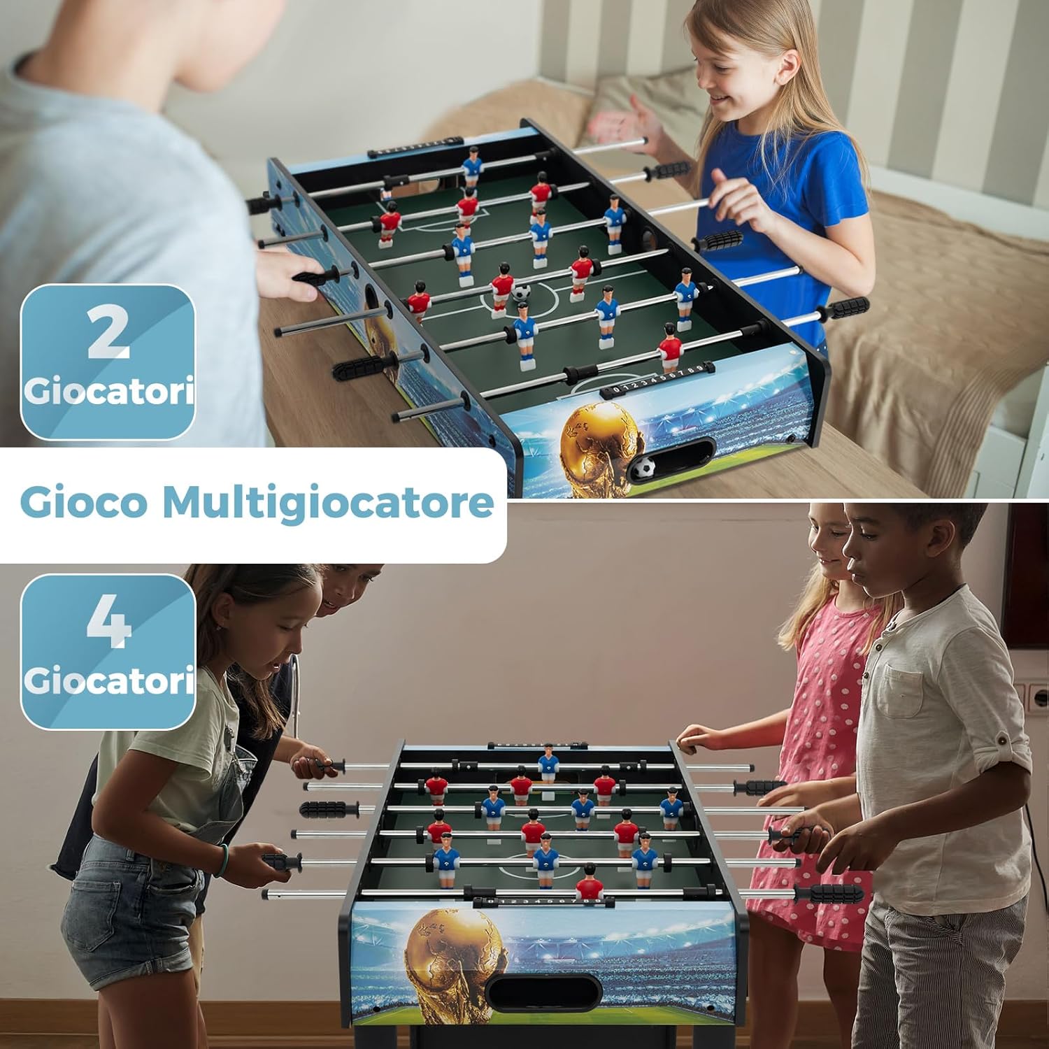 【Gioco Interattivo per la Famiglia】Questo biliardino da casa consente a te e alla tua famiglia di partecipare a partite competitive. Migliora l'interazione e favorisce i rapporti tra voi. Questo gioco multiplayer è perfetto per 2-4 giocatori che giocano contemporaneamente. 【Gambe Rimovibili e Segnapunti】Le quattro gambe possono essere facilmente staccate, rimuovi le gambe e posizionalo sul tavolo, senza preoccuparti delle restrizioni di altezza. Inoltre, i due segnapunti da 10 punti ti aiutano a tenere traccia del punteggio del gioco, offrendo un'esperienza di partita realistica. 【Materiali Premium e Telaio Resistente】Combinando un telaio di legno di alta qualità con robuste aste in metallo, questo calcio balilla è abbastanza robusto da garantire una lunga durata. I manici confortevoli e antiscivolo in PP sono privi di sbavature, facilitando il controllo dei giocatori. Inoltre, 4 gambe di supporto con piedini antiscivolo offrono una maggiore stabilità. 【Utilizzo Versatile】Con le sue dimensioni compatte (94 x 51 x 68,5 cm), il nostro mini calcetto da tavolo è salvaspazio e adatto a aree di piccole dimensioni. Può essere utilizzato in varie occasioni come serate di gioco, riunioni familiari, attività picnic o relax in ufficio. 【Regalo Perfetto per i Bambini】Con un design a tema calcio, 14 giocatori simulati colorati e un campo da calcio realistico, questo gioco di calcio mini di 94 cm migliora la coordinazione occhio-mano dei bambini e incoraggia la competizione amichevole. Pertanto, è il regalo perfetto per compleanni, Natale o le vacanze per bambini dai 6 anni in su.