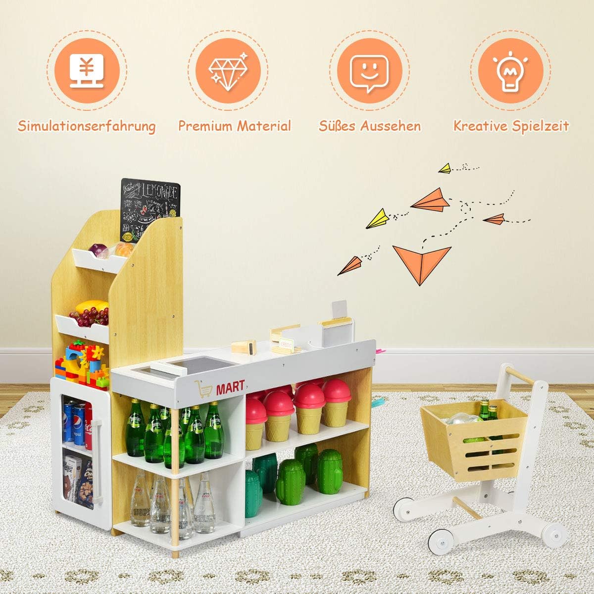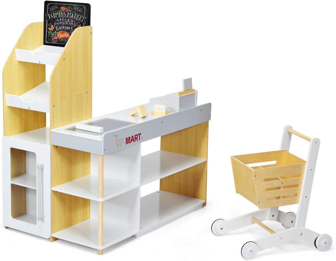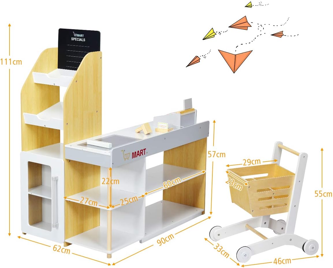 【Gioco fantasioso del supermercato】 Questo set da gioco del supermercato è progettato per ispirare i piccoli clienti a curiosare tra gli scaffali, fingere di fare acquisti e pagare con il "cassiere". Puoi selezionare gli snack e aggiungerli al carrello. 【Materiale sicuro e di alta qualità】 Realizzato in MDF di alta qualità e legno di pino massiccio, questo giocattolo da cassiere per bambini è robusto e resistente all'usura per un uso a lungo termine. Non ha sbavature e non danneggia la pelle dei bambini. Inoltre, i bordi lisci e gli angoli curvi garantiscono una buona sicurezza. 【Versatilità pratica】 Puoi insegnare ai bambini i soldi e come calcolarli con il simpatico set da cassiere. E il bambino può giocare con amici e fratelli per sviluppare abilità sociali e coordinazione occhio-mano. 【Regalo perfetto per i bambini】 Questo supermercato giocattolo compatto viene fornito con un carrello della spesa mobile, scanner, lettore di carte, carta di credito e 5 monete di legno. Il set per il gioco di ruolo è un regalo perfetto per i bambini dai 3 anni in su. 【Design umanizzato】 Sono presenti scaffali aperti multistrato dove è possibile posizionare vari snack, bevande, frutta, ecc. Questo negozio di alimentari in legno è dotato di un piccolo frigorifero con maniglia e fermaporta per raffreddare varie prelibatezze.