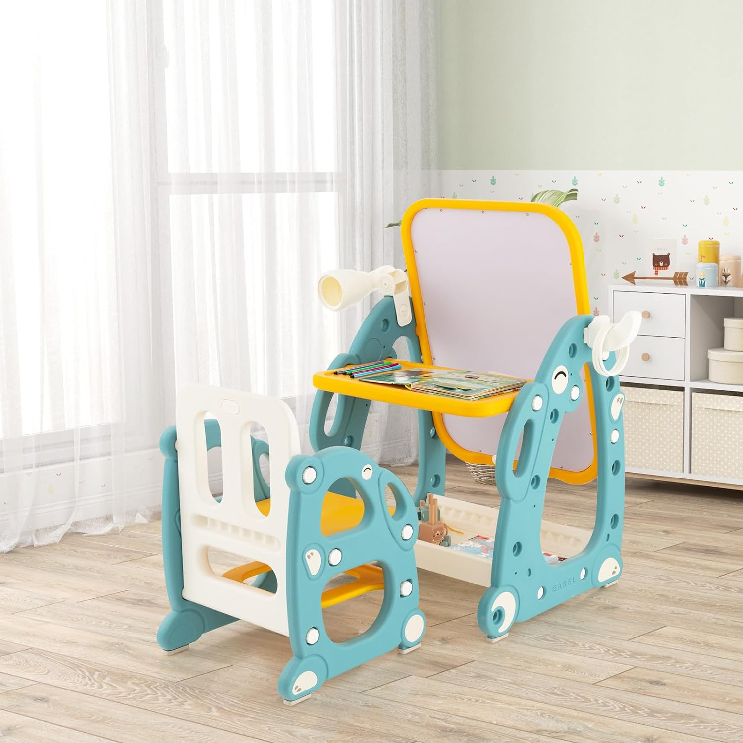【Design Multifunzionale 4 in 1】Il nostro cavalletto magnetico non offre solo ai bambini una lavagna magnetica per disegnare, ma presenta anche una scrivania per permettere ai bambini di fare i compiti o leggere libri. Suggerimento: Si prega di staccare la pellicola protettiva sulla lavagna prima dell'uso. Inoltre, ha un telescopio regolabile e un gioco dell'anello per fornire un divertimento senza fine. 【Altezza Regolabile e Sedia Confortevole】Il nostro cavalletto per bambini ha 3 posizioni regolabili da 70 cm a 90 cm per accompagnare meglio i bambini di diverse altezze nella loro crescita. Inoltre, la sedia ergonomica per bambini con schienale forato assicura un ottimo supporto per la schiena e per le anche, aiutando i bambini a sviluppare una buona postura seduta. 【Materiali Sicuri e Adatti ai Bambini】Il nostro set di cavalletto con sedia è realizzato con materiali sicuri per bambini e ha superato le certificazioni per un uso sicuro. Gli angoli arrotondati e i bordi privi di spigoli vivi proteggono i bambini da graffi accidentali. I piedini antiscivolo migliorano la stabilità complessiva. 【Accessori Carini e Spazio di Archiviazione】Lo scomparto aggiuntivo per penne è adatto per posizionare le forniture artistiche dei bambini, mentre il cestino portaoggetti aperto è ideale per molti giocattoli, libri o oggetti vari. Inoltre, sono inclusi 8 pennarelli, 3 anelli, 2 magneti e 1 gomma per rendere il disegno e il gioco un gioco da ragazzi. Può essere utilizzato nella camera dei bambini, nella sala giochi o nell'asilo. 【Regalo Ideale per il Tuo Piccolo】Il nostro cavalletto 4-in-1 sarà un regalo perfetto per feste e compleanni per animare i tuoi bambini. È adatto per bambini dai 1 agli 8 anni. I bambini eserciteranno la loro abilità pratica, immaginazione e creatività mentre disegnano e giocano. Inoltre, contribuisce a promuovere l'interazione genitore-figlio. Nel frattempo, è facile da montare e pulire.