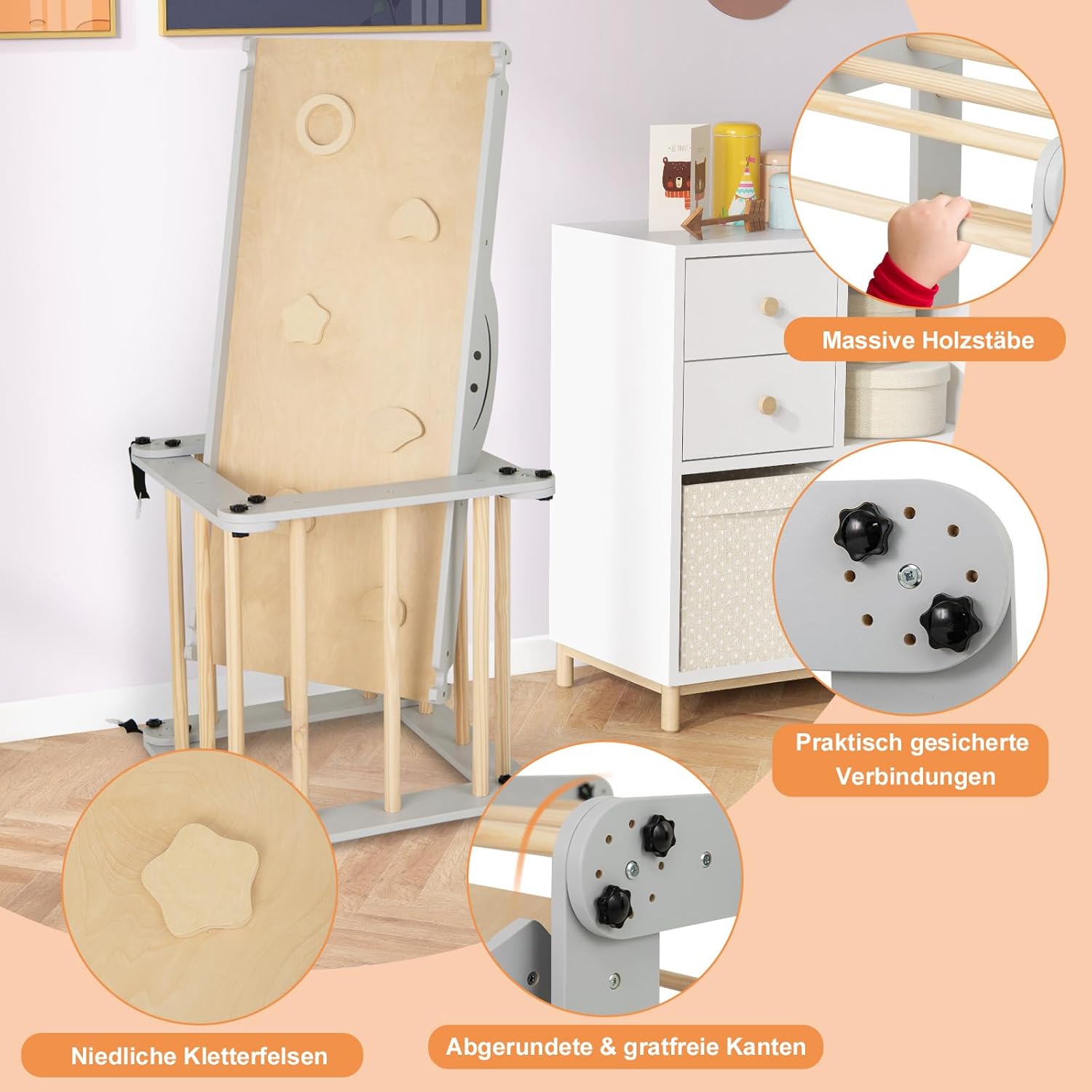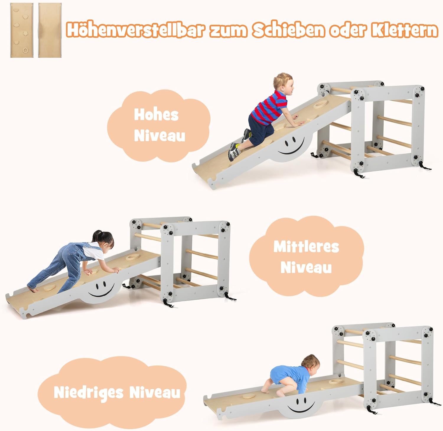 Set di impalcature 5 in 1: la nostra struttura da arrampicata multifunzionale dispone di uno scalatore e di una rampa a doppia faccia. Può servire come rampa antiscivolo, rampa da arrampicata, scala da arrampicata, altalena e tunnel per gattonare. La rampa funziona bene come altalena. Lo scalatore può essere convertito da una forma quadrata in una forma affusolata e offre ai tuoi bambini un divertimento fai da te. Rampa regolabile in altezza: la rampa a doppia faccia è progettata con altezza regolabile per lo scivolamento o l'arrampicata (livello basso, livello medio o alto livello). Così si adatta a bambini di età diverse. Un set da arrampicata come una delle basi degli insegnamenti Montessori aiuta a sviluppare l'indipendenza dei bambini. Design pieghevole per la conservazione: grazie ai dispositivi pieghevoli, è possibile piegare facilmente l'intero set da arrampicata in una forma sottile. Quindi puoi tenerlo in ogni angolo per risparmiare più spazio di attività. Inoltre, la struttura semplice consente di terminare rapidamente il montaggio. Materiali sicuri e affidabili: tutti i materiali sono privi di BPA e sicuri per un uso affidabile. Le barre in legno massiccio garantiscono un'elevata resistenza e durata. Il set da arrampicata supporta fino a 60 kg. I bordi arrotondati e senza sbavature evitano graffi sulla pelle dei bambini. 【Scalatore versatile per i vostri bambini】 Quando i bambini sono più piccoli, questo set di scalatori consente loro di praticare l'arrampicata per sviluppare la forza ossea e muscolare. Quando il tuo piccolo invecchia, può usarlo per costruire immaginariamente forme diverse o creare le tue fortezze. Ed è ideale per la cameretta dei bambini, il soggiorno, la sala giochi, l'asilo, l'asilo, ecc.
