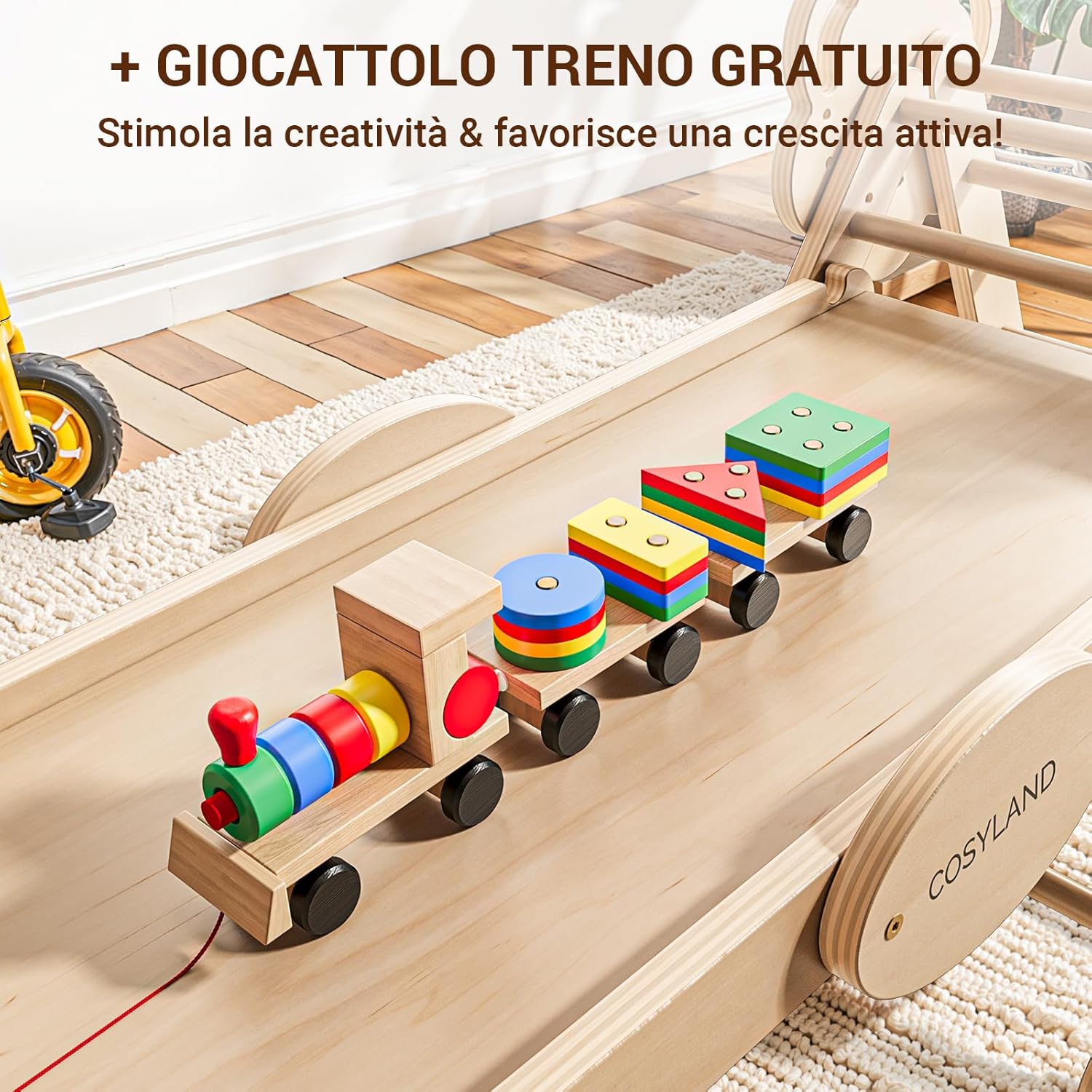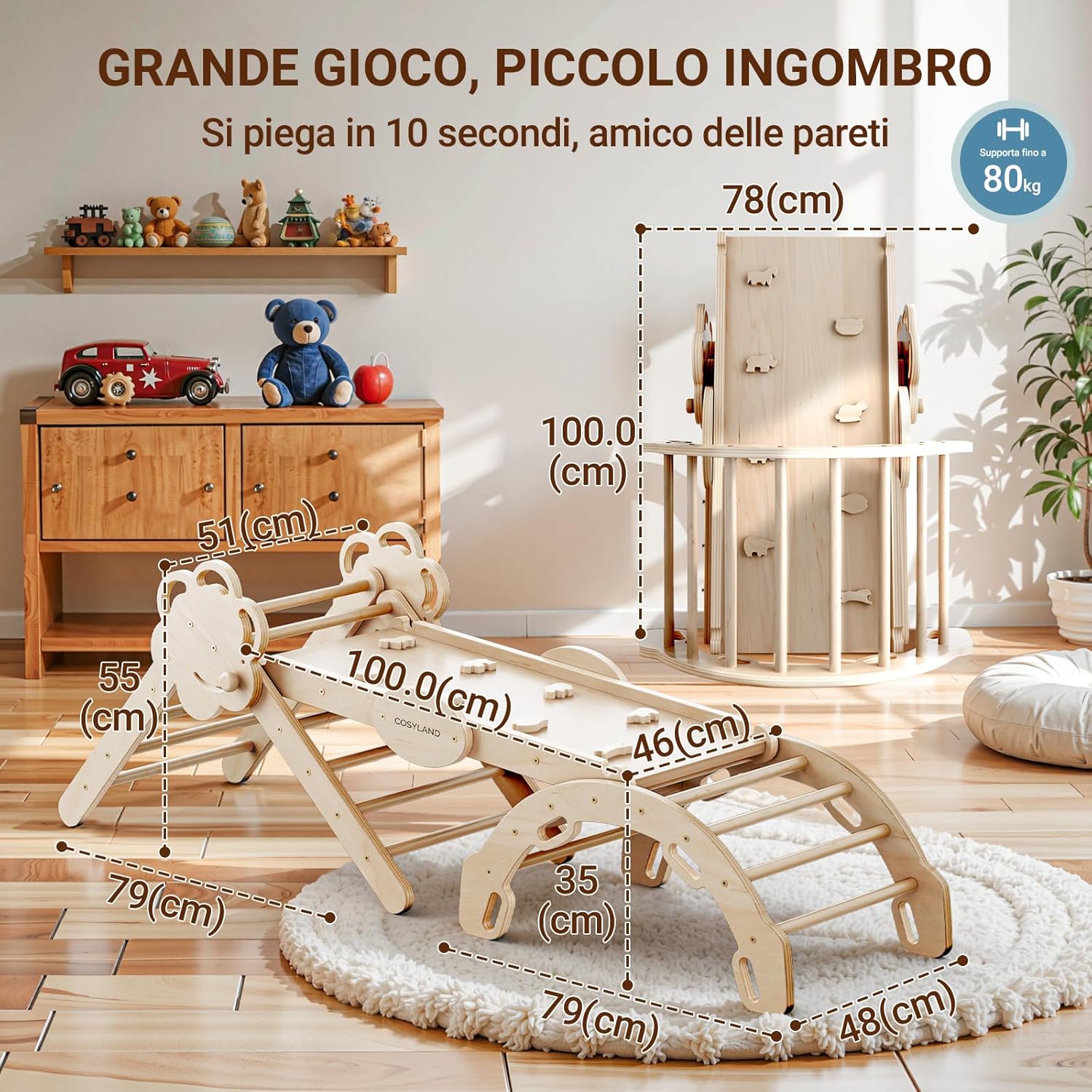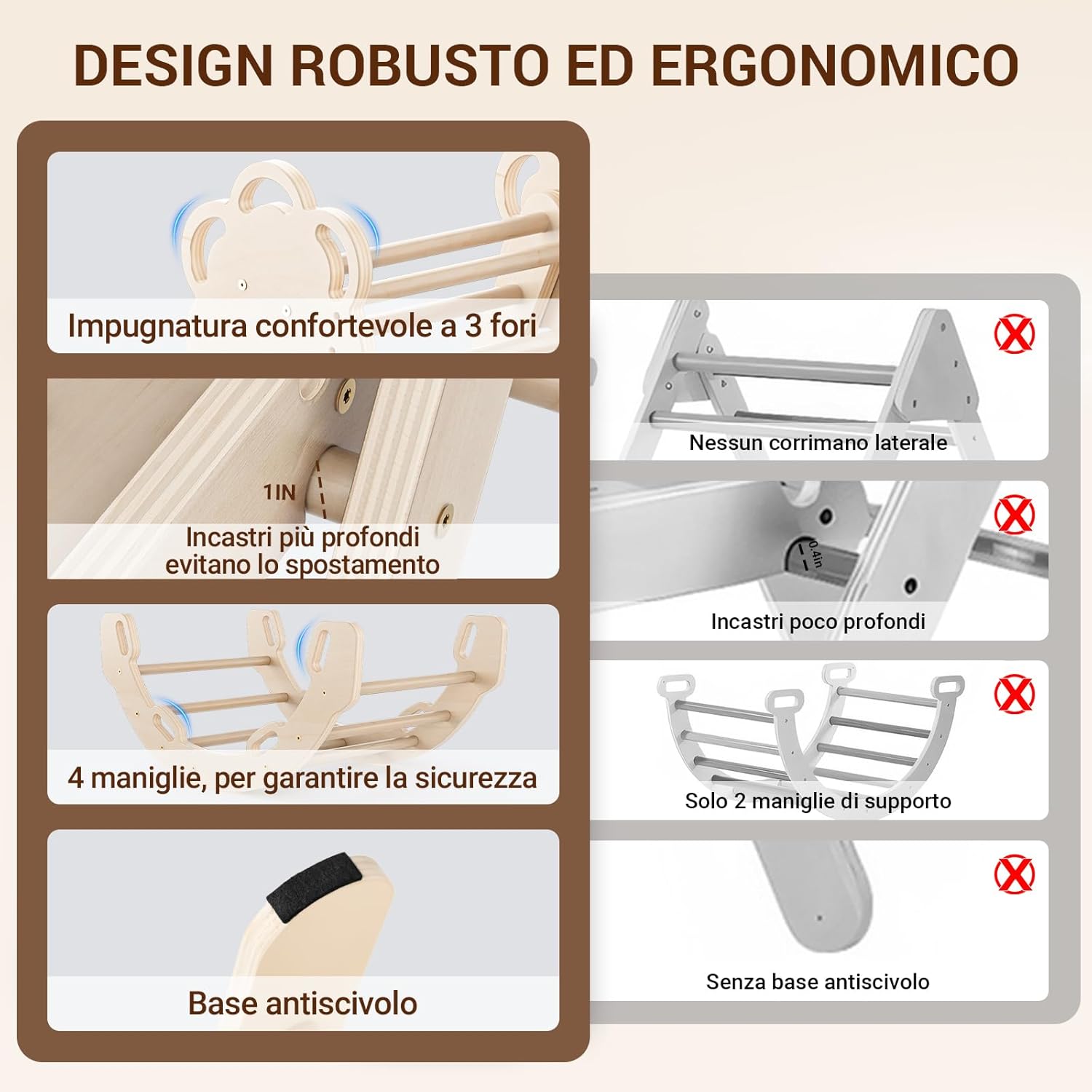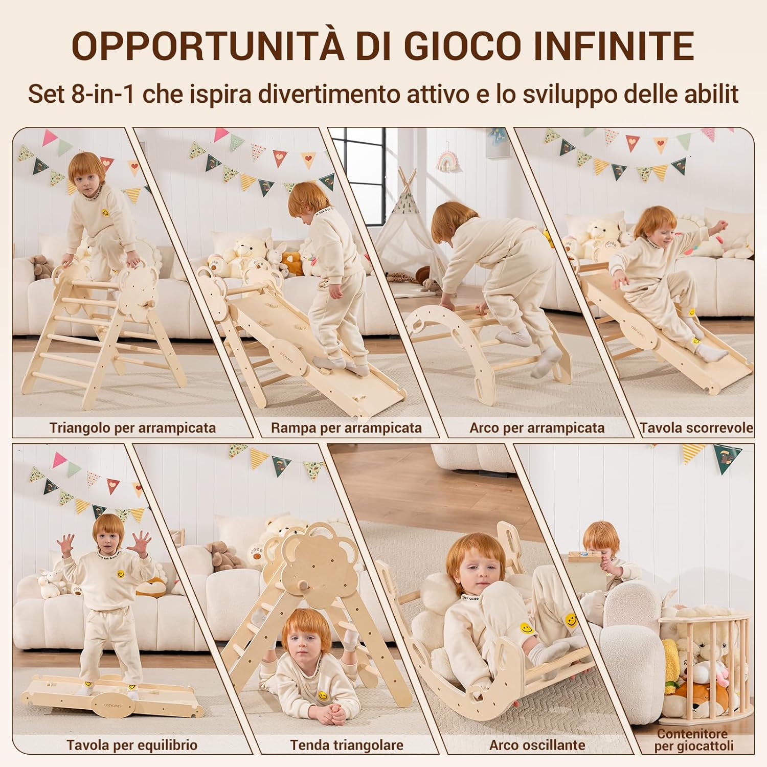 Set 3-in-1 che cresce con il bambino: Progettato per accompagnare i piccoli dai 18 mesi ai 6 anni, questo triangolo pikler regolabile in tre altezze offre supporto nei primi passi, stimola l’equilibrio e rafforza la fiducia. Un vero alleato per lo sviluppo motorio nella arrampicata per bambini Giocattolo educativo in omaggio: All’interno di questo set arrampicata montessori troverai anche un esclusivo trenino puzzle in una confezione colorata, perfetto per rendere il gioco ancora più coinvolgente e stimolare l’apprendimento precoce durante le attività di arrampicata bambini Giocattolo educativo in omaggio: All’interno di questo set arrampicata montessori troverai anche un esclusivo trenino puzzle in una confezione colorata, perfetto per rendere il gioco ancora più coinvolgente e stimolare l’apprendimento precoce durante le attività di arrampicata bambini Set da arrampicata 8 in 1 per infinite avventure: Composto da otto moduli—triangolo di pikler, tavola equilibrio, rampa di arrampicata, tenda triangolare, arco da arrampicata, arco dondolo, scivolo e contenitore giochi—questo set arrampicata montessori è pensato per stimolare fantasia, movimento e gioco attivo Sicurezza testata secondo lo standard EN-71 & design anti-ribaltamento: Dotato di arco di sicurezza innovativo e barre certificate, il nostro triangolo pikler garantisce un'esperienza di gioco sicura e stabile. La struttura è perfetta per l’uso quotidiano in ambienti dedicati all’arrampicata per bambini Materiali resistenti & design salvaspazio pieghevole: Realizzato in legno di faggio massiccio levigato a mano, questo robusto triangolo di pikler supporta fino a 80 kg. Si piega in 10 secondi e si adatta a qualsiasi stanza, offrendo grandi possibilità di gioco anche in spazi ridotti—ideale per la moderna arrampicata bambini