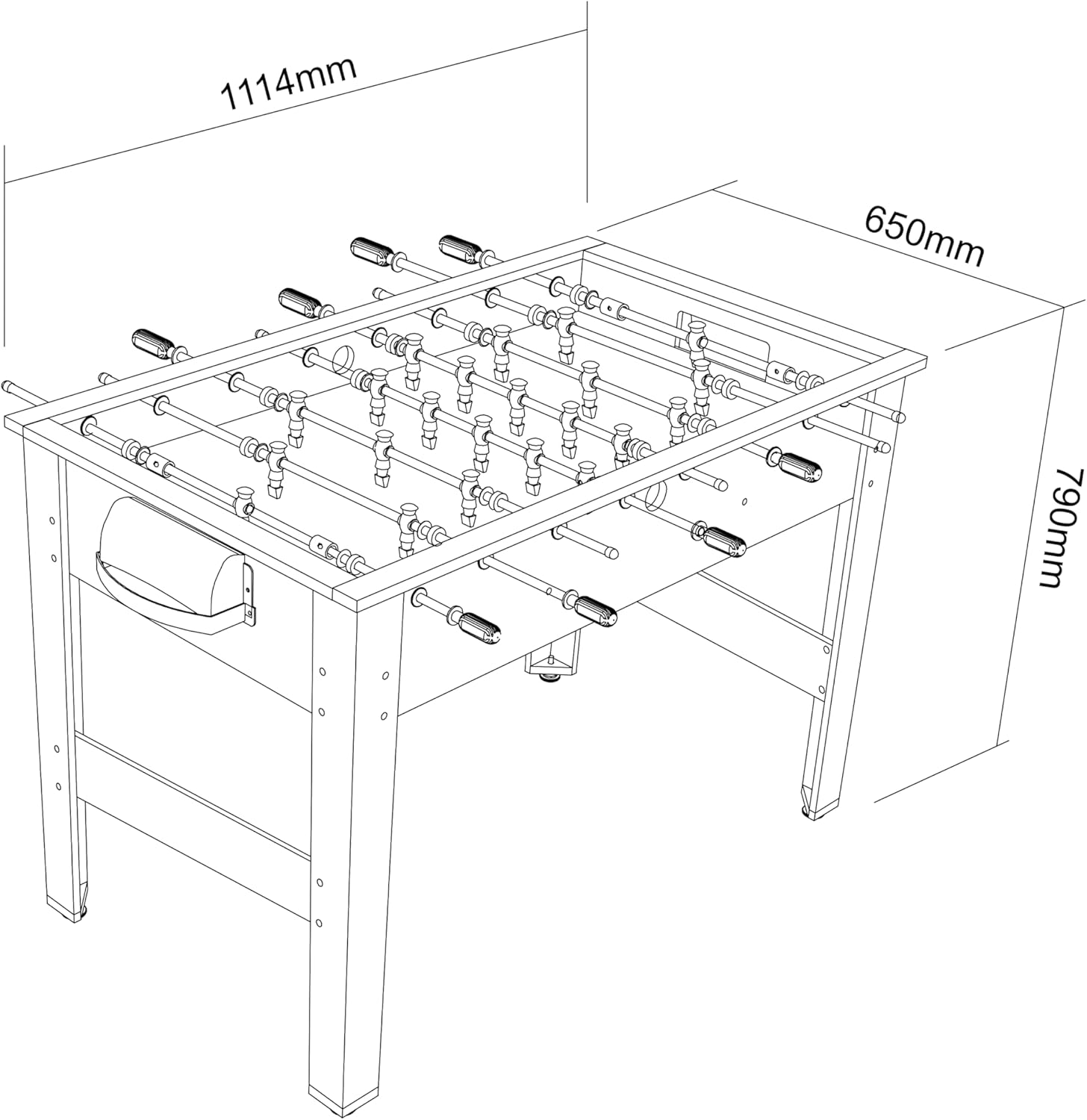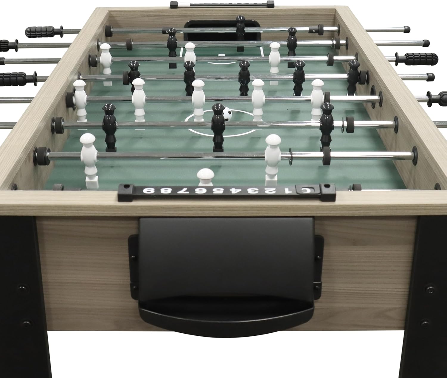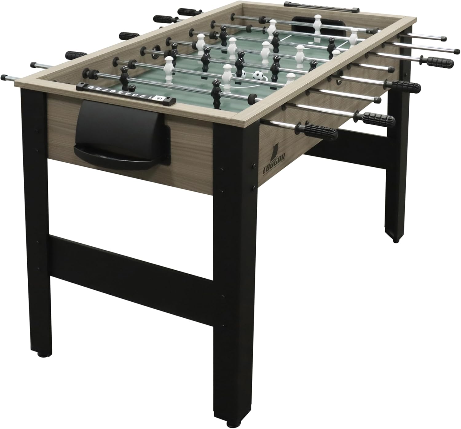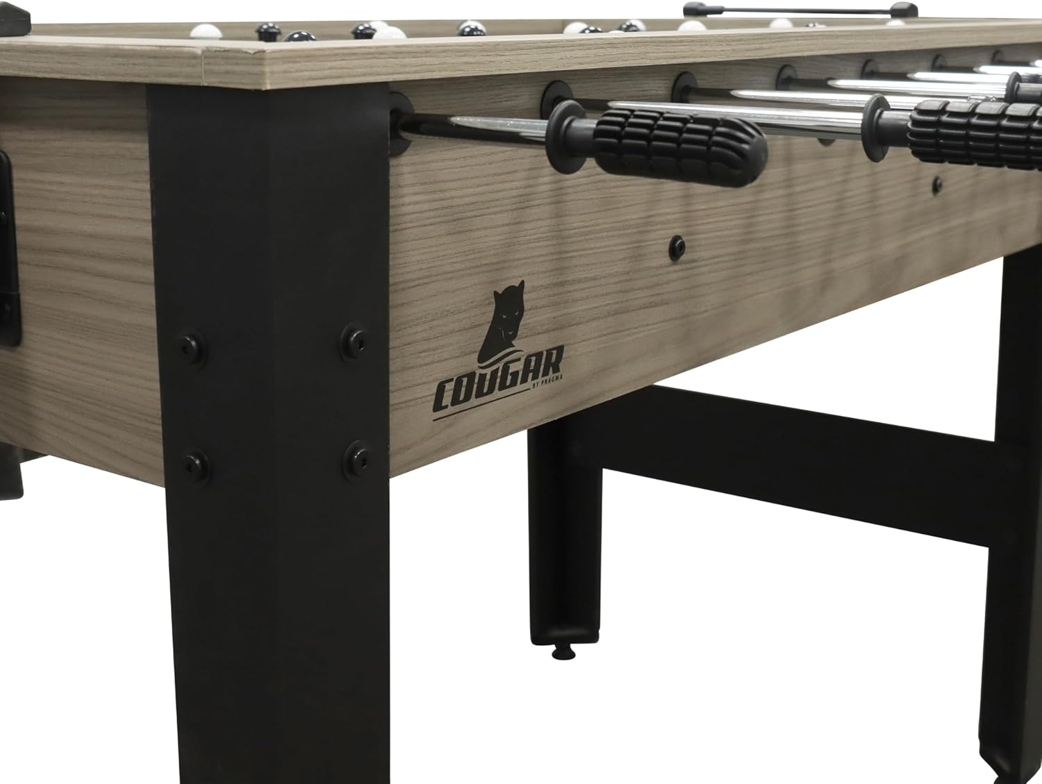 UN'ESPERIENZA DI GIOCO PROFESSIONALE A CASA: il Cougar Spin Kick consente di organizzare tornei di calcio intensi direttamente nel proprio salotto. Il suo elegante design in rovere/nero attira l'attenzione di tutti. Le squadre si affrontano in una classica configurazione bianco-nera su un campo in PVC verde dello spessore di 4,5 mm. Gli angoli inclinati impediscono al pallone di fermarsi. STRUTTURA STABILE PER PARTITE INTENSE: il telaio robusto con piedini neri regolabili garantisce una stabilità ottimale. L'ampio campo di gioco consente un gameplay dinamico per 2-4 giocatori. Il sistema di paracolpi protegge dagli urti sui bordi del tavolo. I pratici raccoglitori di palline dietro le due porte e i contatori di punti integrati garantiscono partite eque. I piedini regolabili consentono di ottenere una superficie di gioco perfettamente orizzontale. PRONTO ALL'USO E COMPLETO: viene fornito completo di tutti gli accessori per iniziare a giocare immediatamente. Pronto all'uso in pochi minuti senza complicate operazioni di montaggio. Include 2 palline (Ø 31 mm) per un'azione immediata. Ideale per partite amichevoli, giochi in famiglia o piccoli tornei in casa. I materiali resistenti garantiscono anni di divertimento. Garanzia di 2 anni per un divertimento senza pensieri. DIMENSIONI COMPATTE PERFETTAMENTE ADATTE: le dimensioni del tavolo da gioco 112 x 65 x 79,5 cm si adattano ai salotti o alle sale giochi. Il campo da gioco di 105,5 x 59 cm offre una superficie ottimale per le manovre tattiche. Il peso di 22,5 kg assicura un'eccellente stabilità durante le partite intense senza essere troppo pesante da spostare. I piedini regolabili consentono di adattarsi ai pavimenti irregolari. Equilibrio perfetto tra compattezza e comfort di gioco professionale. COUGAR: Porta l'emozione di una partita a calcio balilla, air hockey o biliardo nelle tue quattro mura con Cougar! Con i tavoli da gioco Cougar, ore di divertimento sono garantite per grandi e piccini. I nostri prodotti sono realizzati con materiali di alta qualità e sono adatti ai bambini (e agli adulti) a partire dai 5 anni.