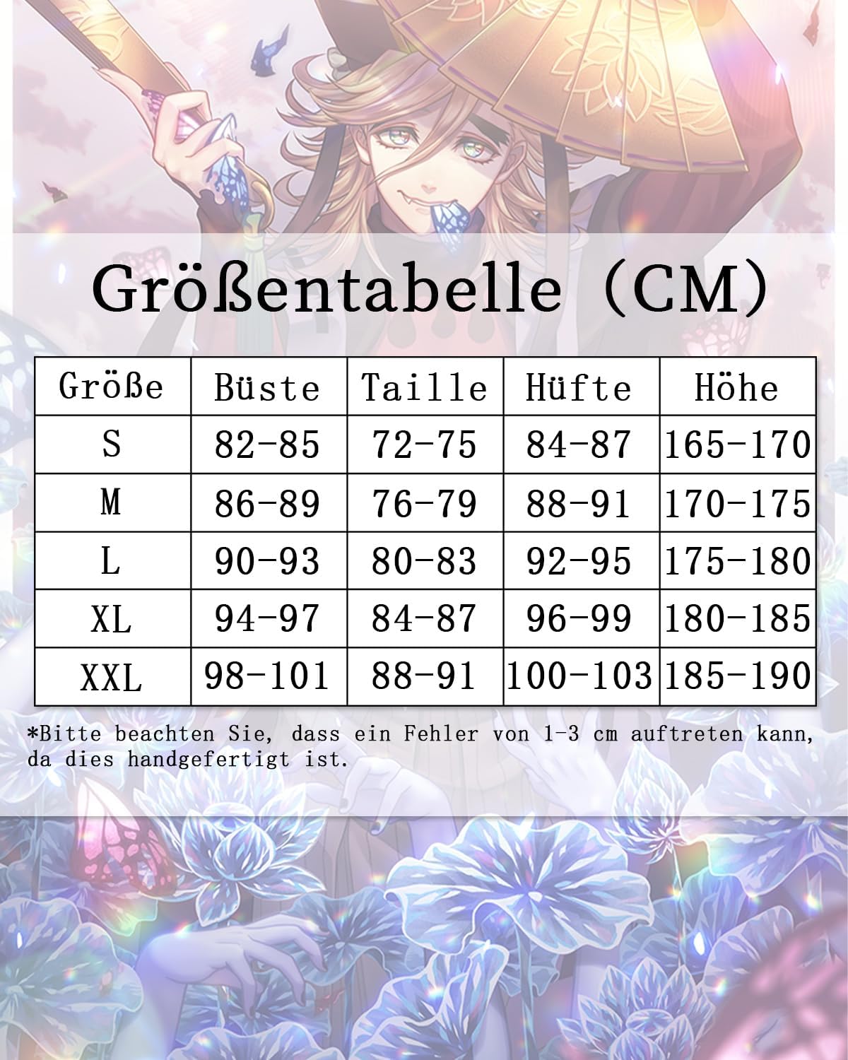 The sizing said the bust would be 50.0inches, I get a smal manufacturing bug or something like 1-2inches smaller. However my chest is around 45inches and it was way to small for me. The waist situation was fine but the chest bust size is completely incorrect. Also the socks are a mess they are incorrectly sewn and i cannot keep them on my legs considering its a piece is fabric. The haori Mitsuri wears is sewn weirdly aswell, Theres barely a hole in the haori making it impossible to get my arms threw. Do better. Not to mention dealing with shipping was horrible, I didn’t get a single update and it showed up randomly one day even though it said there would be tracking. Everything is very wrinkled and the cosplay is horrible overall. 2/5 stars because the shirt is nice and would’ve worked if it had fit.