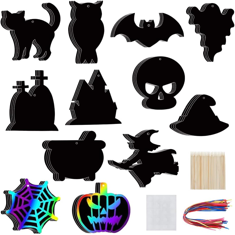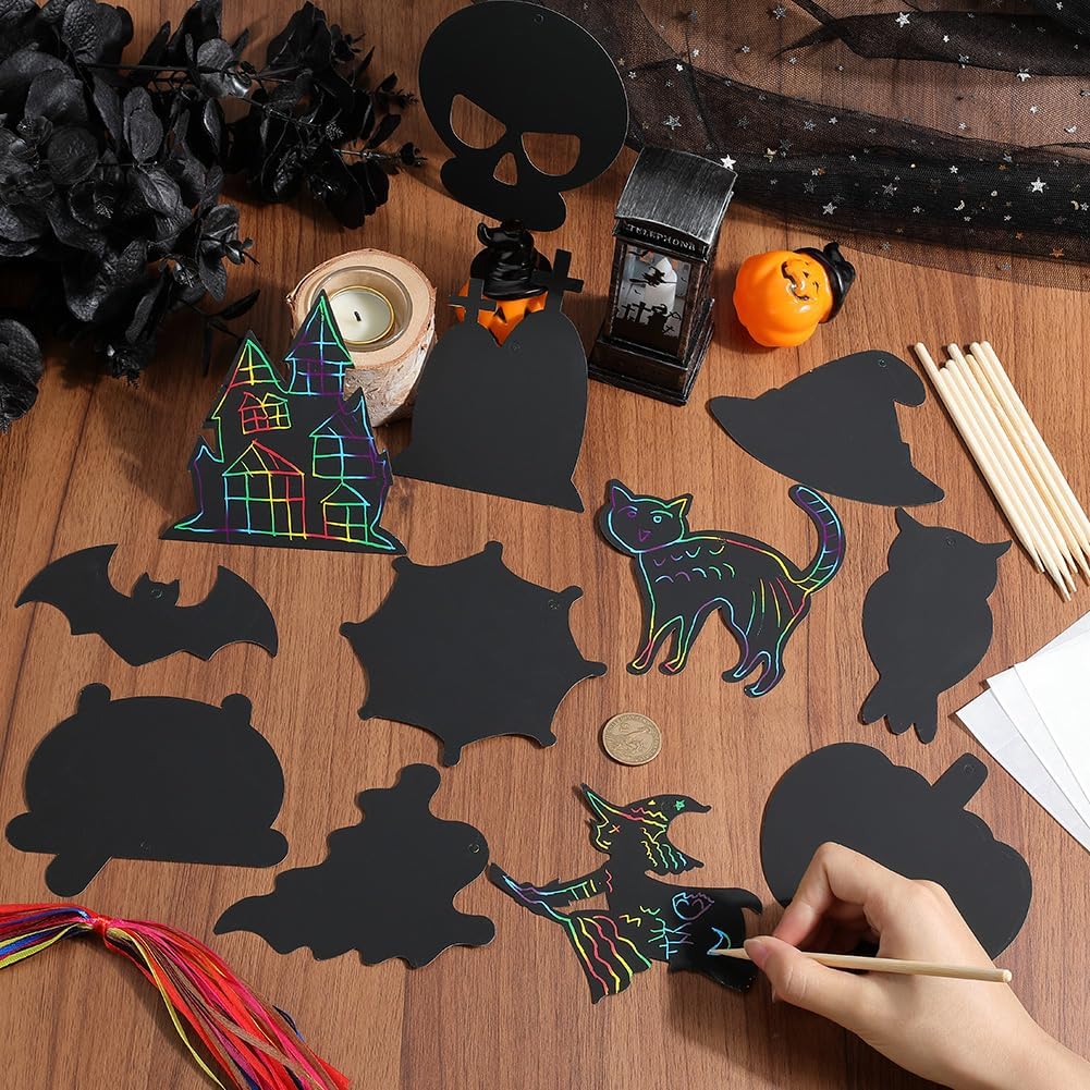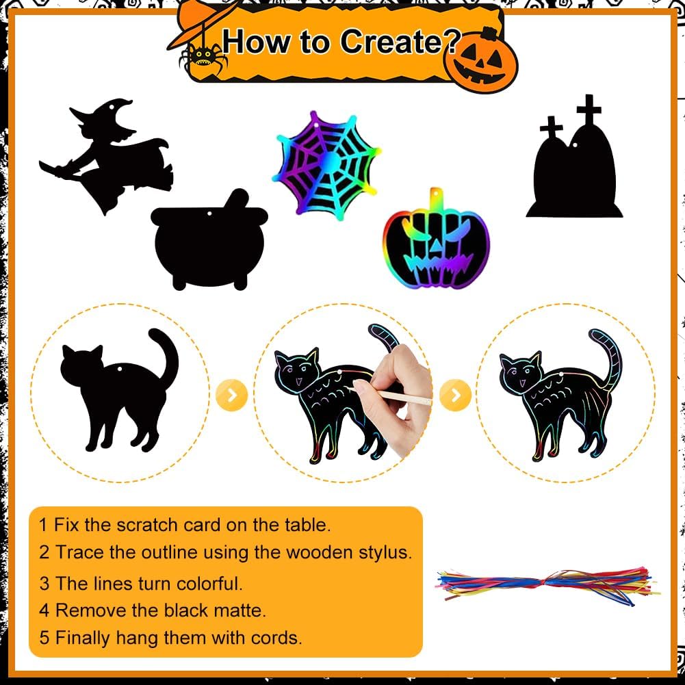 Set di carte da grattare di Halloween:il pacchetto include 48 pezzo di carta da grattare a tema marino (in 12 stili, 4 di ciascuno), 24 pz bastoncini di legno 3 fogli di punti adesivi e 48 pz elastici colorati, ricco di quantità e stile, goditi il divertimento. Design unico:la carta artistica magica arcobaleno di Halloween è la scelta migliore per i festival, l'arcobaleno di colori apparirà quando gratti, con il cappello da strega, teschio, fantasma, ragnatela, zucca e così via, questi ornamenti da appendere ai regali aggiungeranno un po' di allegria natalizia fatta in casa. Materiale sicuro:sotto la carta da grattare arcobaleno per la festa di Halloween è realizzata in cartoncino con rivestimento nero sulla superficie, i tiragraffi in legno sono realizzati con materiali affidabili, arte antigraffio robusta e sicura, può disegnare in modo sicuro un'incredibile opera d'arte creativa su carta da grattare. Facile da usare:le carte gratta e vinci sono molto facili da usare, basta grattare la superficie nera con uno stilo di legno per rivelare lo strato di base arcobaleno, fai da te come vuoi, nastri colorati sono inclusi nella confezione, i ritagli modellati hanno piccoli fori nella parte superiore, passare i nastri attraverso i fori per appendere facilmente le decorazioni. Immaginazione illimitata:con diversi modelli di Halloween, vivace e carino, facile attirare la tua attenzione, creare uno spazio creativo e fantasioso che favorisca la stimolazione della loro creatività, ottimo regalo per pasqua ringraziamento natale halloween matrimonio inverno.
