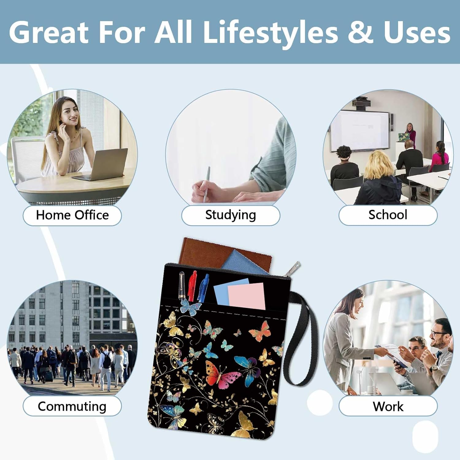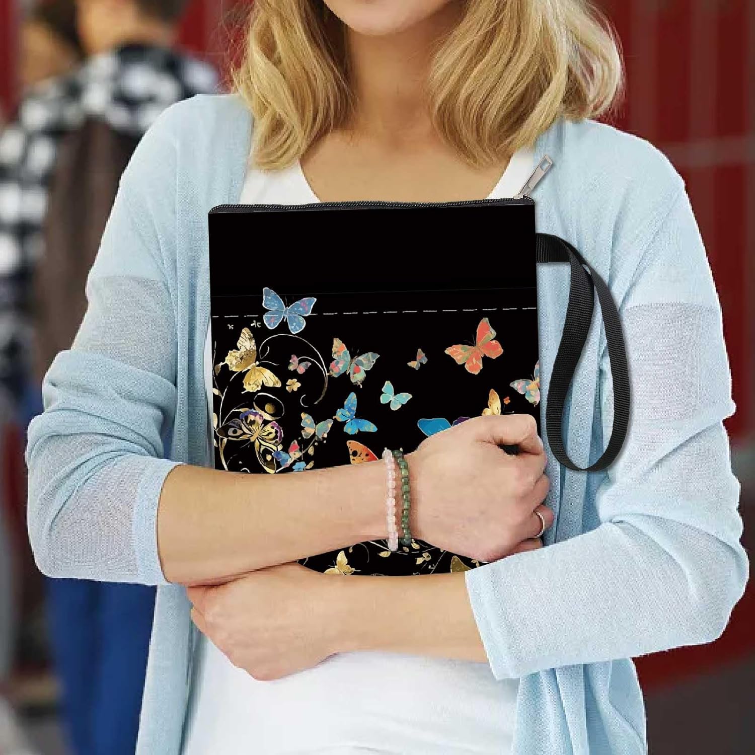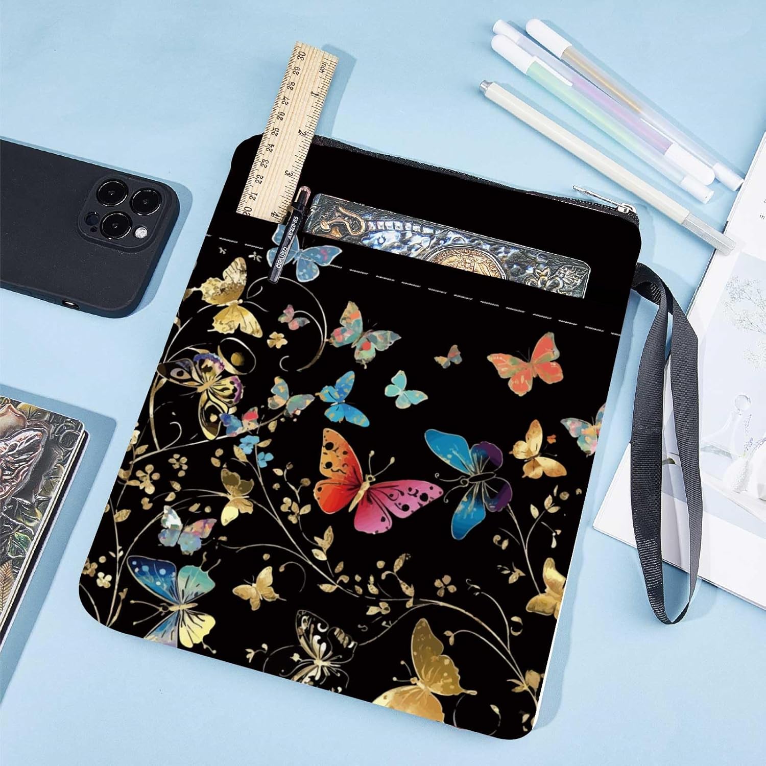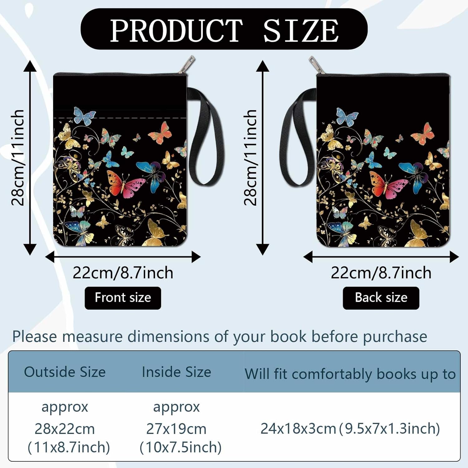 MANICA DEL LIBRO A FARFALLA:la copertina del libro ha un modello elegante e innovativo, che protegge il tuo libro dalla polvere o dalle pagine strappate e piegate, ed è anche un regalo perfetto per gli amanti dei libri. DIMENSIONE:copertina del libro larga circa 8.66 pollice (22cm )., 11.02 pollice (28cm ) di lunghezza. Si adatta alla maggior parte dei libri autopubblicati, tascabili standard, tascabili di massa, e copertine rigide regolari. Assicurati di misurare il tuo articolo prima dell'acquisto per assicurarti che funzioni per te. TESSUTO LAVABILE:Realizzato in tessuto lavabile, la fodera nera è resistente allo sporco e presenta una chiusura con cerniera liscia di alta qualità per una maggiore protezione. Sottile e leggero, non ingombra il tuo libro, può facilmente scivolare nella tua valigetta, zaino o altra borsa. TASCA EXTRA SULLA MANICA:questa copertina del libro non può contenere solo libri, la tasca extra sulla manica può contenere anche penne, occhiali, segnalibri, bloc notes, cuffie e altri accessori, pratico e bello in uno. AMPIO UTILIZZO:queste custodie per libri possono essere utilizzate per proteggere i libri, libri di testo o quaderni ed è adatto agli studenti, insegnanti, scrittori, studiosi, librerie o chiunque ami i libri o voglia distinguerli facilmente.
