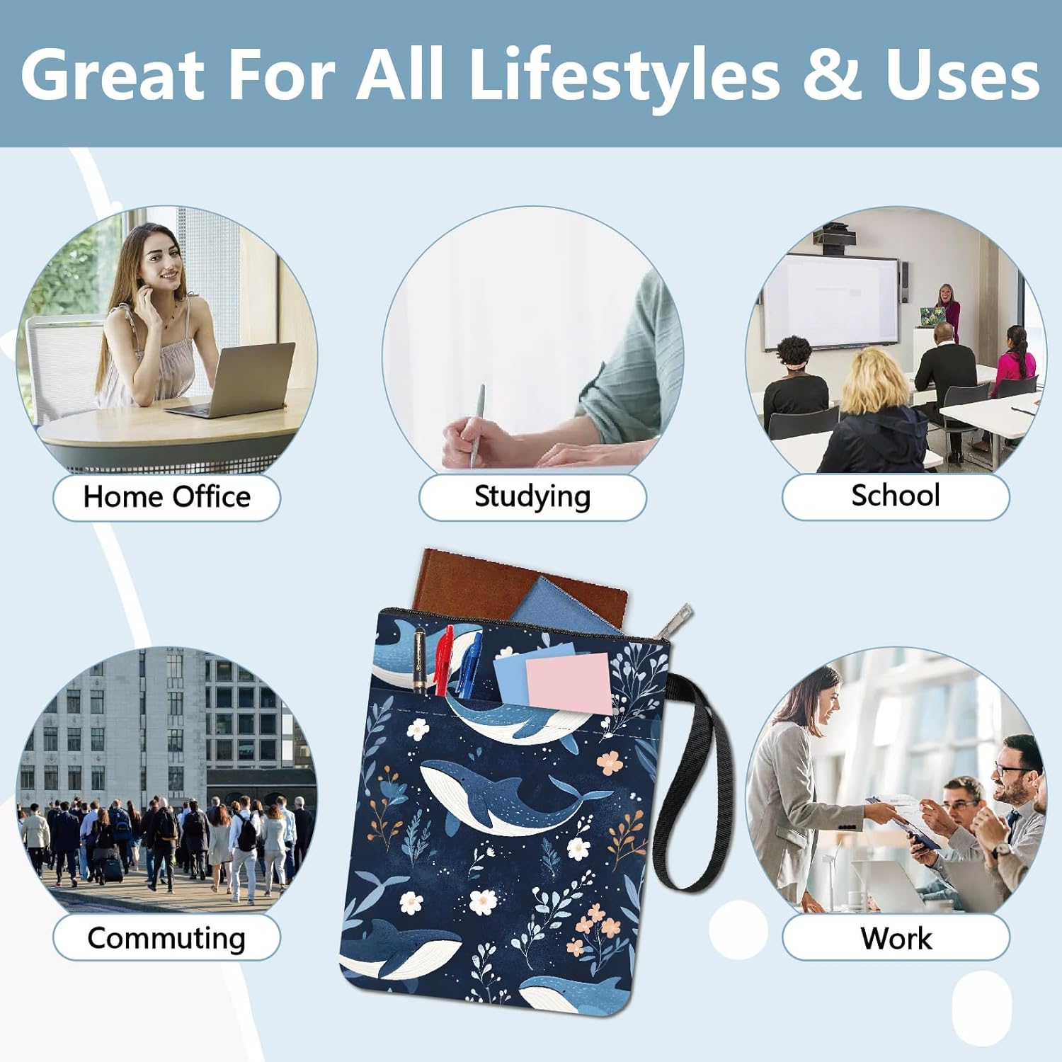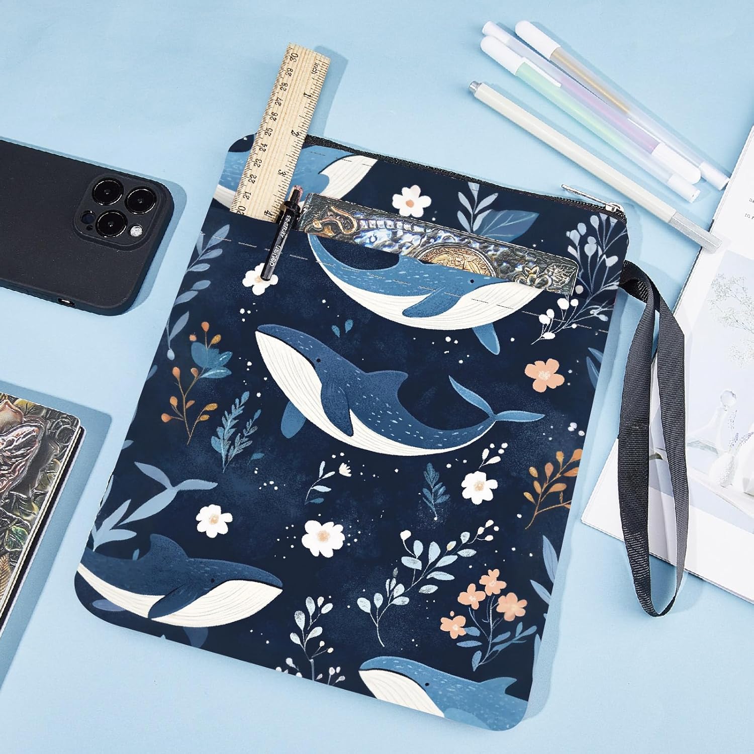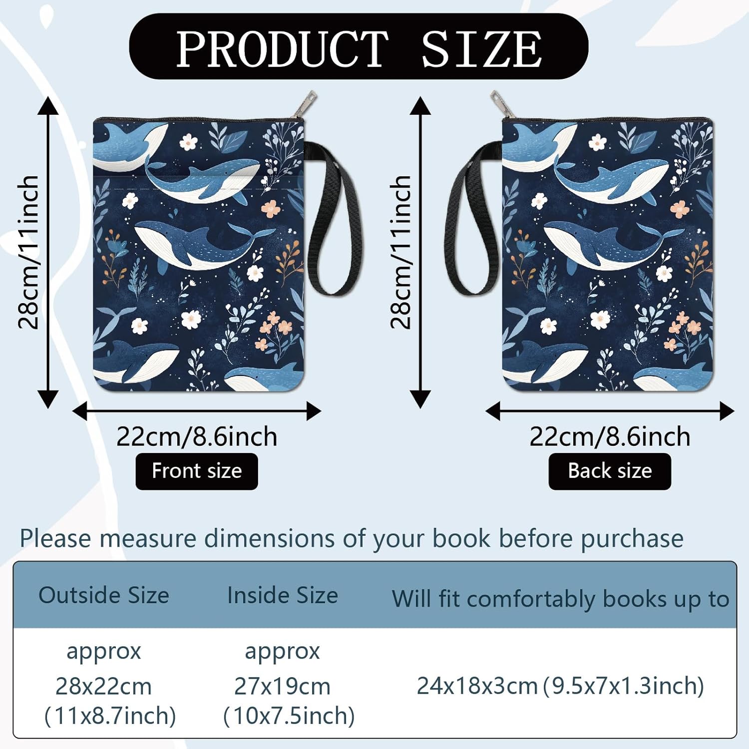 MANICA DEL LIBRO DELLA BALENA:la copertina del libro ha un modello elegante e innovativo, che protegge il tuo libro dalla polvere o dalle pagine strappate e piegate, ed è anche un regalo perfetto per gli amanti dei libri. DIMENSIONE:copertina del libro larga circa 8.66 pollice (22cm )., 11.02 pollice (28cm ) di lunghezza. Si adatta alla maggior parte dei libri autopubblicati, tascabili standard, tascabili di massa, e copertine rigide regolari. Assicurati di misurare il tuo articolo prima dell'acquisto per assicurarti che funzioni per te. TESSUTO LAVABILE:Realizzato in tessuto lavabile, la fodera nera è resistente allo sporco e presenta una chiusura con cerniera liscia di alta qualità per una maggiore protezione. Sottile e leggero, non ingombra il tuo libro, può facilmente scivolare nella tua valigetta, zaino o altra borsa. TASCA EXTRA SULLA MANICA:questa copertina del libro non può contenere solo libri, la tasca extra sulla manica può contenere anche penne, occhiali, segnalibri, bloc notes, cuffie e altri accessori, pratico e bello in uno. AMPIO UTILIZZO:queste custodie per libri possono essere utilizzate per proteggere i libri, libri di testo o quaderni ed è adatto agli studenti, insegnanti, scrittori, studiosi, librerie o chiunque ami i libri o voglia distinguerli facilmente.