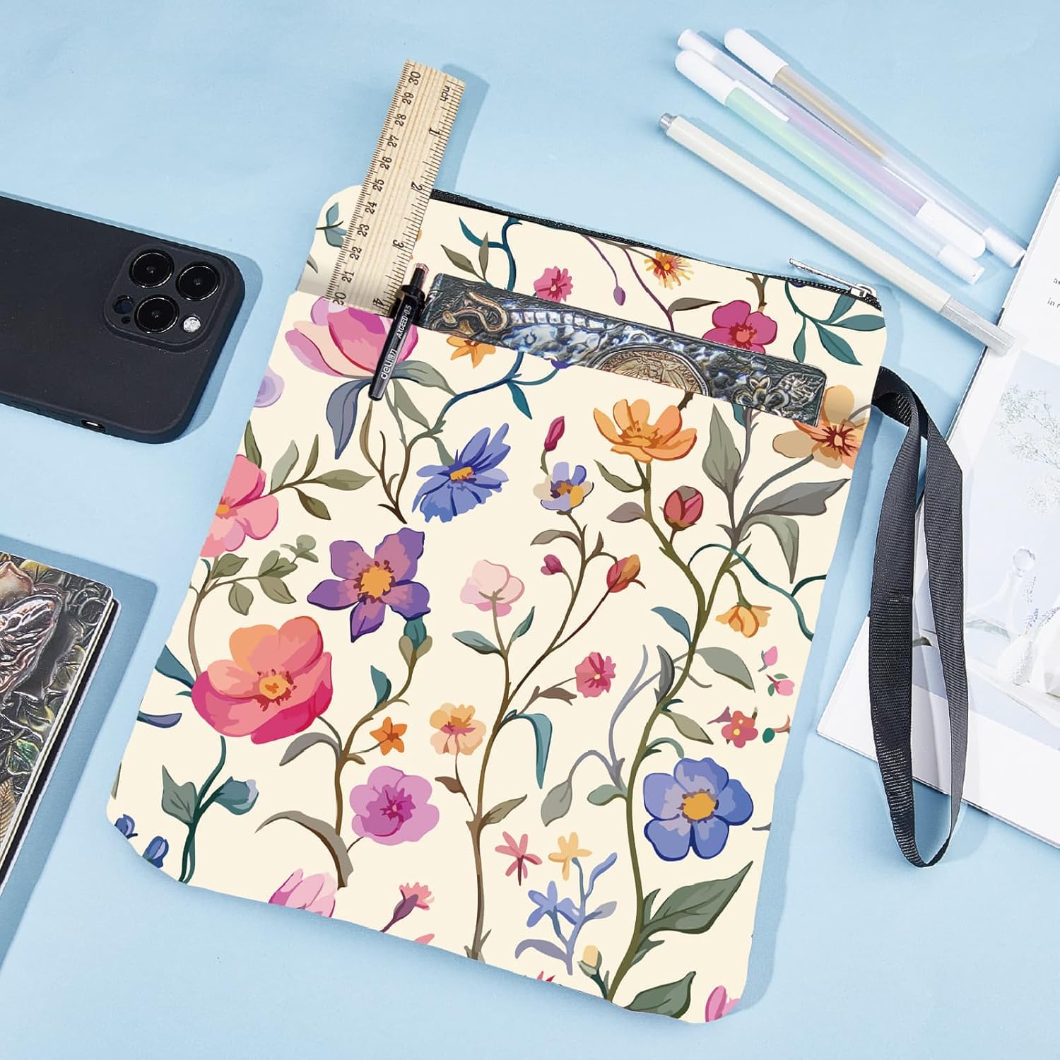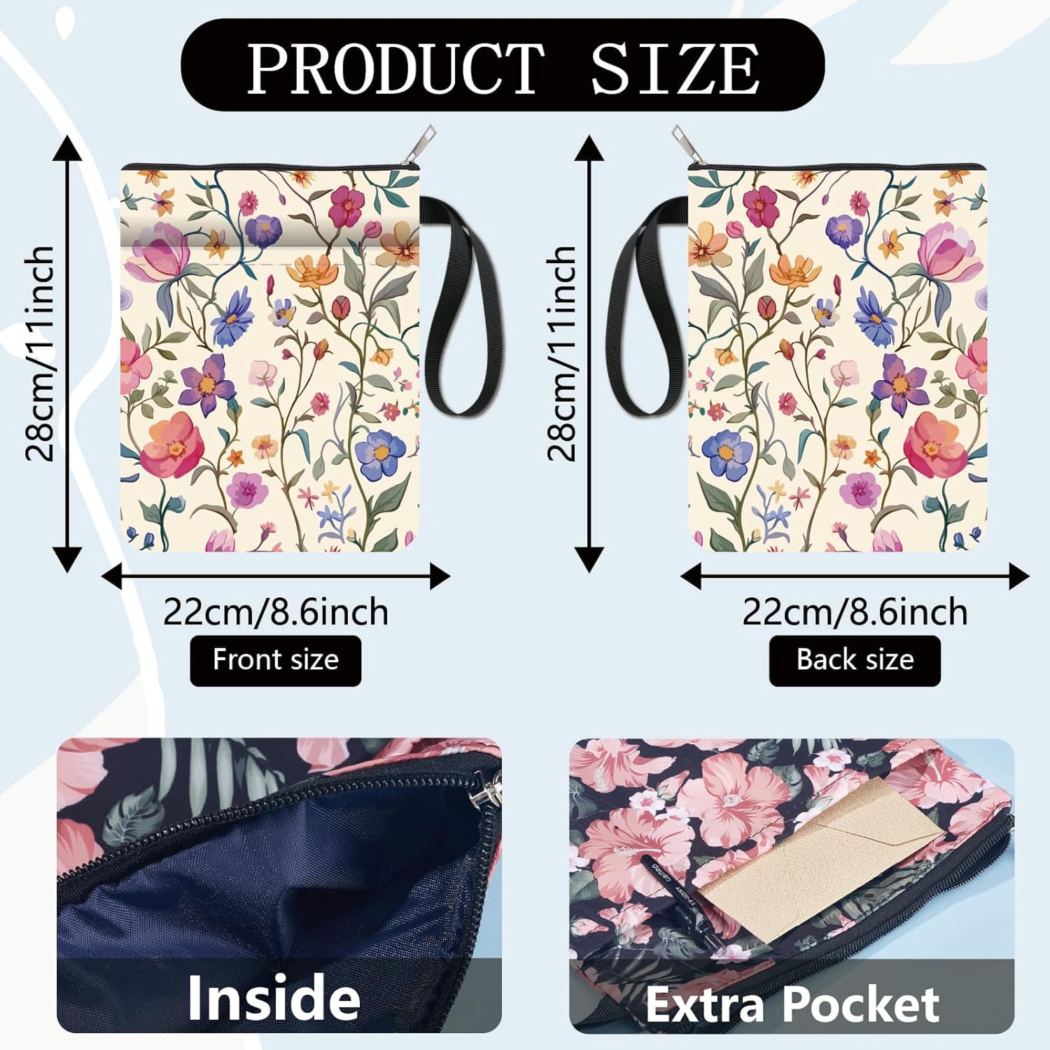 MANICA DEL LIBRO A FIORI:la copertina del libro ha un modello elegante e innovativo, che protegge il tuo libro dalla polvere o dalle pagine strappate e piegate, ed è anche un regalo perfetto per gli amanti dei libri. DIMENSIONE:copertina del libro larga circa 8.66 pollice (22cm )., 11.02 pollice (28cm ) di lunghezza. Si adatta alla maggior parte dei libri autopubblicati, tascabili standard, tascabili di massa, e copertine rigide regolari. Assicurati di misurare il tuo articolo prima dell'acquisto per assicurarti che funzioni per te. TESSUTO LAVABILE:Realizzato in tessuto lavabile, la fodera nera è resistente allo sporco e presenta una chiusura con cerniera liscia di alta qualità per una maggiore protezione. Sottile e leggero, non ingombra il tuo libro, può facilmente scivolare nella tua valigetta, zaino o altra borsa. TASCA EXTRA SULLA MANICA:questa copertina del libro non può contenere solo libri, la tasca extra sulla manica può contenere anche penne, occhiali, segnalibri, bloc notes, cuffie e altri accessori, pratico e bello in uno. AMPIO UTILIZZO:queste custodie per libri possono essere utilizzate per proteggere i libri, libri di testo o quaderni ed è adatto agli studenti, insegnanti, scrittori, studiosi, librerie o chiunque ami i libri o voglia distinguerli facilmente.