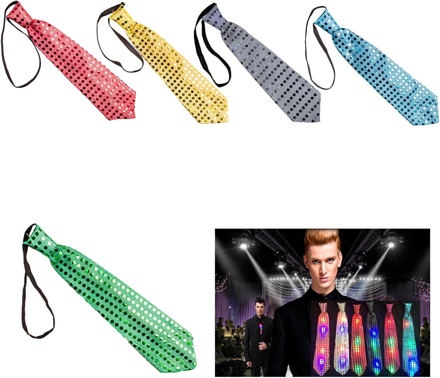 Cravatta con paillettes brillanti a LED lampeggianti, pre-legata, per feste di Natale, costume di Halloween Caratteristiche: e La nostra cravatta a LED è un accessorio indispensabile per coloro che vogliono fare una dichiarazione. I suoi stili unici e alla moda attireranno l'attenzione di tutti. Realizzato con materiali, la nostra cravatta a LED garantisce durata e comfort. È costruito per durare, fornendo un uso duraturo. Adatto per persone alla moda, la nostra cravatta a LED è per feste, discoteche e occasioni speciali. Che si tratti di una celebrazione, matrimonio o concerto, la nostra cravatta a LED aggiunge un tocco di unicità a qualsiasi evento. Preparati a mostrare il tuo personale con la nostra cravatta LED. È tempo di distinguersi dalla massa e lasciare un'impressione duratura! Specifiche tecniche: Tessuto di stoffa+componenti elettronici Dimensioni: ca. 32 x 8 cm. Colore opzionale: Re, Giallo, Blu, Verde, Bianco, Nero Alimentazione: batterie a bottone (incluse). La confezione include: 1 x Cravatta Nota: Transizione: 1 cm = 10 mm. Senza confezione al dettaglio. Considerare un margine di errore di 1-3 mm a causa della misurazione manuale. Assicurarsi che questo non sia un problema prima di effettuare l'ordine. A causa della differenza tra i diversi monitor, l'immagine potrebbe non riflettere esattamente il colore dell'articolo.