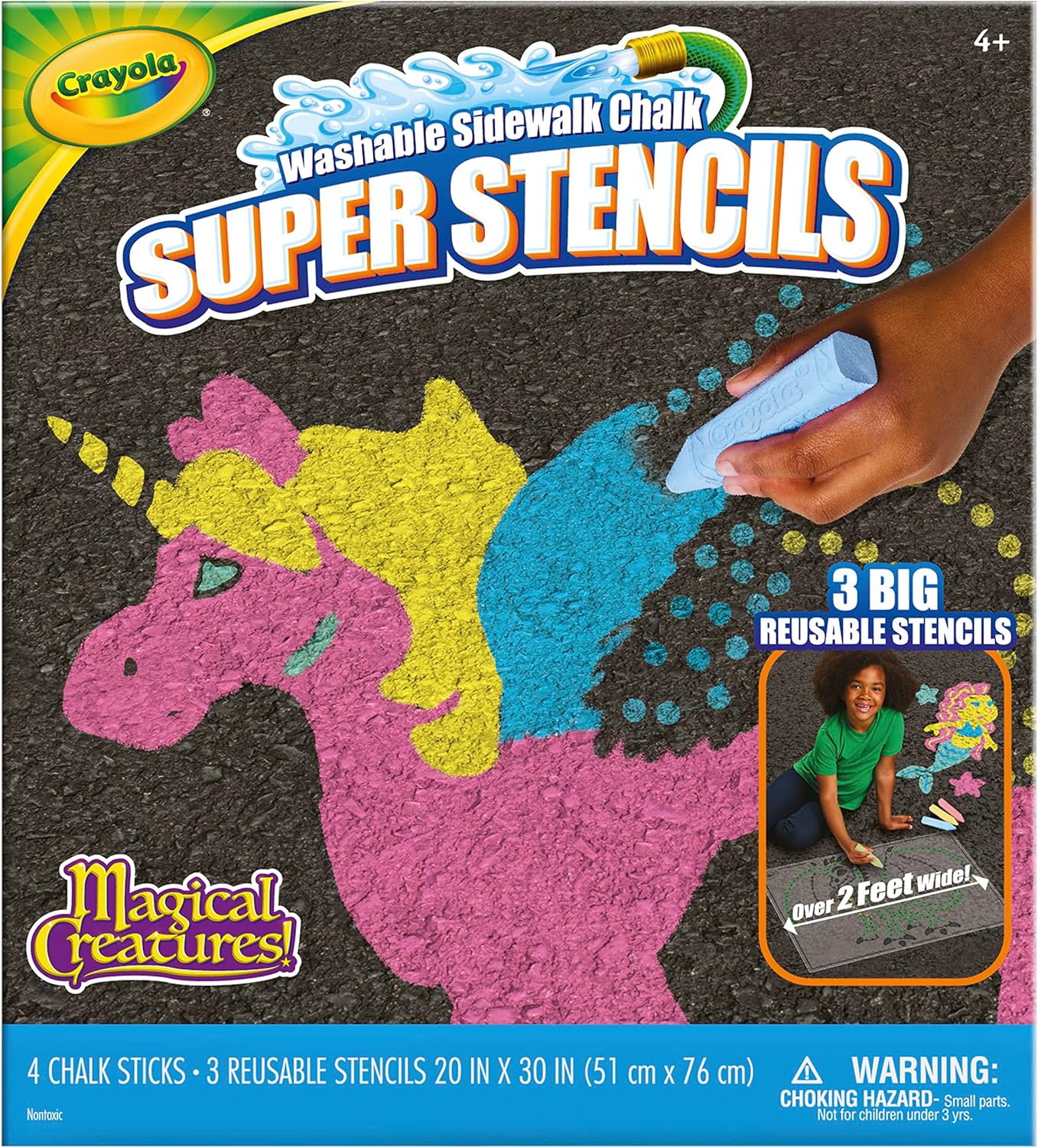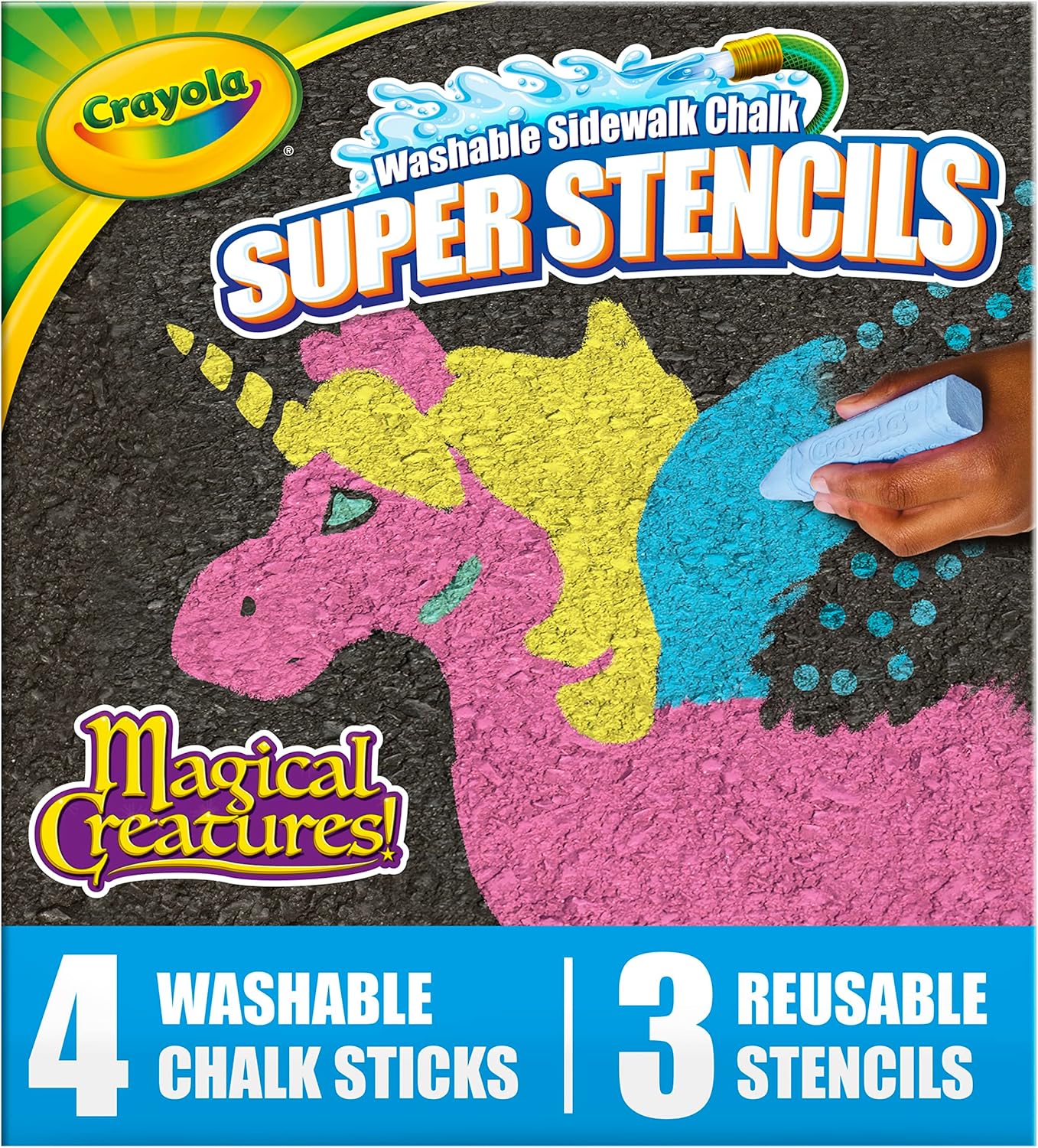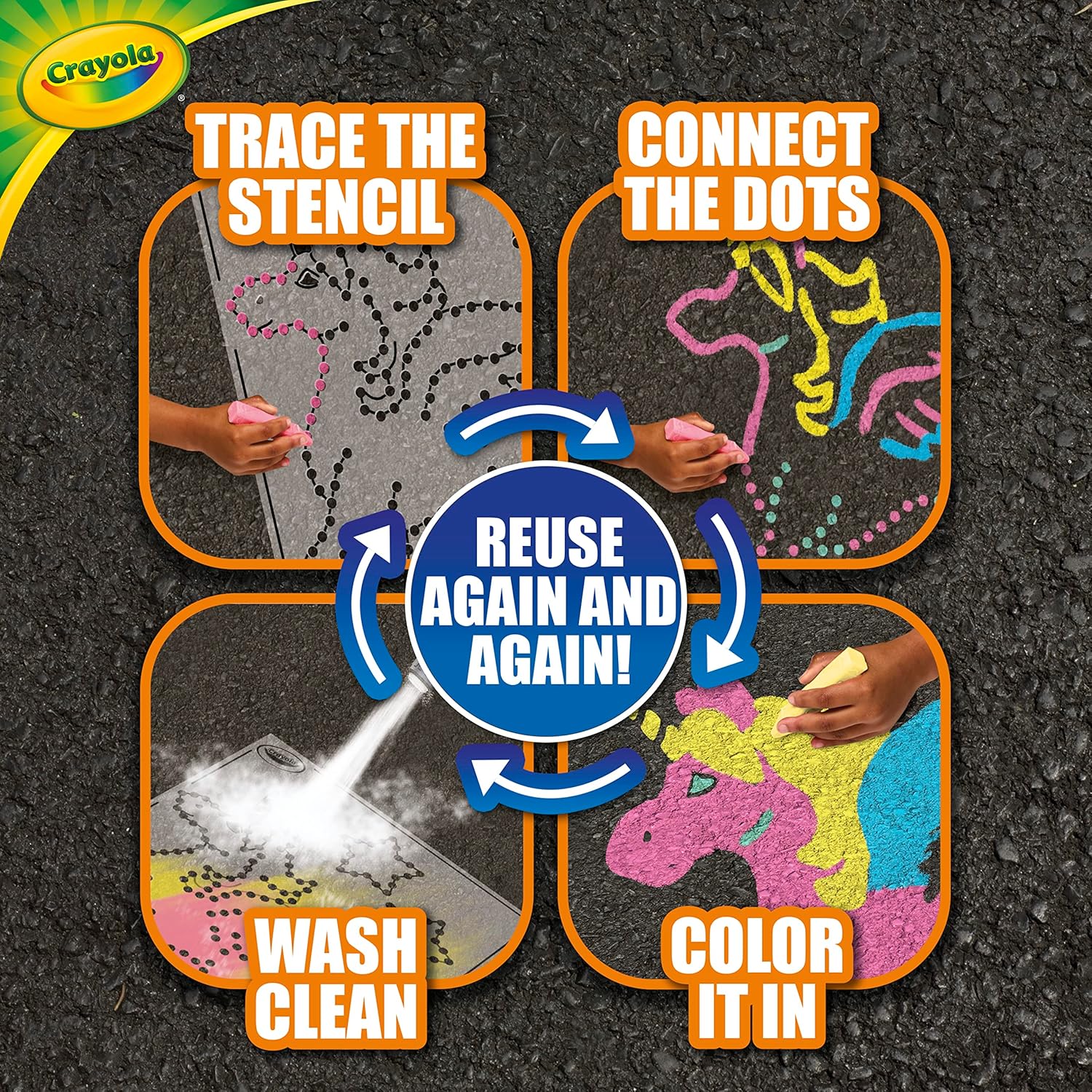 CRAYOLA Stencil per esterni: questo kit artistico per bambini include 3 grandi stencil (50,8 x 76,2 cm) con linee stampate per aiutare i bambini a rintracciare facilmente e gesso Crayola da 4 carati. Gli stencil magici presenti sono un unicorno, una sirena e un drago volante. Gesso STENCIL ART FACILE - Crea immagini perfette da colorare all'esterno utilizzando i resistenti stencil Crayola Sidewalk Chalk Super e Crayola lavabile Marciapiede gesso destinato all'uso ripetuto. I bambini possono collegare i punti per creare capolavori che risaltano davvero. Decora il tuo marciapiede con creature accattivanti: i grandi stencil di questo set presentano tutti un tema magico, aiutando i bambini a diventare più creativi con le loro creazioni di gesso sul marciapiede in un motivo facile da collegare ai punti. Gli stencoli lavabili e resistenti all'acqua rendono la pulizia un gioco da ragazzi: i bambini possono continuare a disegnare con stencil a gesso sul marciapiede che si lavano puliti in pochi secondi per una rapida conservazione. Il gesso lavabile del marciapiede può essere lavato via dai marciapiedi e dai vialetti in pochi minuti. Sicuro e non tossico: ideale per bambini dai 4 anni in su.