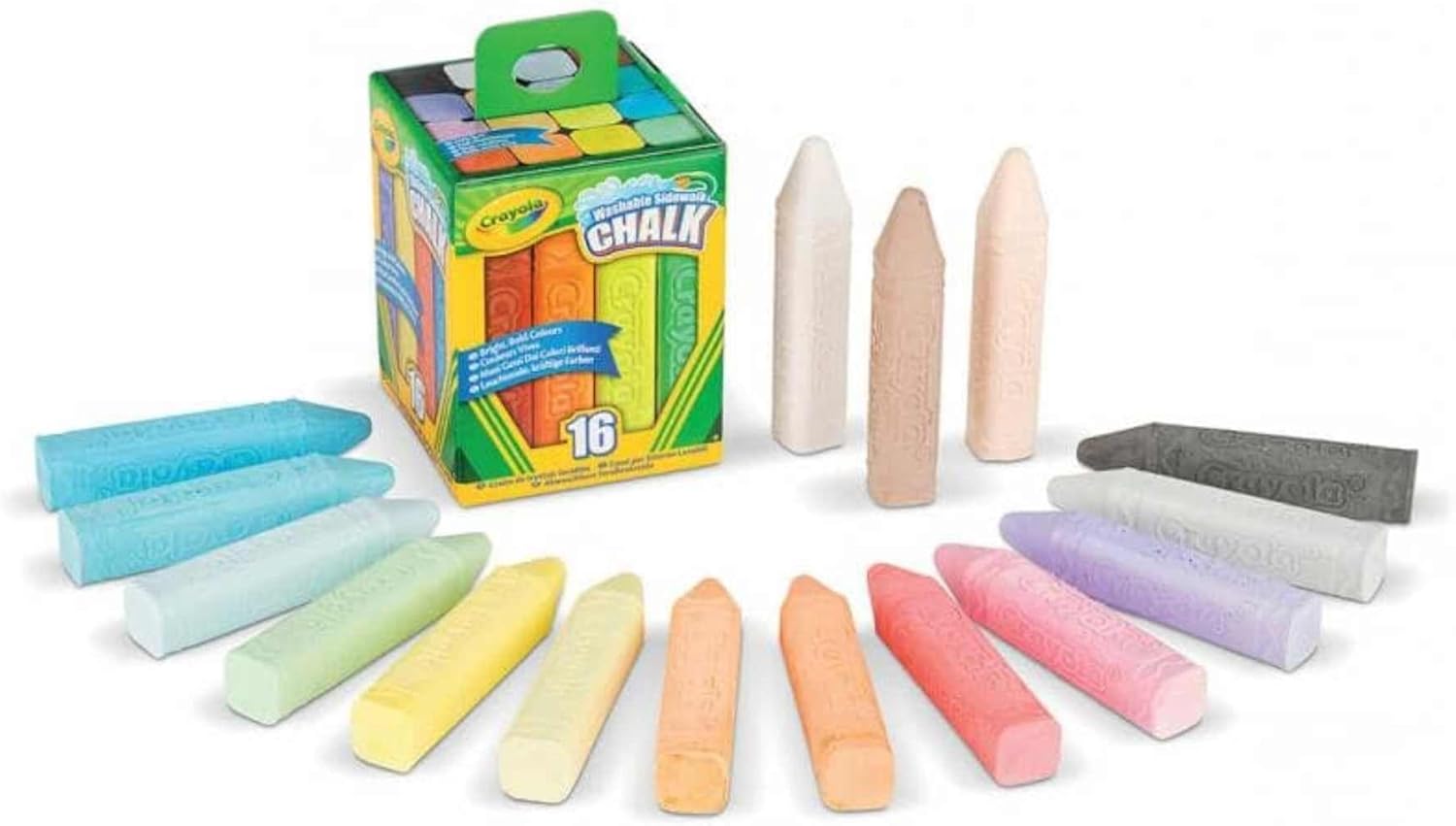 Perfetto per le attività in aula e di gruppo Crea grande arte all'aperto su marciapiedi e vialetti in esclusivi colori Crayola Lavabile, spruzzare con acqua La forma anti-rotolo mantiene i bastoncini a portata di mano senza rotolare Confezione da 3 totale 48