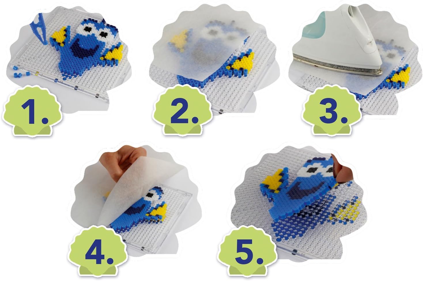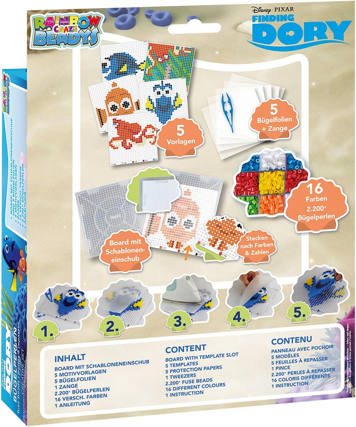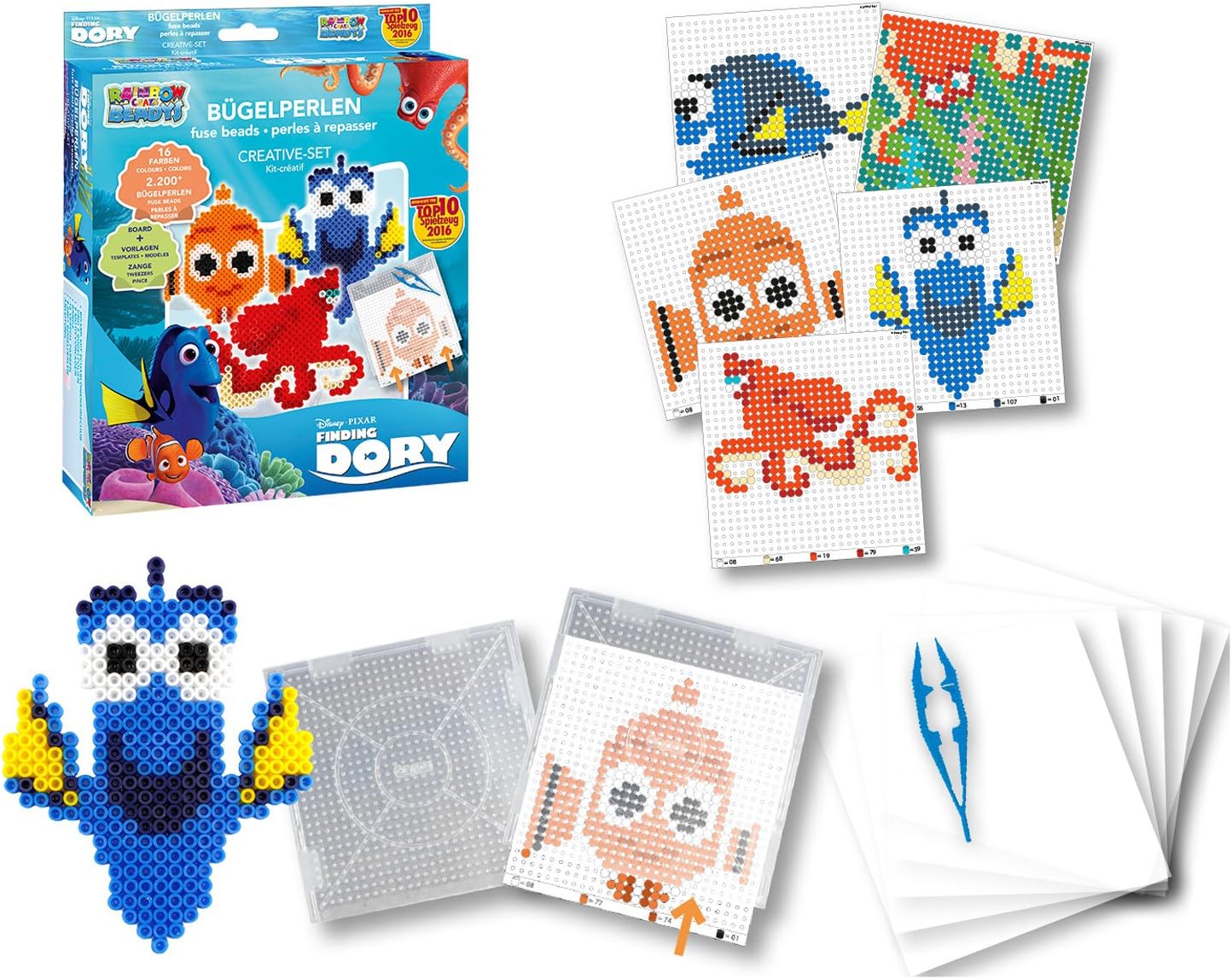 Rainbow beadys Set creativo Motivo: Disney Pixar si dorie Contenuto: ca. 2.200 perline 1 San Bernardo con stencil vassoio 15 x 15 cm, motivo 5 stencil, 2 pellicole stiro 20 x 20 cm e 1 pinza in plastica Età consigliata: a partire dai 3 anni