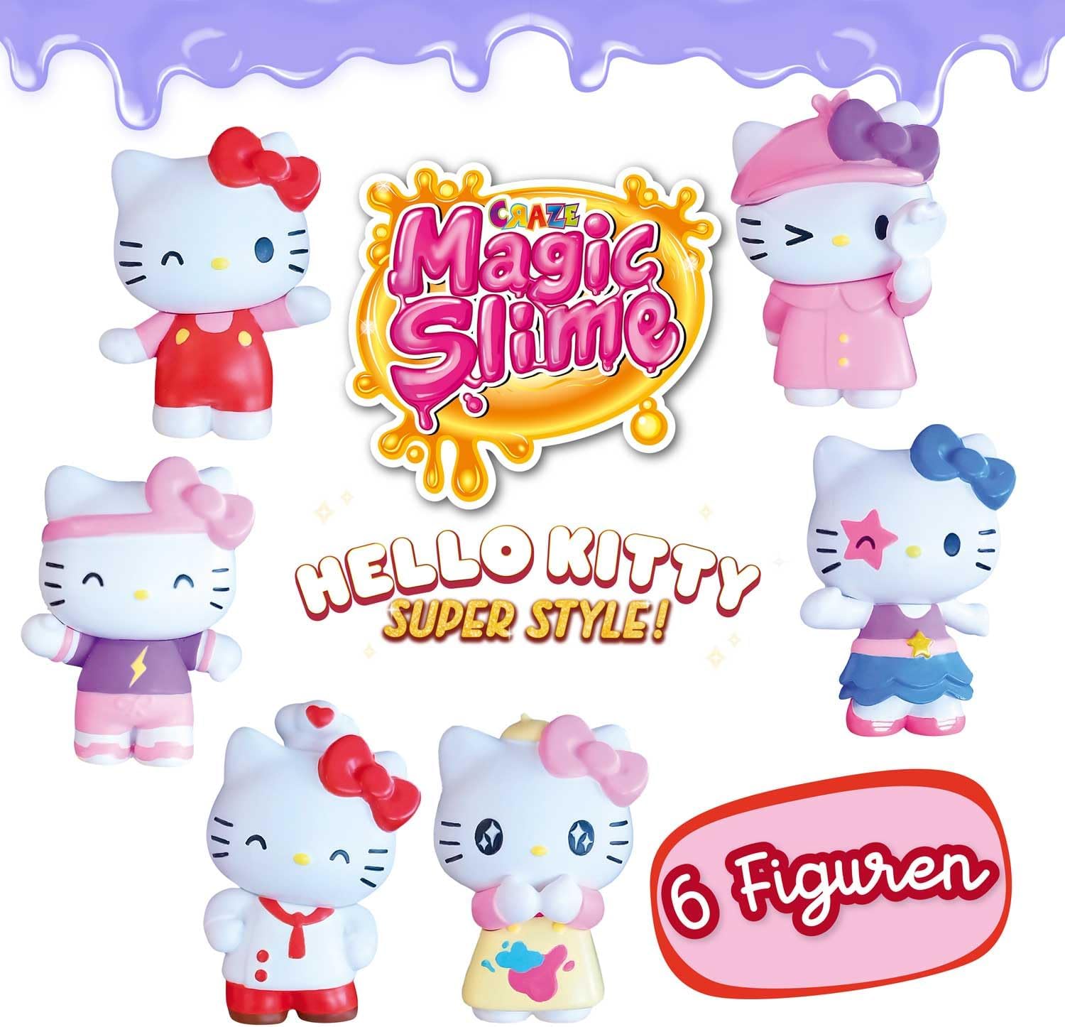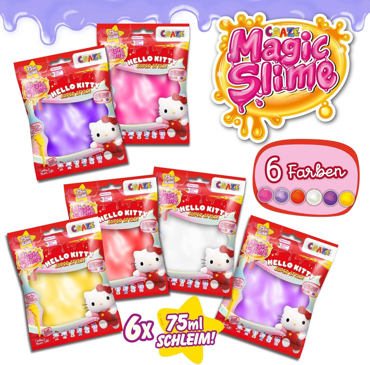 MAGIC SLIME di CRAZE ti porta nel magico mondo di HELLO KITTY - All'interno di ogni sacchetto di slime per bambini c'è una delle nostre meravigliose figurine per bambini di HELLO KITTY Texture: questo morbido slime può essere tirato, spremuto, impastato o puoi semplicemente guardarlo sciogliersi e gocciolare. Questo slime è ideale per i bambini: il nostro slime è il più colorato e divertente! CONTENUTO: 6 buste da 75 ml di slime magico per bambini con un giocattolo sorpresa Hello Kitty in espositore; La borsa a sorpresa MAGIC SLIME è disponibile in 6 colori diversi, tutti fantastici e abbinati alla statuetta di Hello Kitty nascosta all'interno. MAGIC SLIME ZIP BAG: il favoloso e divertente slime per bambini è ora disponibile in una fresca busta richiudibile con zip, ideale da portare con te senza che si secchi! NOTA: se lo slime è troppo liquido, versa l'acqua colorata in un piatto abbastanza grande e lascialo asciugare per una notte! FORMULA TESTATA: Craze Magic Slime è realizzato con una formula tedesca al 100%, senza tossine o ingredienti pericolosi per i bambini. Completamente sicuro da usare. Controlliamo regolarmente la nostra produzione per garantire che la nostra pasta di slime non contenga BPA, bisfenolo A o glutine.