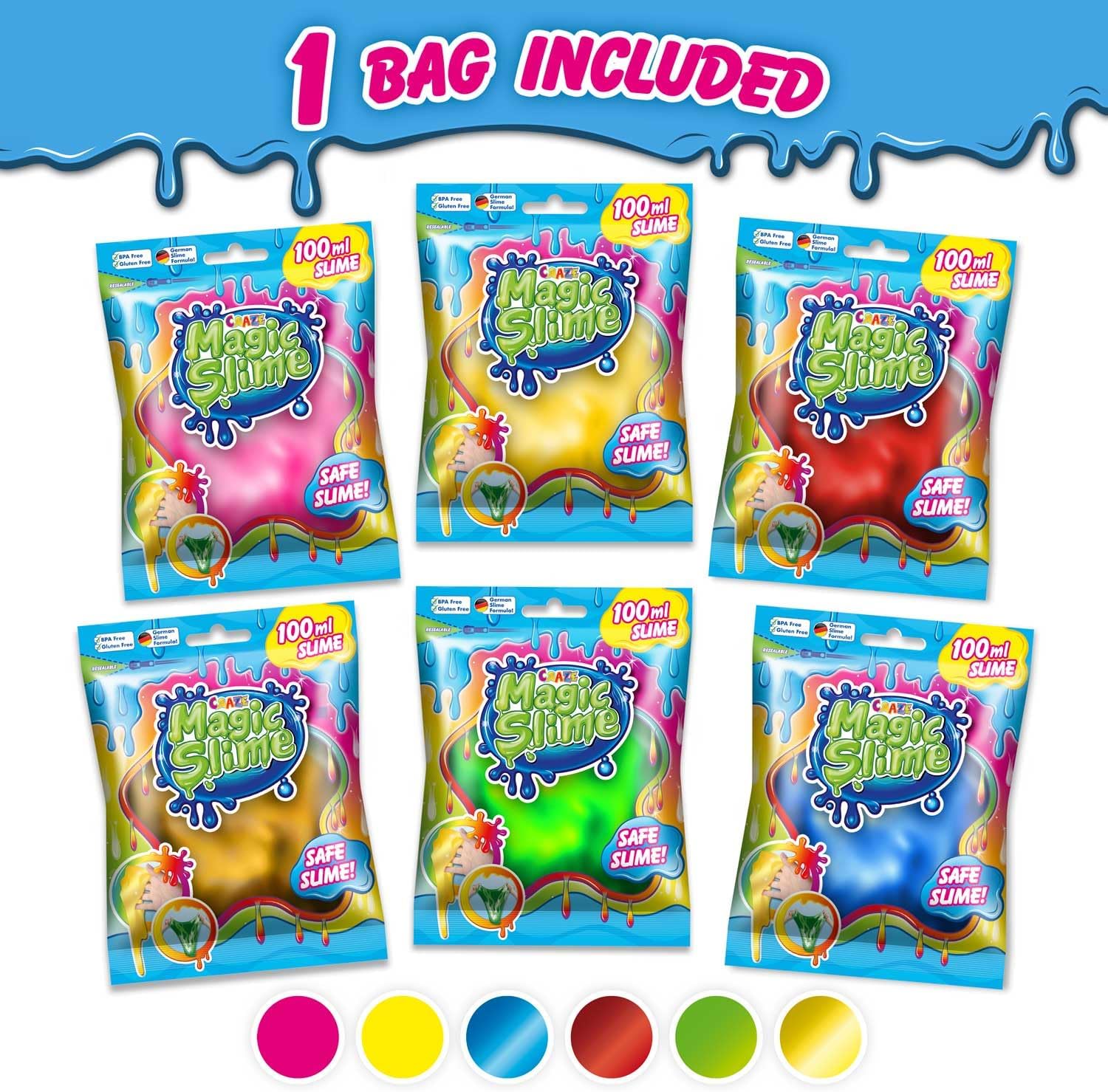 MAGIC SLIME BAG: il favoloso e divertente slime è ora disponibile in una versione trasportabile. 6 colori disponibili: scelta del colore impossibile, lasciatevi sorprendere e collezionare tutti! Consistenza: questa morbida melma può essere tirata, spremuta, impastata, oppure si può semplicemente guardare sciogliere e gocciolare fuori. Questa melma è ideale per i bambini: la nostra melma è la più colorata e divertente! Per un gioco creativo: il nostro patate slime incoraggia la creatività e la scoperta di nuove trame! La consistenza appiccicosa del nostro slime bambino ha anche una funzione lenitiva e antistress per i bambini che adoreranno impastarlo all'infinito. MAGIC SLIME ZIP BAG: il favoloso e divertente slime per bambini è ora disponibile in un sacchetto fresco con cerniera richiudibile, ideale da portare con te senza che si asciughi. NOTA: Se la melma è troppo liquida, versare l'acqua colorata in un piatto abbastanza grande e lasciare asciugare tutta la notte! FORMULA TESTATA: Il Craze Magic Slime è composto da una formula tedesca al 100%, senza tossine o ingredienti pericolosi per i bambini. Completamente sicuro da usare. Controlliamo regolarmente la nostra produzione per garantire che il nostro patè slime non contenga BPA, Bisfenolo A, glutine.