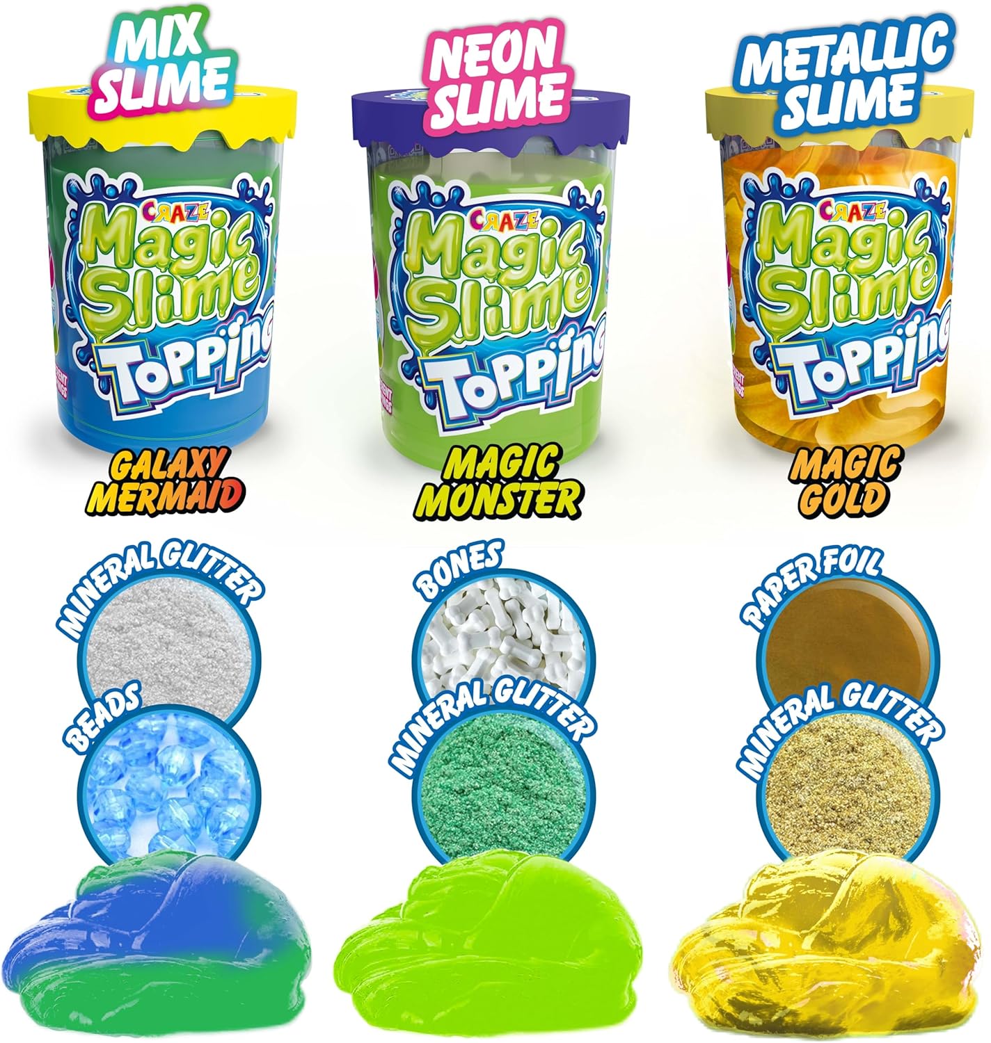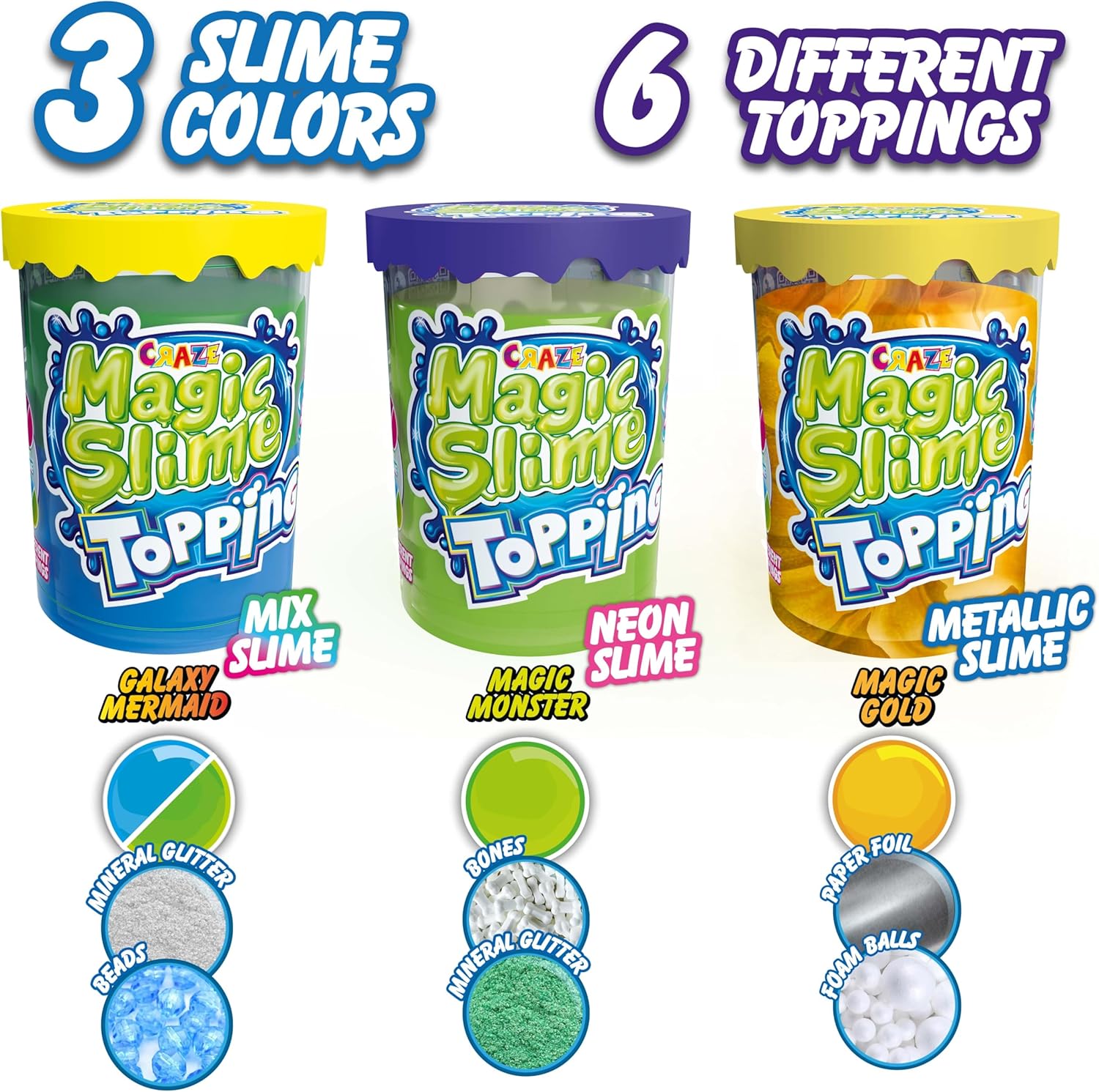MAGIC SLIME: il favoloso e divertente slime è ora disponibile in una versione ancora migliore da mescolare e trasportare. Ogni barattolo include 2 toppings, uno con glitter e uno con diversi elementi per mescolare e personalizzare il tuo Slime. Contenuto:3 barattoli di Magic Slime Topping. Ogni flacone include 70 ml di Slime e 2 toppings per miscelare. È disponibile in 6 diversi colori, riceverai diversi colori di ogni colore. Magic SLIME – Noi di CRAZE cerchiamo di offrire ai più piccoli giocattoli divertenti e sicuri. Il Magic Slime Toppings è realizzato secondo la formula tedesca. Privo di tossine e ingredienti dannosi per i bambini. I nostri slim sono sicuri. Testiamo ogni produzione per garantire che i nostri slimes siano privi di BPA o Bisfenolo A, o glutine. Visita il nostro negozio su Amazon e scopri tutti i nostri prodotti. Silme Durable – Dopo aver giocato a Slime Magic Topings, riporta il tuo Magic SLIME nella barca dove viene, così manterrà la sua consistenza. Nel caso in cui si desidera uno Slime meno liquido può versarlo in un piatto sufficientemente grande e lasciarlo asciugare per il tempo necessario per raggiungere la consistenza desiderata OTTIMO PER UN REGALO: il nostro slime magico è perfetto per un regalo di compleanno, dettaglio del topolino Perez... i bambini adoreranno sperimentare con lo slime e scoprire e mescolare le diverse trame.