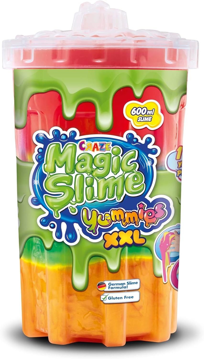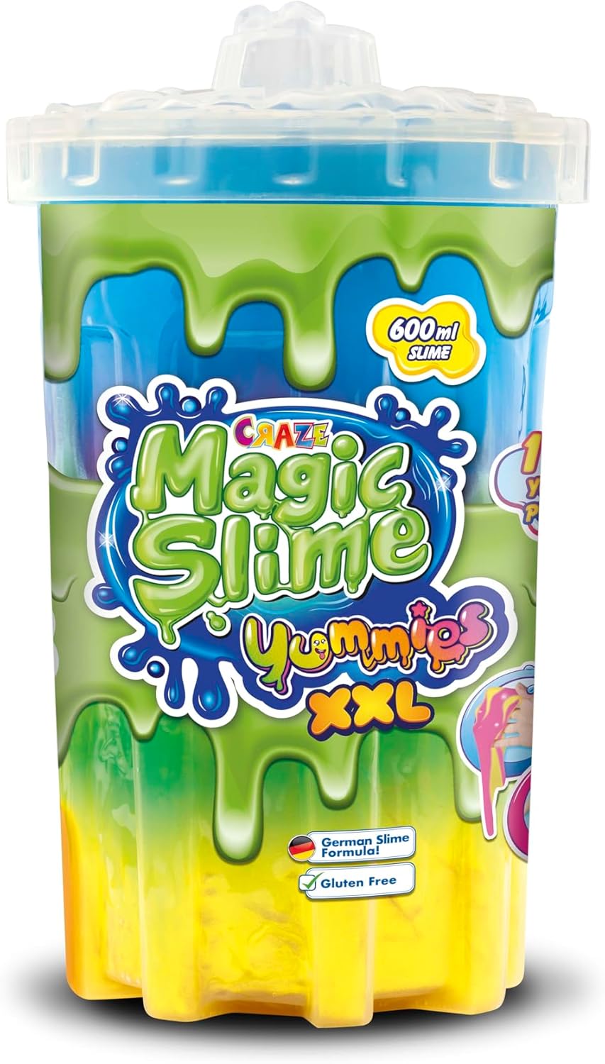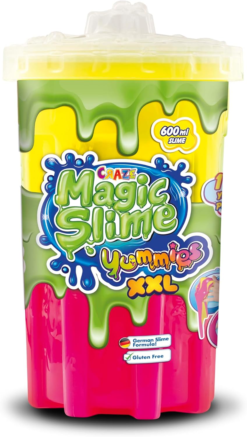 Preparatevi all'ultima avventura di slime con l'eccitante MAGIC SLIME - Yummies : Ogni barattolo contiene 600 ml di slime in un mix di 2 colori diversi - Divertitevi con i diversi personaggi a ventosa nascosti in ogni barattolo: Burggie, Ghetti, Tortoy e Rabi CRAZE MAGIC SLIME: questo slime soffice è perfetto per essere tirato, spremuto, schiacciato o semplicemente guardato mentre si scioglie e cola. La melma più colorata e divertente per i bambini! CREATIVO E SENSORIALE: il coloratissimo slime per bambini di CRAZE incoraggia la stimolazione sensoriale e offre lo spazio di gioco perfetto per un'esperienza sensoriale olistica che stimola i sensi del tatto, dell'olfatto e della vista. CONTENUTO : 600 ml di slime confezionati in un barattolo con un divertente design a secchiello per mantenere più a lungo la consistenza appiccicosa dello slime + 1 nuova tettarella per slime - 4 diverse combinazioni di colori di slime e 4 diversi personaggi (non è possibile effettuare una preselezione) FORMULA: lo slime per bambini CRAZE è realizzato secondo una formula tedesca ed è privo di tossine e ingredienti pericolosi per i bambini; sicuro da usare, inodore, senza BPA e senza glutine.
