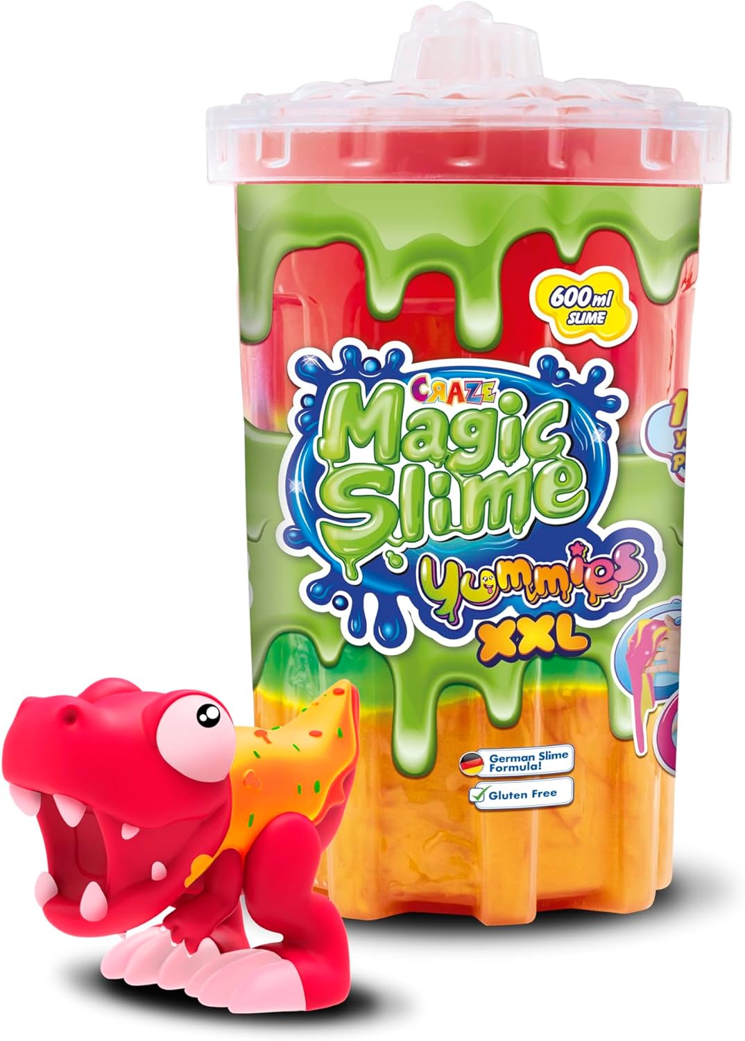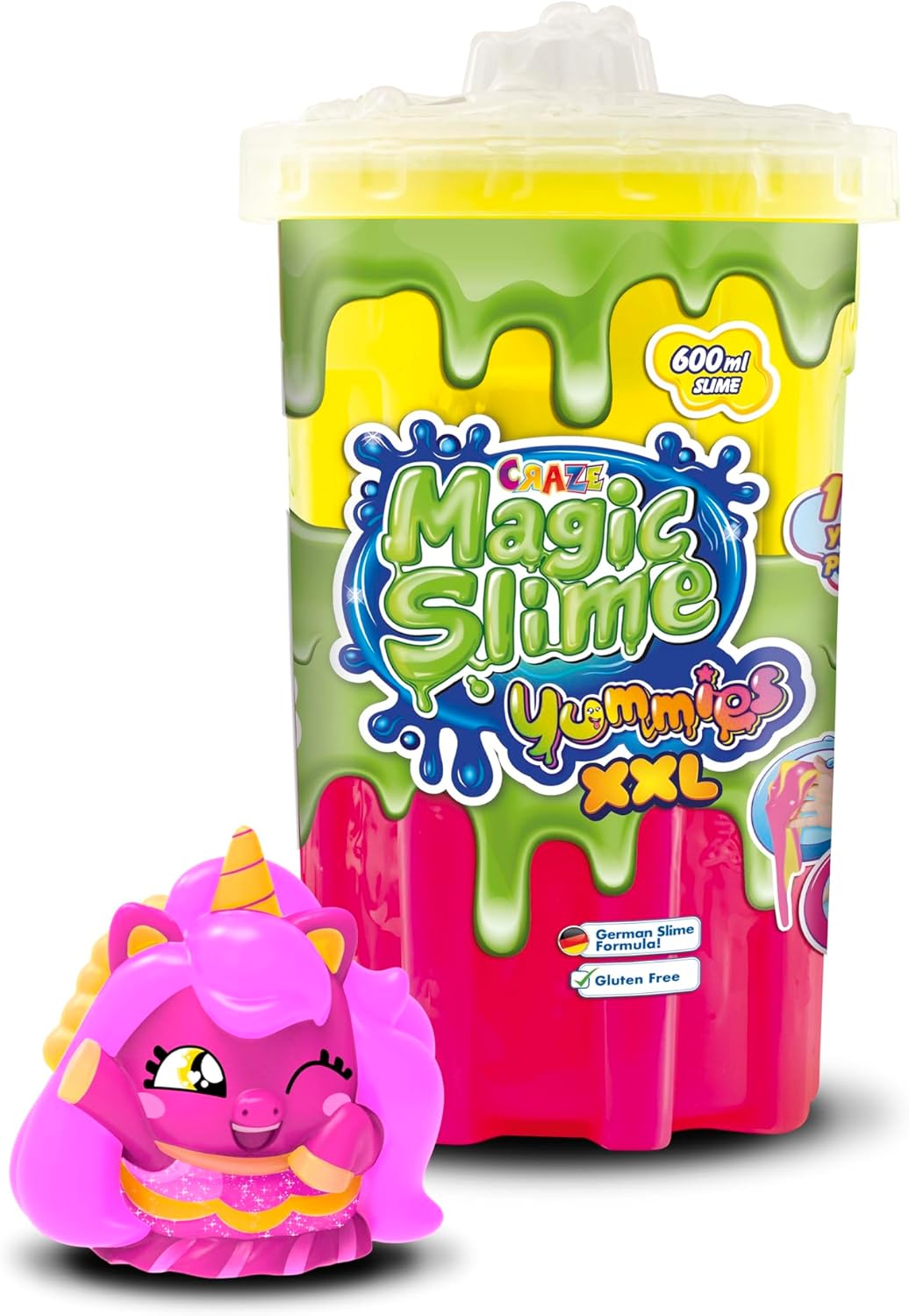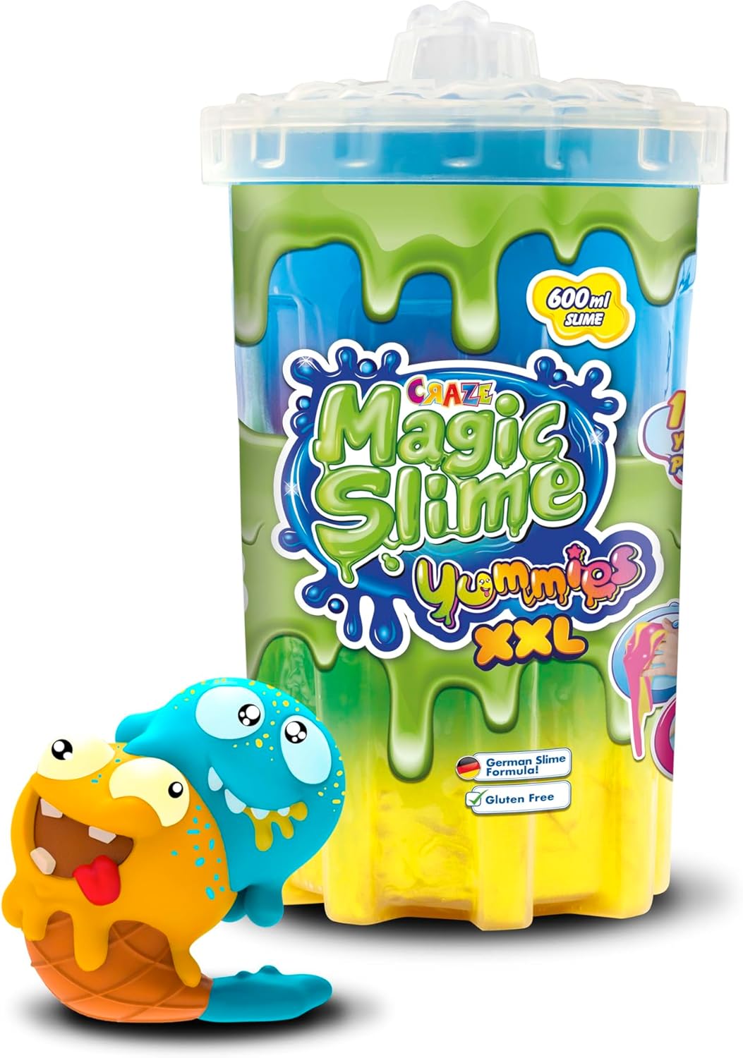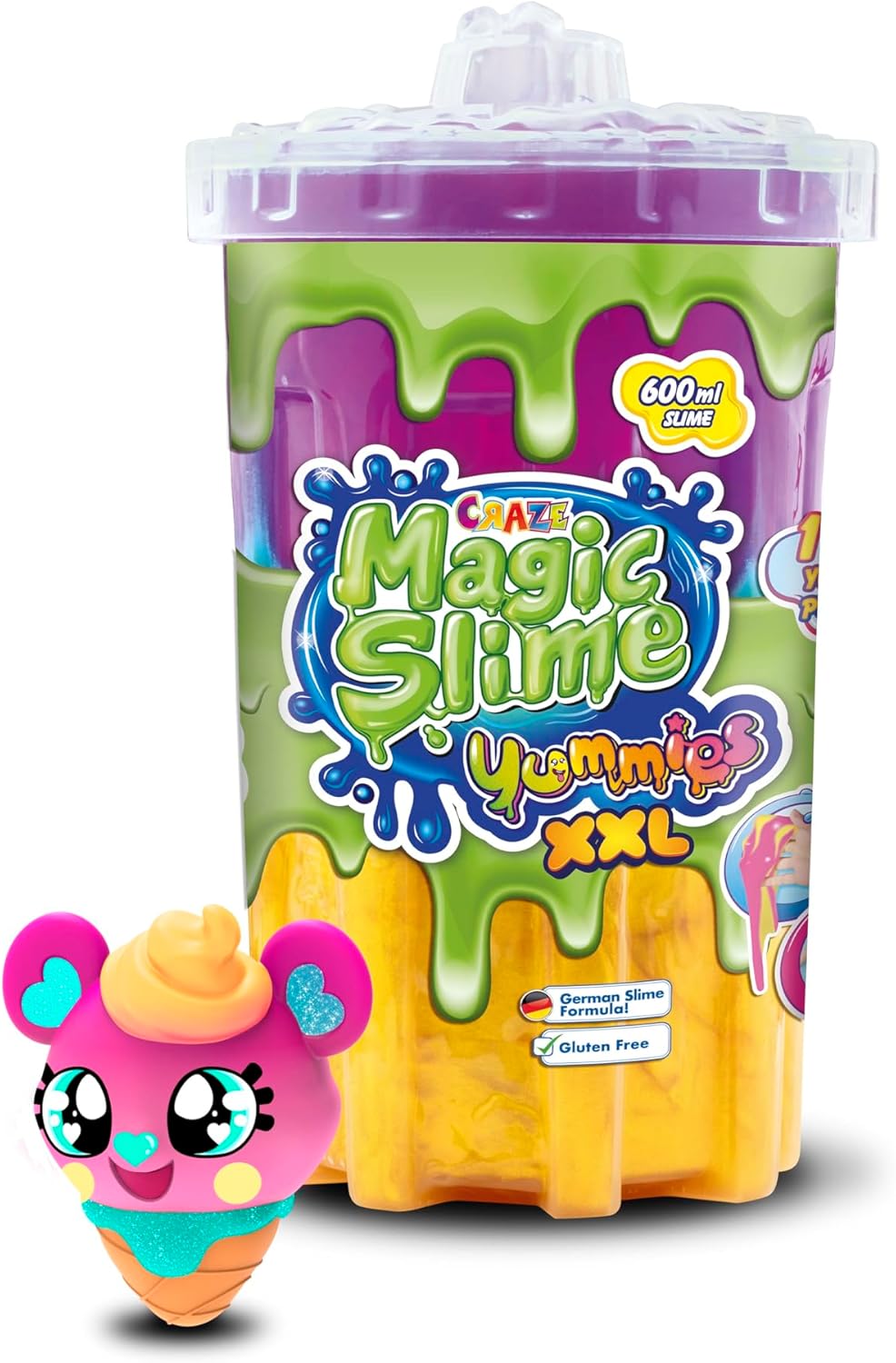 Preparatevi all'ultima avventura di slime con l'eccitante MAGIC SLIME - Yummies : Ogni barattolo contiene 600 ml di slime in un mix di 2 colori diversi - Divertitevi con i diversi personaggi a ventosa nascosti in ogni barattolo: Burggie, Ghetti, Tortoy e Rabi CRAZE MAGIC SLIME: questo slime soffice è perfetto per essere tirato, spremuto, schiacciato o semplicemente guardato mentre si scioglie e cola. La melma più colorata e divertente per i bambini! CREATIVO E SENSORIALE: il coloratissimo slime per bambini di CRAZE incoraggia la stimolazione sensoriale e offre lo spazio di gioco perfetto per un'esperienza sensoriale olistica che stimola i sensi del tatto, dell'olfatto e della vista. CONTENUTO : 600 ml di slime confezionati in un barattolo con un divertente design a secchiello per mantenere più a lungo la consistenza appiccicosa dello slime + 1 nuova tettarella per slime - 4 diverse combinazioni di colori di slime e 4 diversi personaggi (non è possibile effettuare una preselezione) FORMULA: lo slime per bambini CRAZE è realizzato secondo una formula tedesca ed è privo di tossine e ingredienti pericolosi per i bambini; sicuro da usare, inodore, senza BPA e senza glutine.