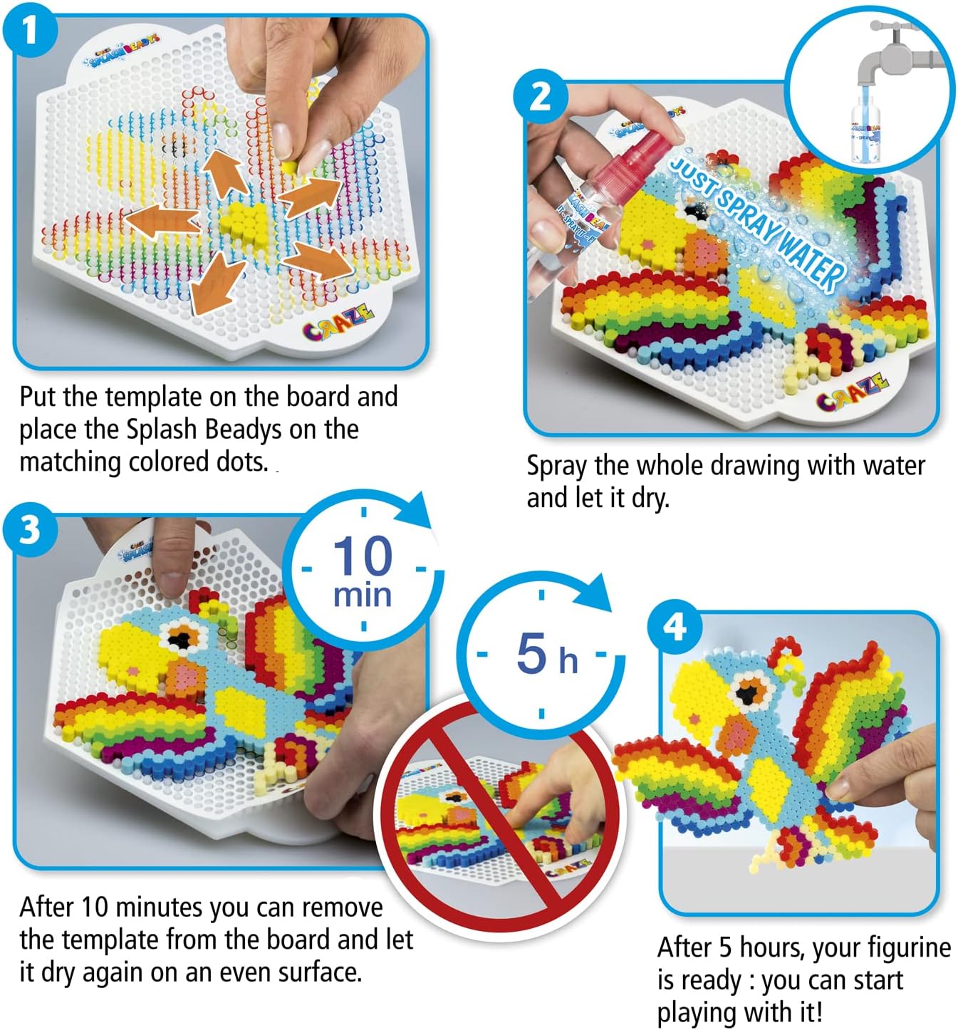 Le prime perle da stiro che non devi più stirare Kit fai da te per bambini: le prime perle da stiro che non necessitano di stiratura! Le perle d'acqua CRAZE SPLASH BEADYS funzionano senza aggiungere calore: incolla semplicemente le perline dall'interno verso l'esterno sul modello del tuo modello preferito - spruzza con acqua - lascia asciugare - stacca il modello finito dalla tavola - ed ecco fatto, tutto ciò che resta da fare è divertirti con il tuo nuovo giocattolo! Promuove la fiducia in se stessi e la creatività: con lo starter kit di perline di colla CRAZE SPLASH BEADYS, gli artisti in erba ora possono progettare da soli bellissimi disegni e dare libero sfogo alla loro creatività. A differenza delle classiche perline da stiro, con le perline CRAZE SPLASH BEADYS i bambini possono completare i disegni in autonomia. Divertimento perfetto per ragazze e ragazzi - Ovviamente in qualità premium CRAZE Perle d'acqua per bambini atossiche di qualità premium CRAZE e con un bellissimo design colorato. Il materiale utilizzato per le nostre perle è assolutamente atossico e di grado alimentare, oltre che vegano e senza glutine. È approvato come additivo farmaceutico e viene utilizzato nei rivestimenti di pillole/compresse. La sicurezza del tuo bambino è molto importante per noi, ecco perché i nostri prodotti vengono messi alla prova.