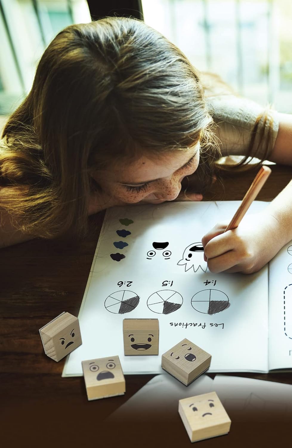 Un supporto all'attività didattica degli insegnanti e che permetterà ai bambini di esprimere le proprie emozioni. Può anche essere utilizzato dai genitori per insegnare ai propri figli le emozioni in modo divertente. 12 timbri in legno serigrafati rappresentanti emozioni (serenità, gioia, tristezza, amore, orgoglio, disgusto, rabbia, dolore, felicità, paura, stupore e fatica). Dimensioni dell'impronta circa 2,5 x 2,5 cm.