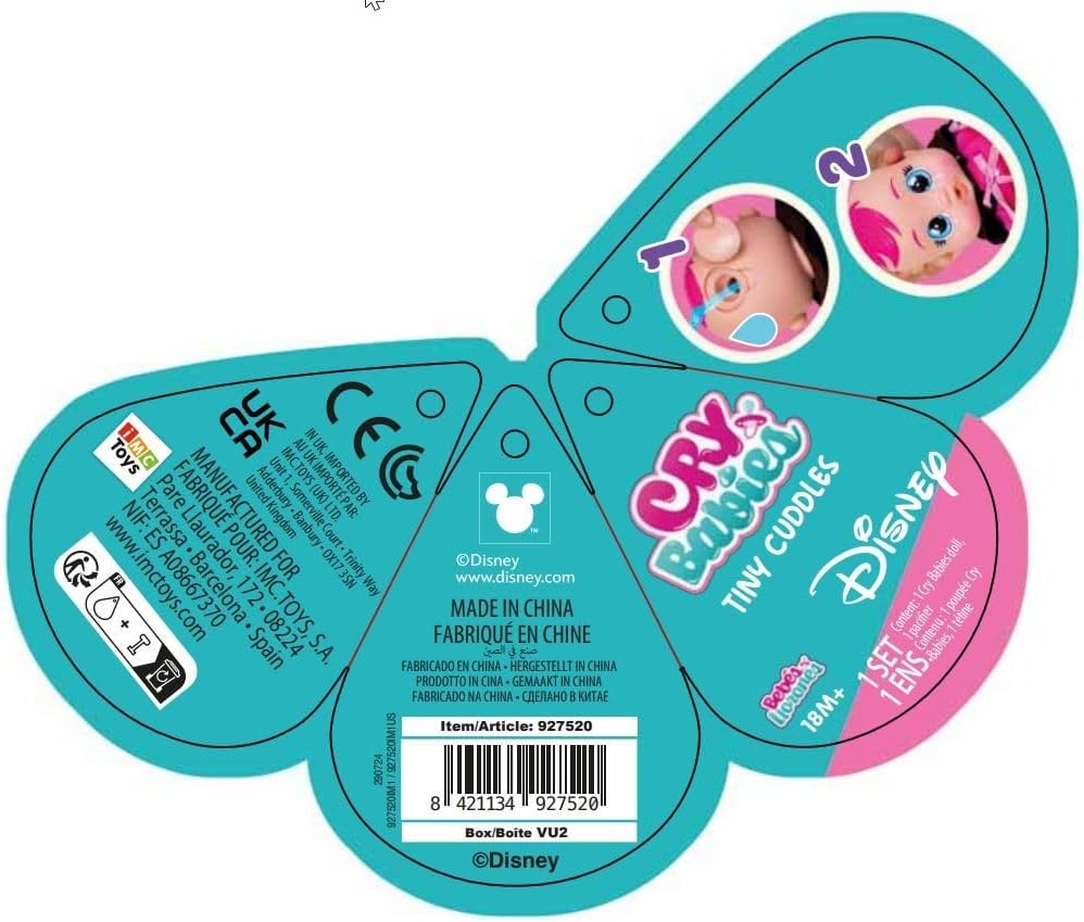 Bambola di peluche: Tiny Cuddles Angel è ispirata all'iconico personaggio Disney Angel di Lilo & Stitch Piange lacrime vere: Mettete dell'acqua nella testa, premete e piangerà lacrime vere Ispirato a Disney: Adorabile bambola peluche per bambini vestita con un comodo pigiama con cappuccio rimovibile Facile da portare con sè: Morbido e facile da portare con sè ovunque si vada Bambini di età superiore ai 18 mesi Le bambole Cry Babies accompagnano il tuo bambino/a lungo tutto il suo percorso di crescita con diverse funzioni, in un modo unico ed adorabile Vantaggi del gioco: Cry Babies offre un'ampia gamma di giochi di ruolo che aiutano i bambini a sviluppare molti valori e abilità come la cura, la condivisione, l'immaginazione e la narrazione di storie