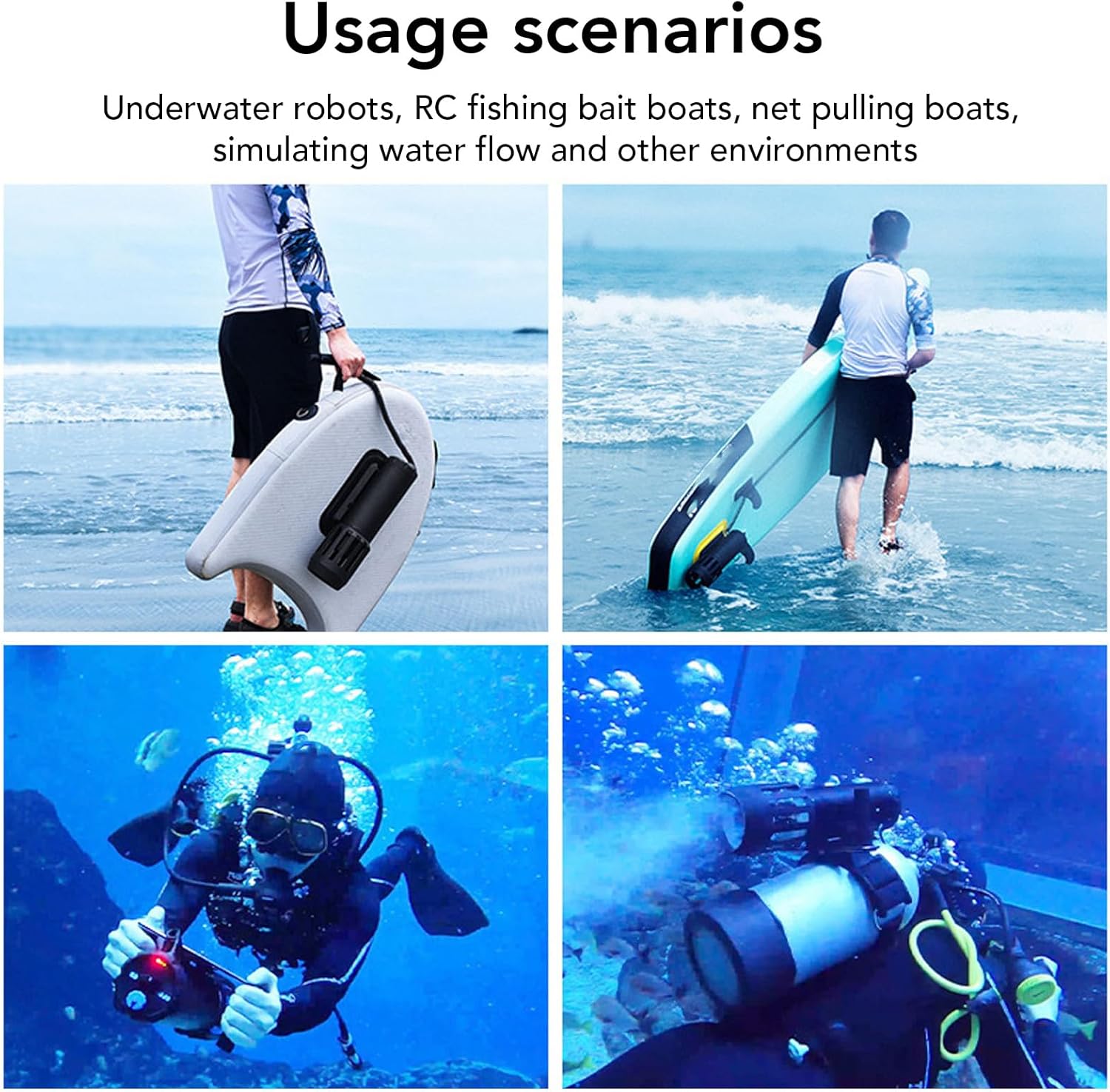 【Elica e ugello appositamente progettati】 L'elica e l'ugello sono appositamente progettati per una spinta efficace e potente e possono garantire una maggiore efficienza di lavoro. 【Struttura della cabina completamente sigillata】 La struttura del propulsore subacqueo adotta una struttura della cabina completamente sigillata, che isola il motore dall'acqua nell'ambiente esterno. 【Scenari di utilizzo】 Il propulsore subacqueo impermeabile è adatto per robot subacquei, barche da pesca telecomandate, barche da traino, simulazione del flusso d'acqua e altri ambienti. 【Impermeabile e affidabile】 L'elica subacquea è completamente impermeabile, consentendo un funzionamento sicuro ed efficace sott'acqua. La sua robusta guarnizione impedisce l'ingresso di acqua, garantendo affidabilità a lungo termine anche in ambienti subacquei impegnativi. 【Prestazioni elevate】 Il nostro propulsore subacqueo KYO 4T PRO è progettato per prestazioni eccezionali in ambienti sottomarini. Con il suo motore potente e il design efficiente, garantisce una guida fluida e affidabile per varie applicazioni.